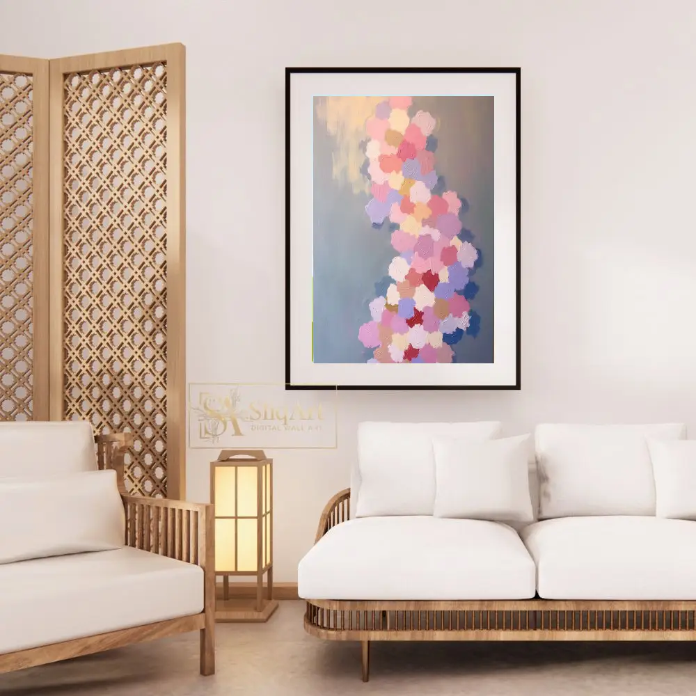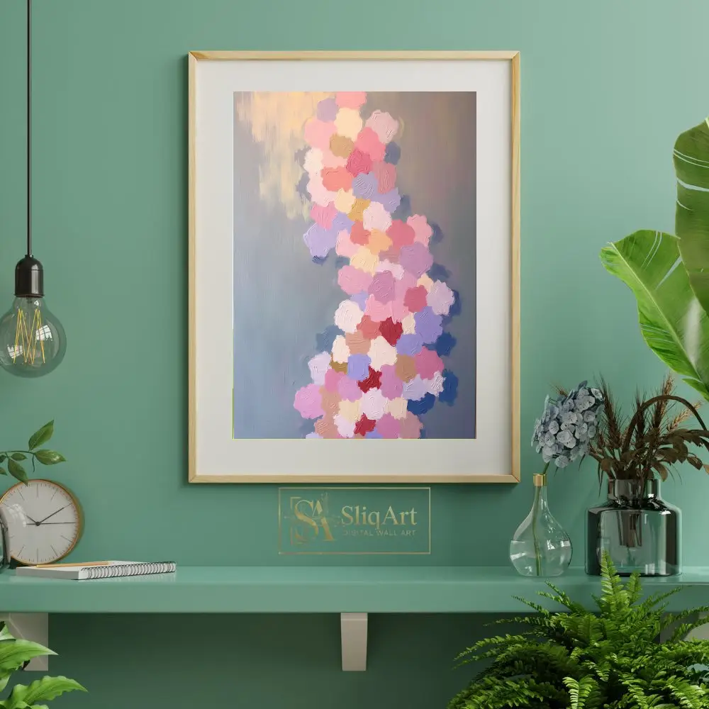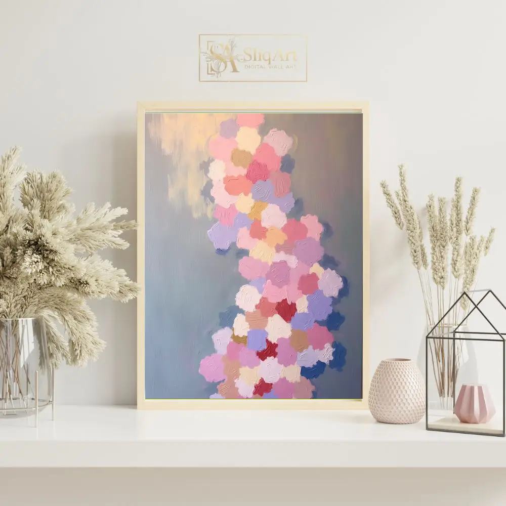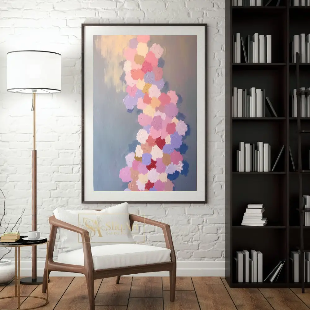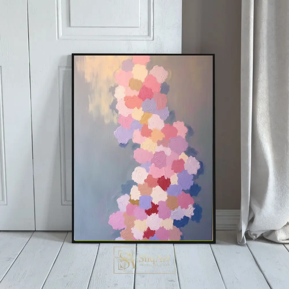Transform your space with this stunning impasto abstract painting, featuring a vibrant yet gentle cascade of textured brushstrokes. Each ‘petal’ of color—from soft dusty rose and lavender to warm peach and cream—is applied with thick, intentional texture that adds a tactile depth to the piece.