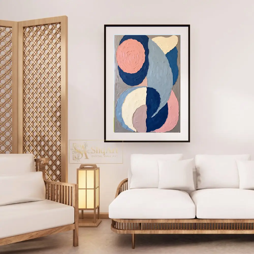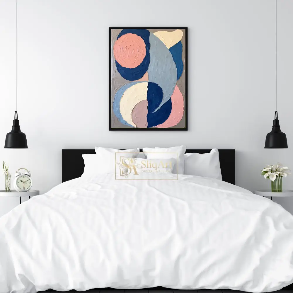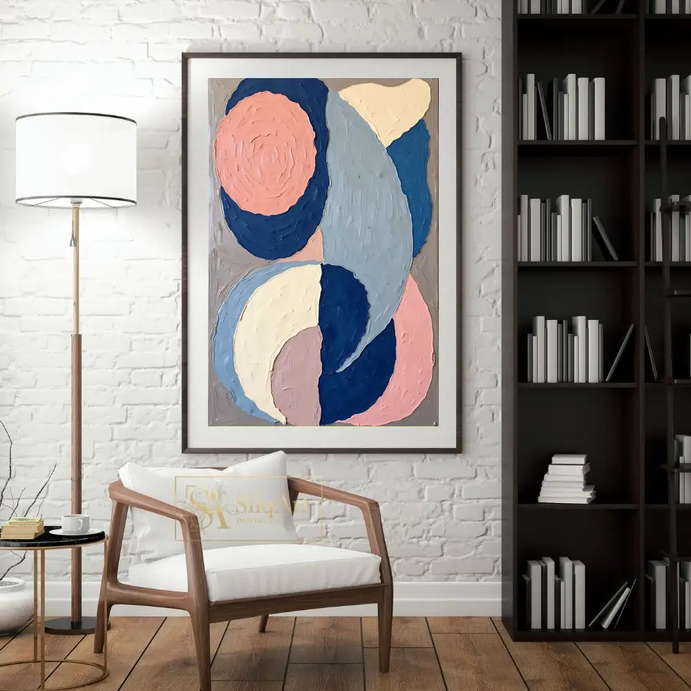 This captivating abstract piece features a series of overlapping organic and circular shapes rendered in a rich, heavy impasto style. The tactile texture of the paint adds significant depth and character to the composition, highlighting the interplay between deep navy blue, soft blush pink, and warm cream tones.