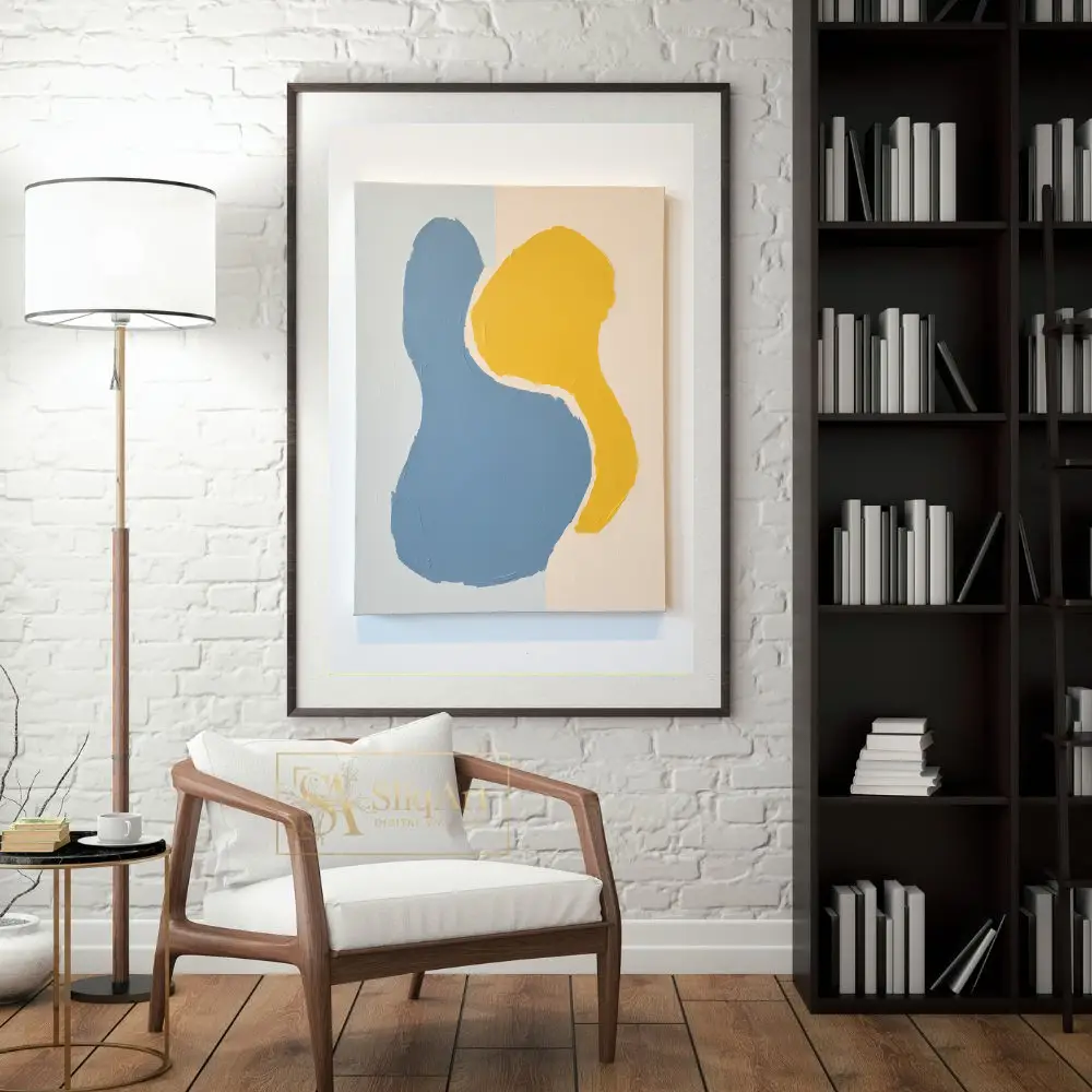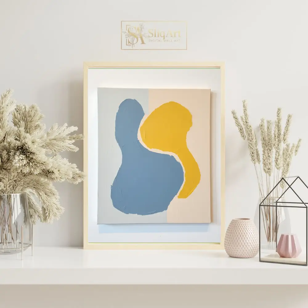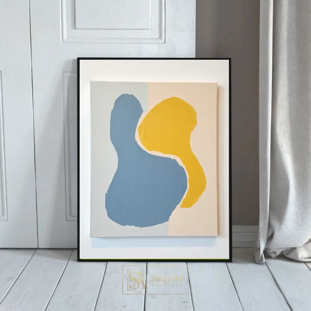This contemporary abstract piece features two interlocking organic forms that command attention through their simplicity and bold color contrast. Rendered in a soothing denim blue and a vibrant mustard yellow, the shapes are set against a subtle, multi-toned neutral background of beige and pale grey.