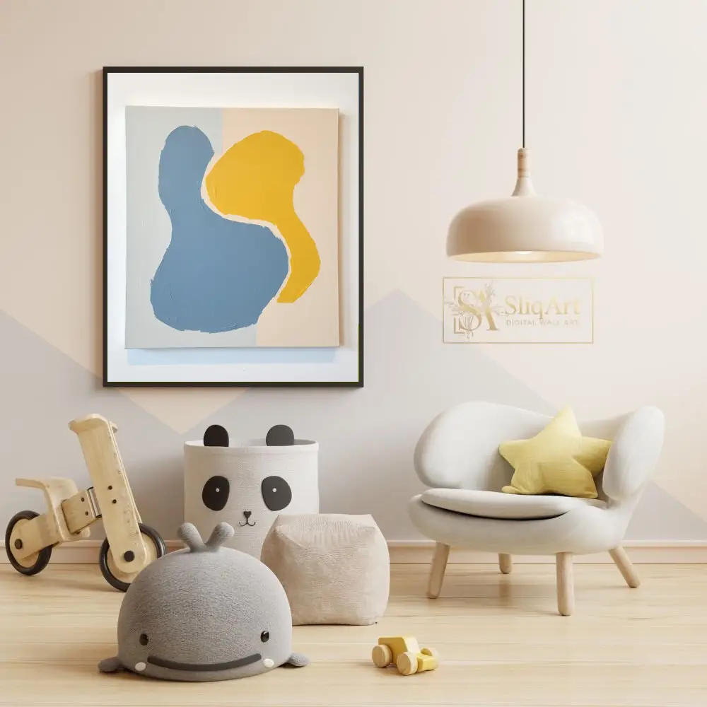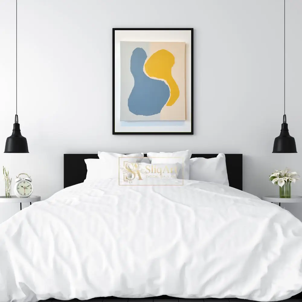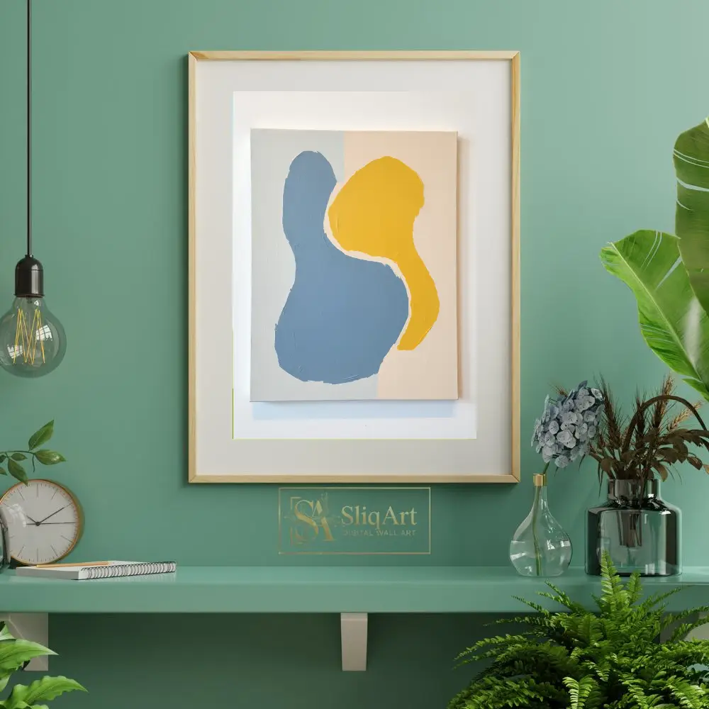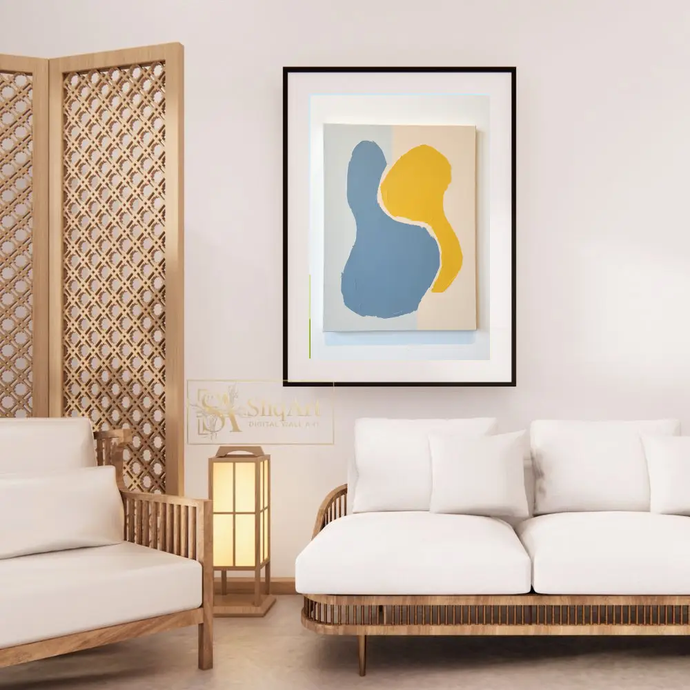 This contemporary abstract piece features two interlocking organic forms that command attention through their simplicity and bold color contrast. Rendered in a soothing denim blue and a vibrant mustard yellow, the shapes are set against a subtle, multi-toned neutral background of beige and pale grey.