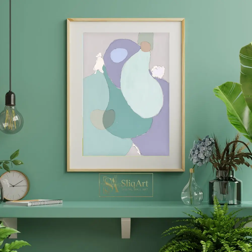 This stunning contemporary abstract piece features a collection of fluid, organic shapes layered in a soothing palette of lavender, mint green, and seafoam.