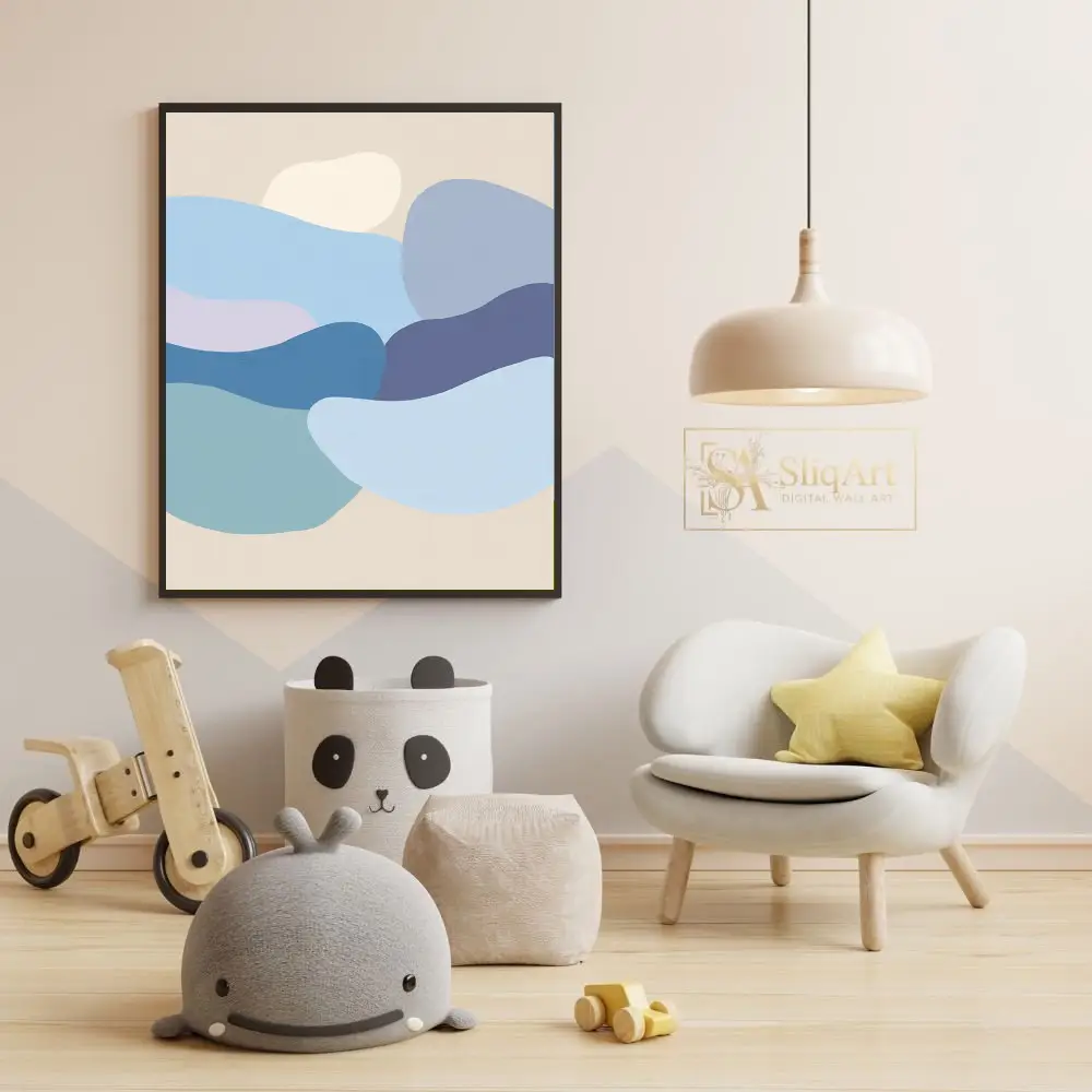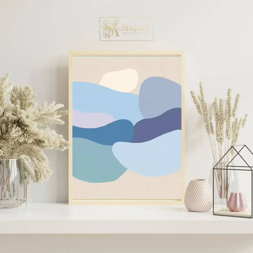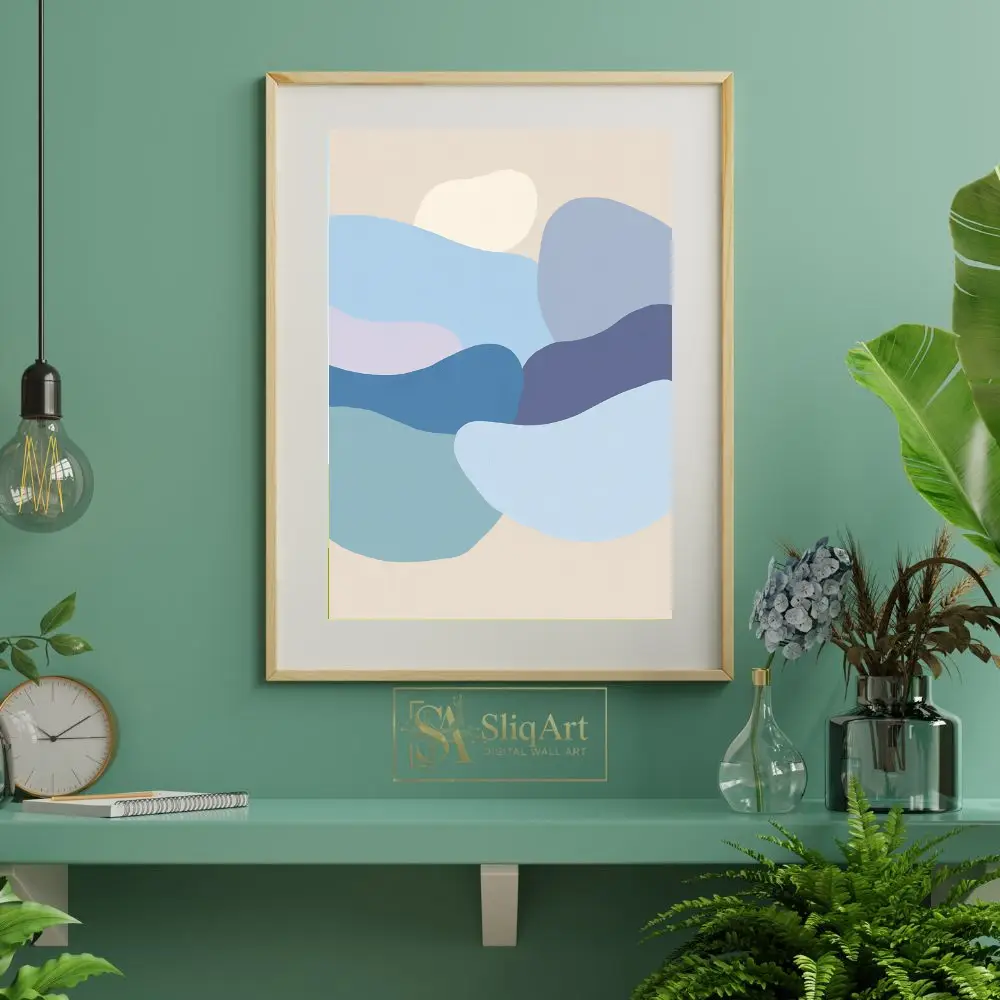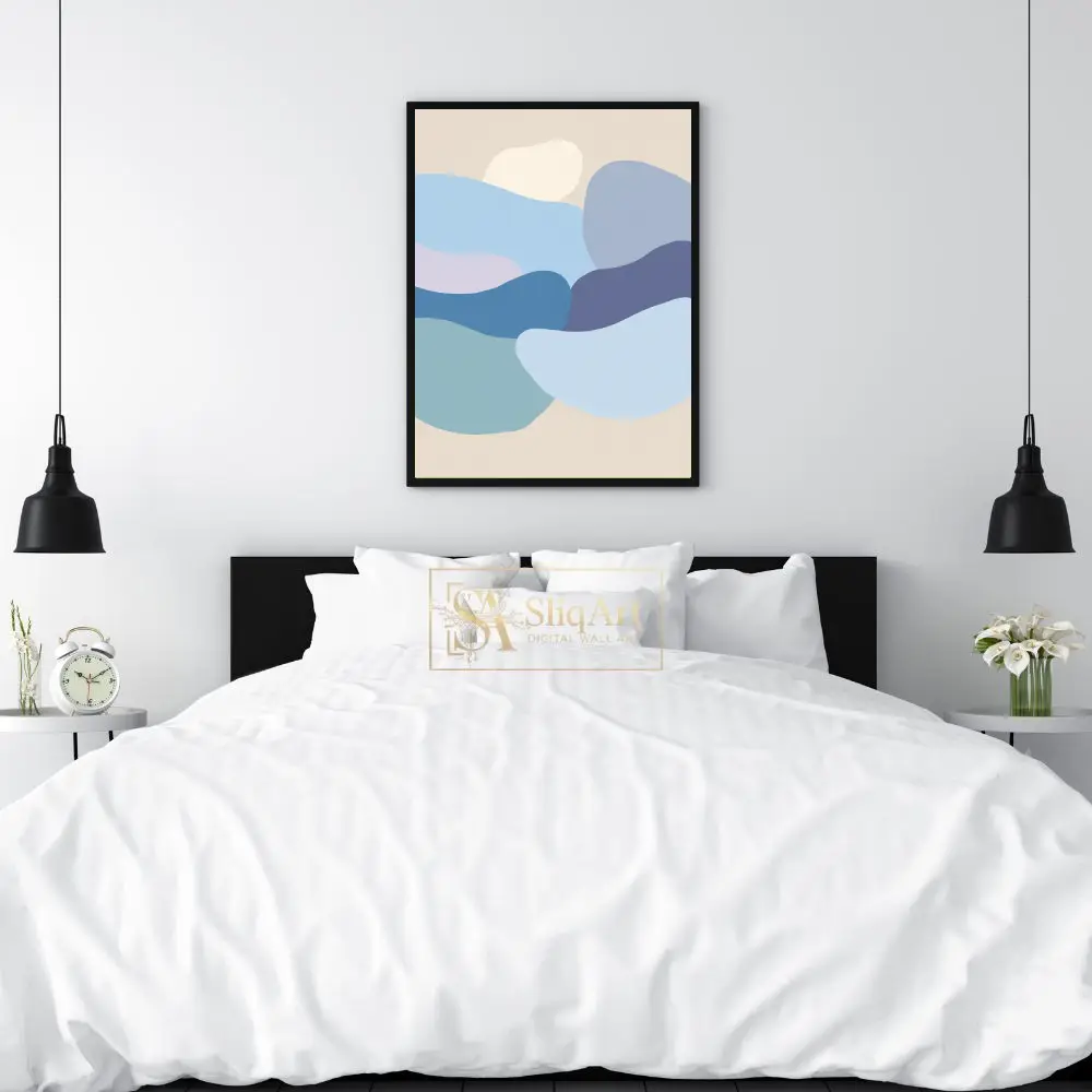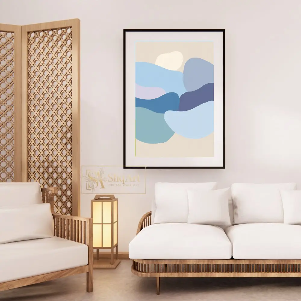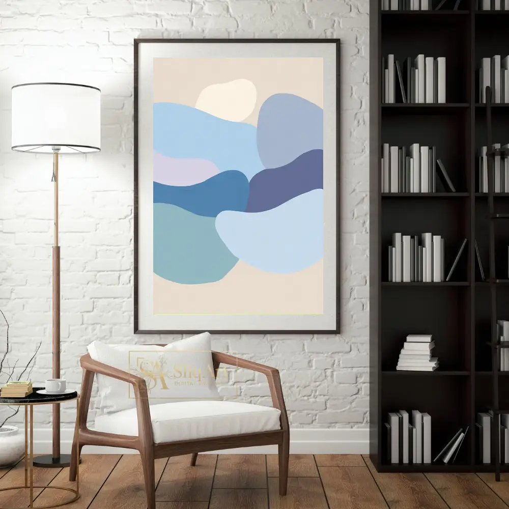 Featuring a collection of fluid, organic shapes in a sophisticated palette of dusty blues, soft lavender, and crisp cream, this piece balances modern design with a serene, natural feel. The subtle painterly texture and warm beige background provide a timeless quality, making it a versatile addition to any contemporary home looking to foster a sense of peace and balance.