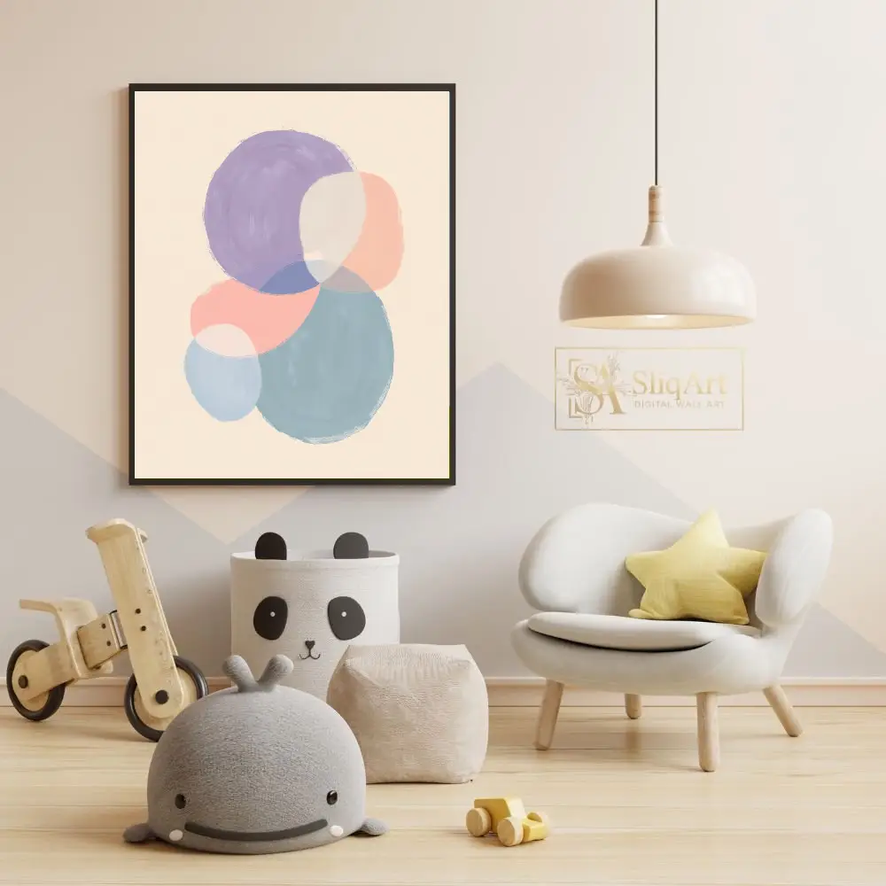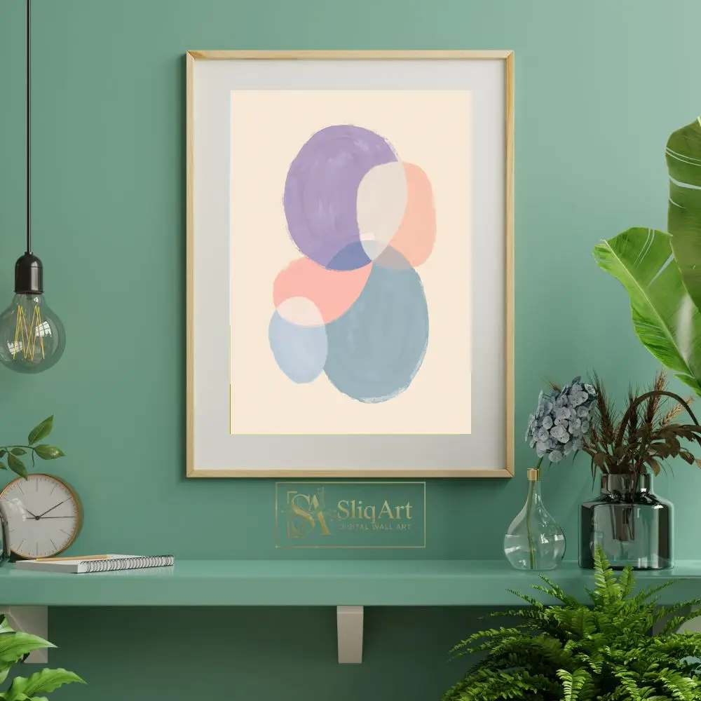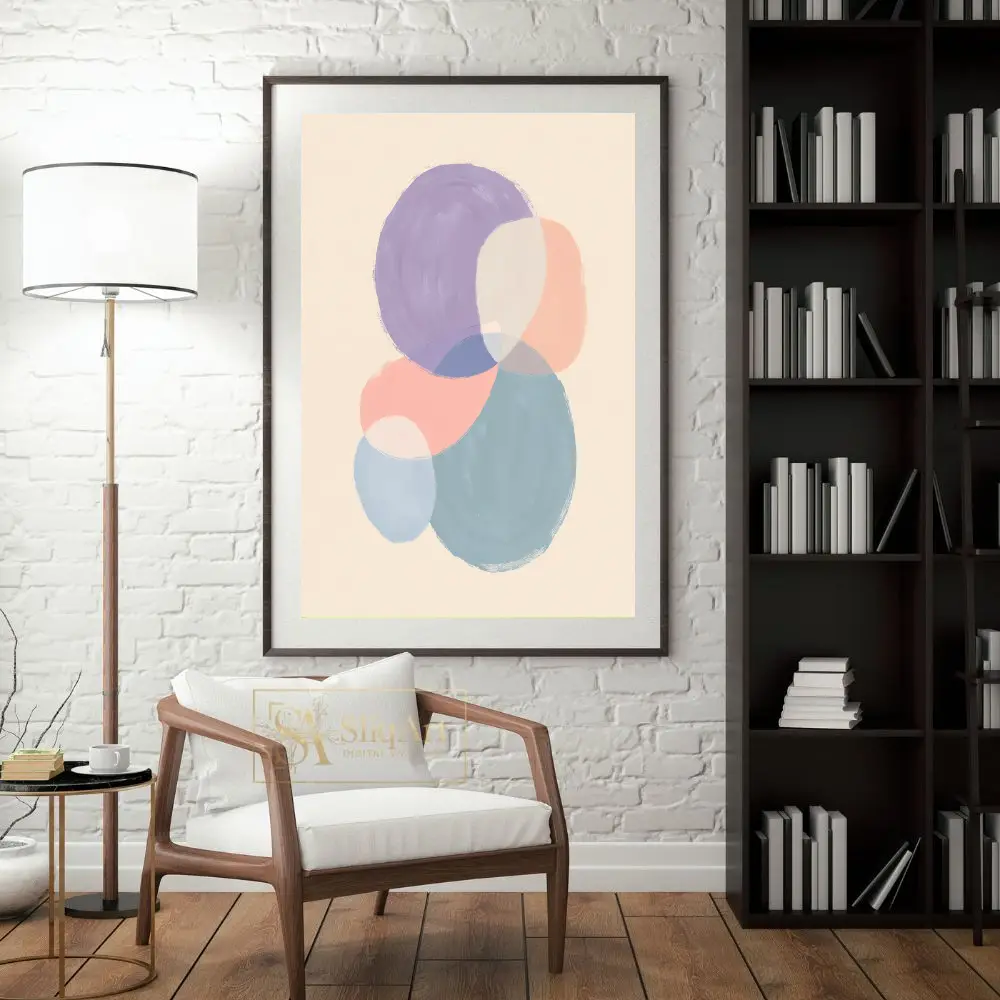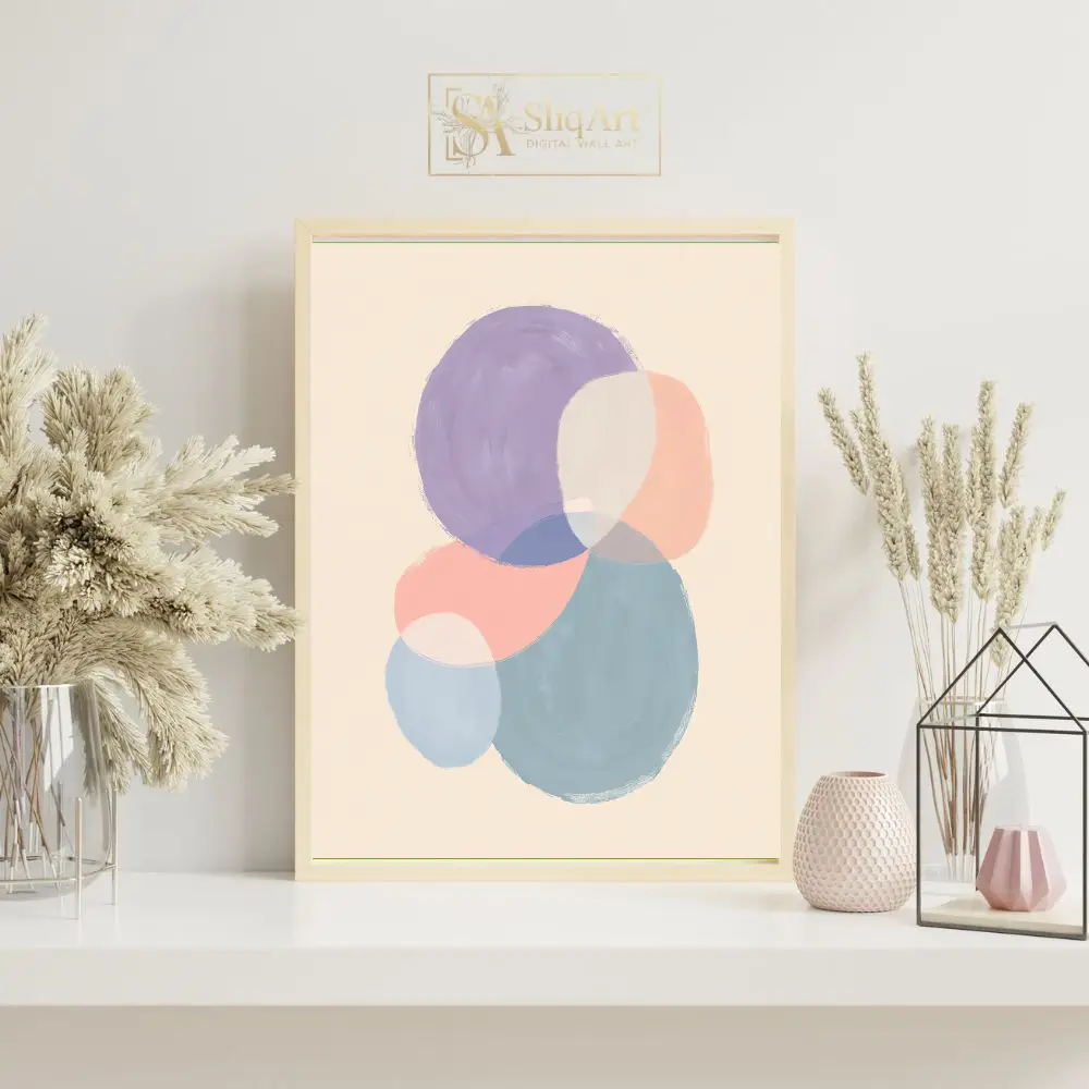 This captivating abstract piece features a delicate dance of overlapping circles in a soothing pastel palette of lavender, peach, and muted blue.