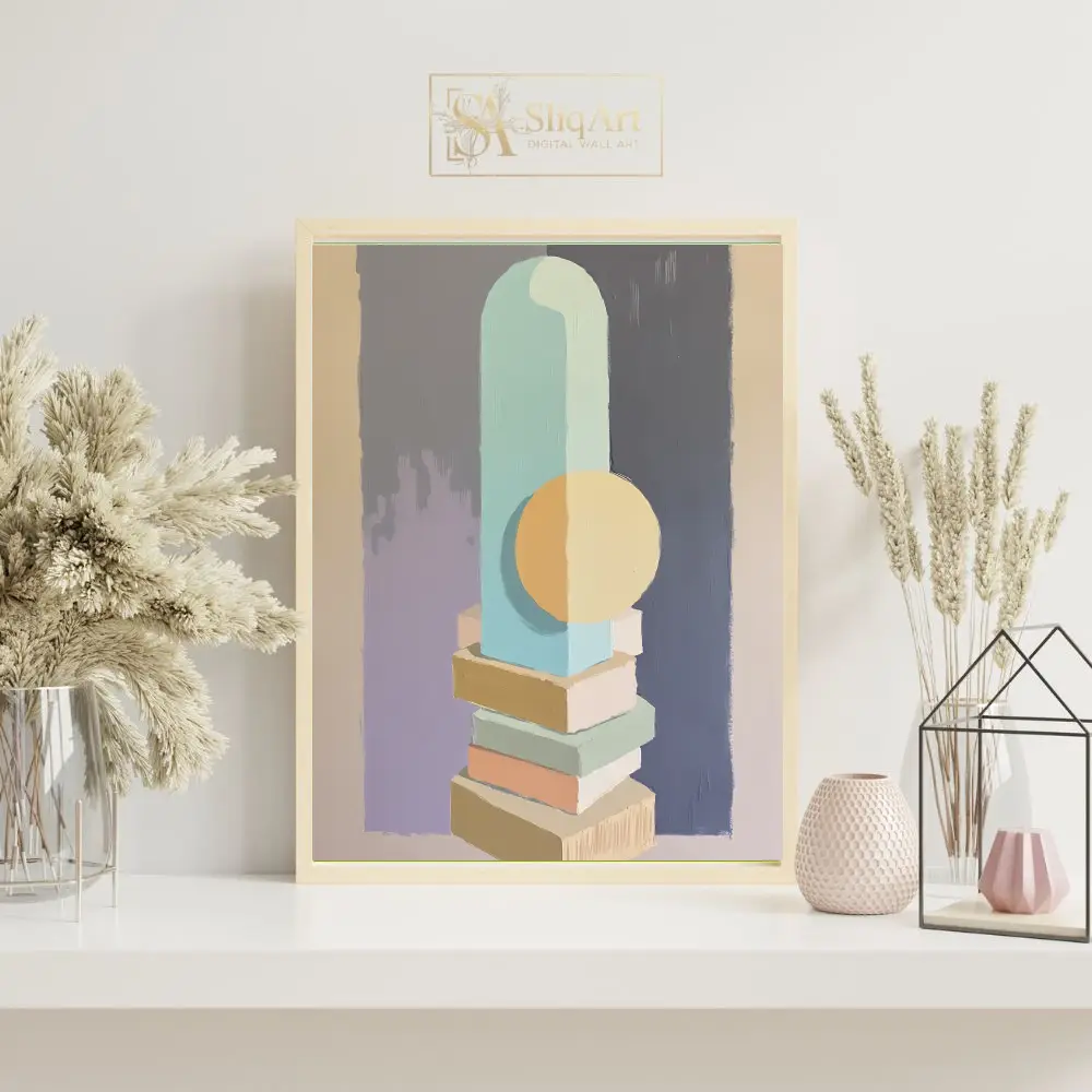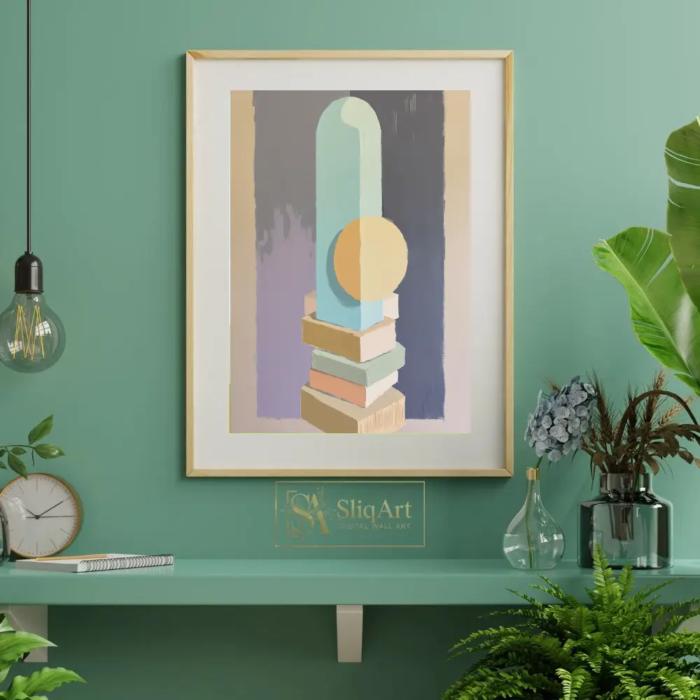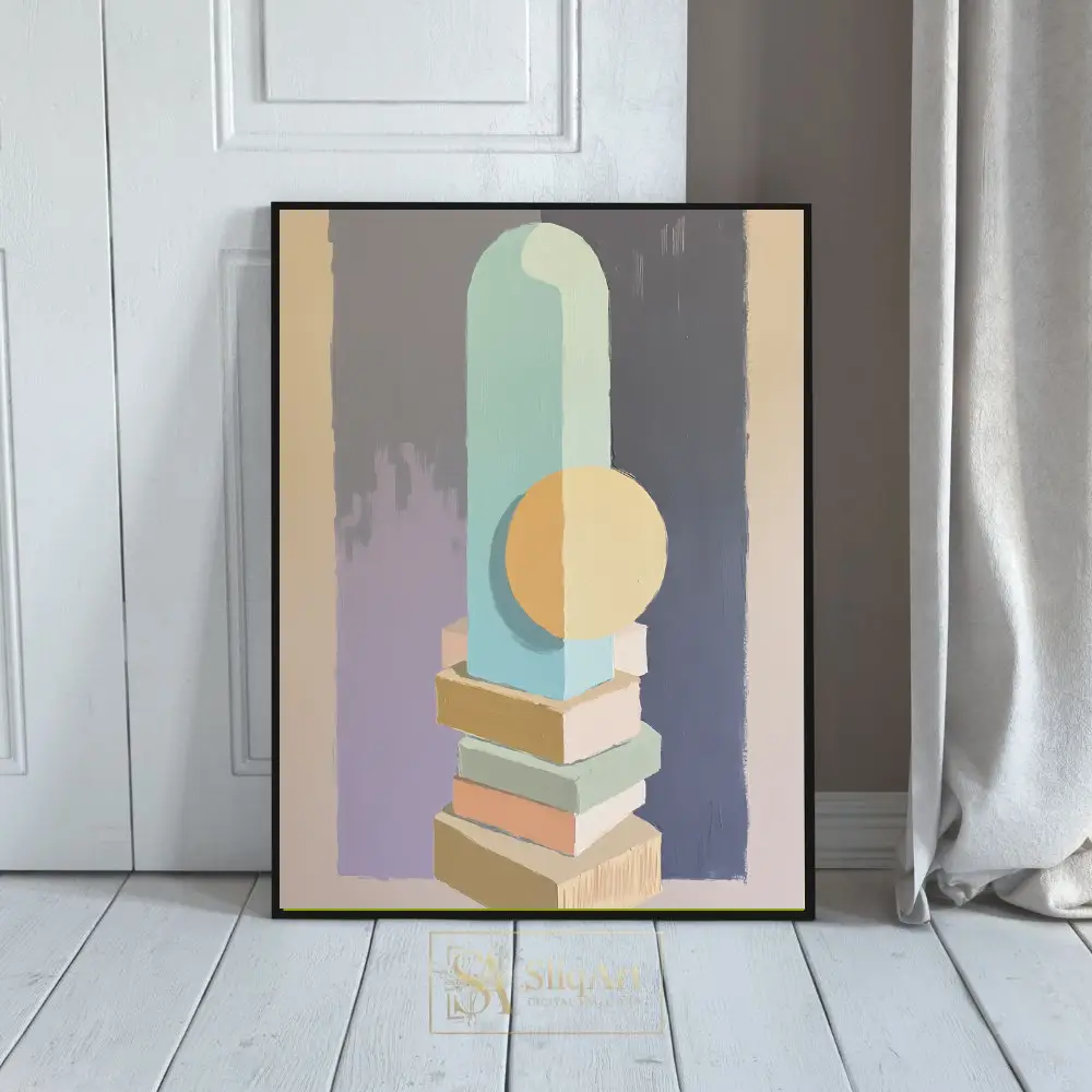Elevate your interior with this serene minimalist abstract painting featuring a balanced stack of geometric forms. The composition showcases a tall, soft-blue arched pillar centered amidst a series of rectangular blocks in earthy sage, peach, and lavender tones.
