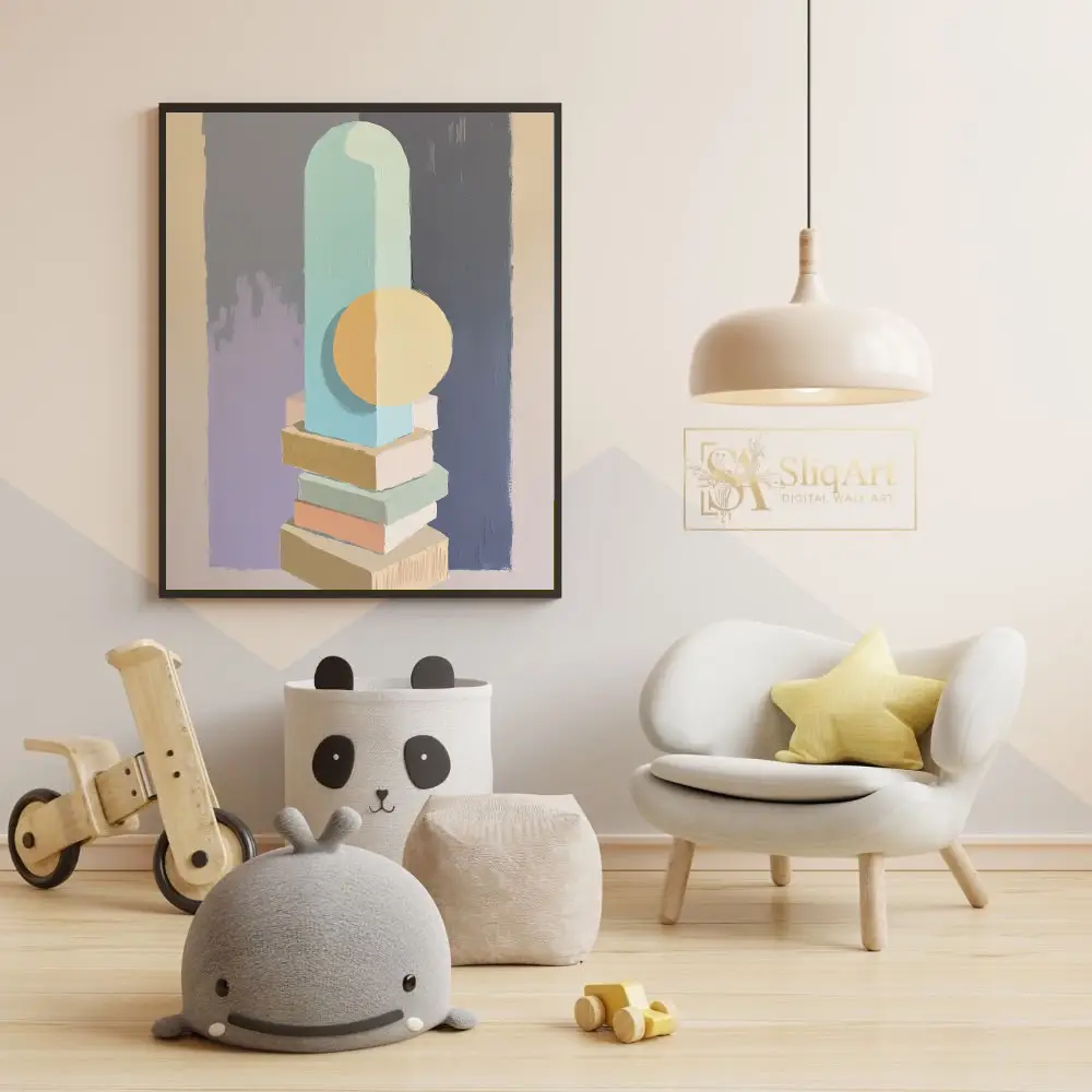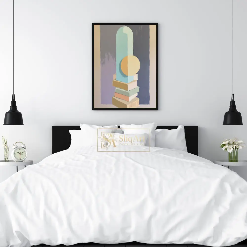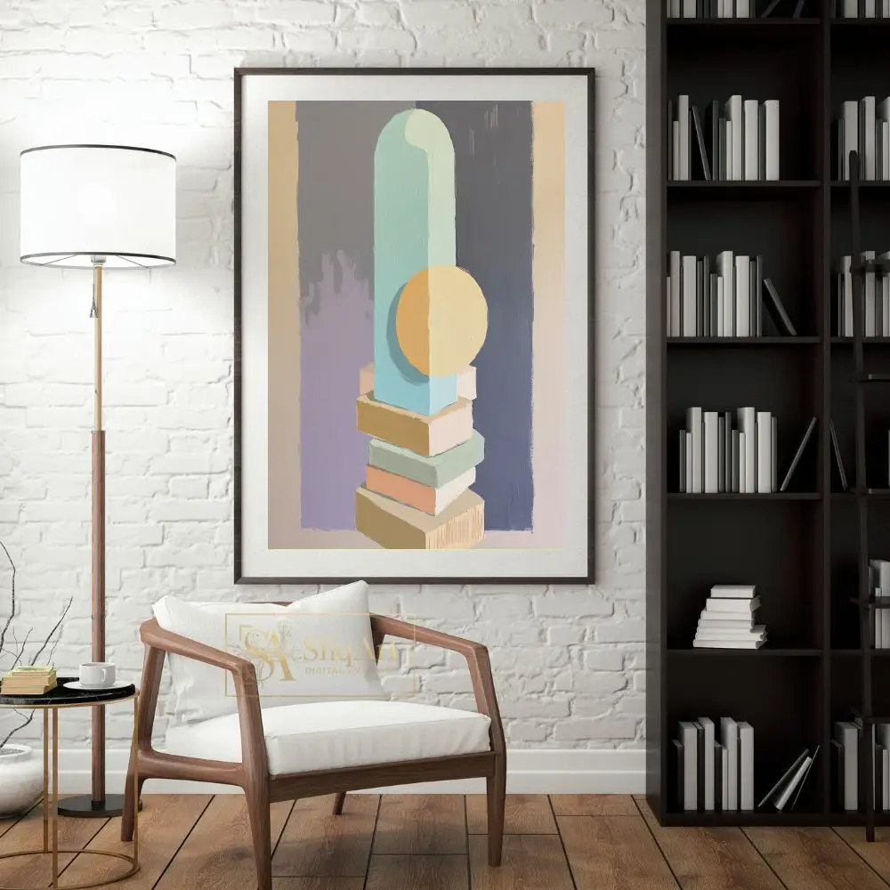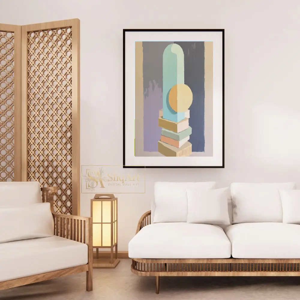 Elevate your interior with this serene minimalist abstract painting featuring a balanced stack of geometric forms. The composition showcases a tall, soft-blue arched pillar centered amidst a series of rectangular blocks in earthy sage, peach, and lavender tones.