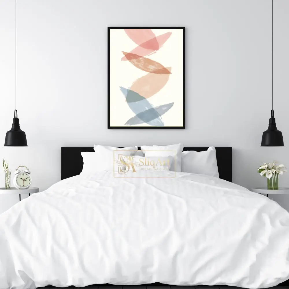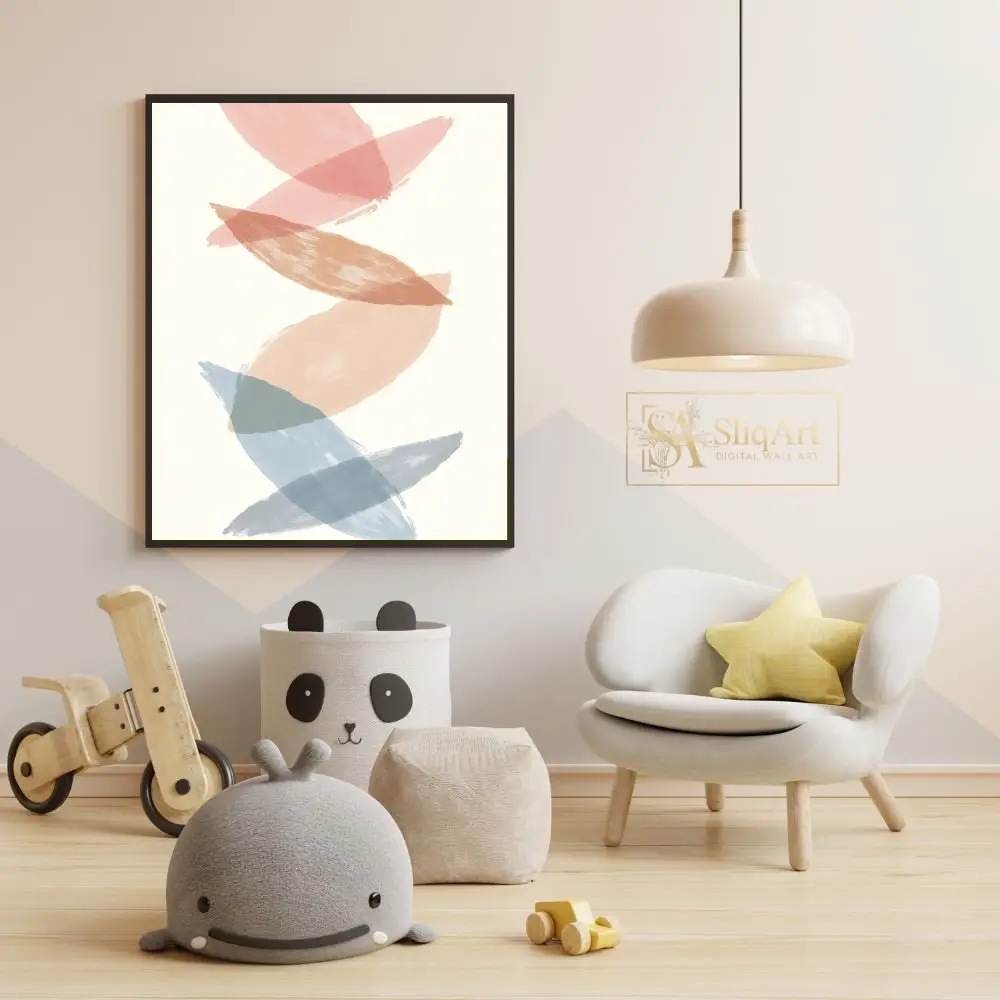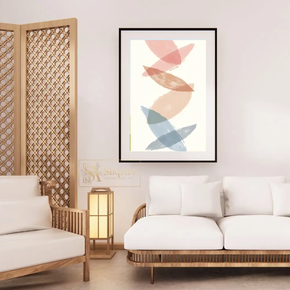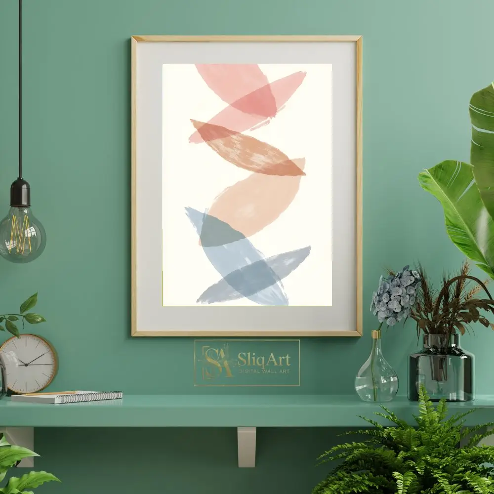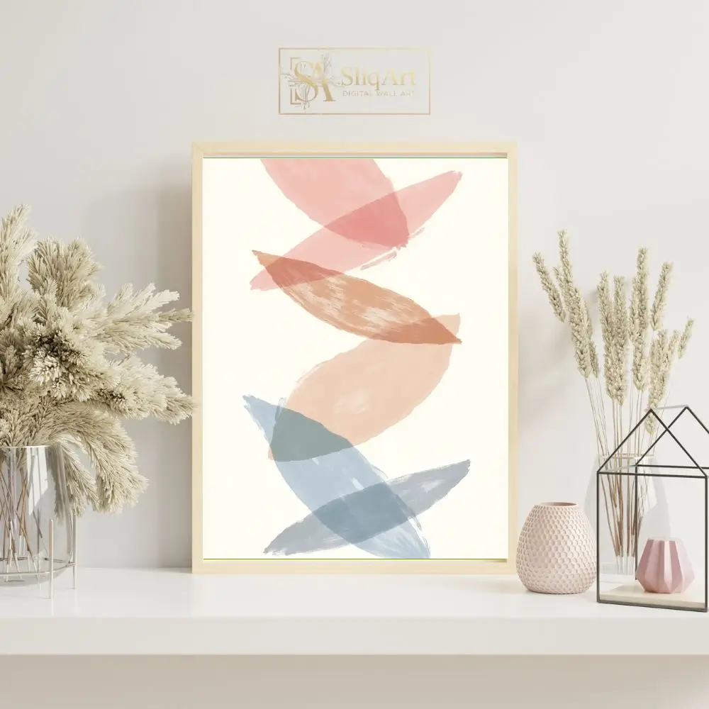 Transform your living space with this sophisticated abstract art piece. Featuring a rhythmic vertical stack of translucent, petal-like brushstrokes, the composition balances soft pastel pinks and earthy terracotta with calming muted blues and slate greys.