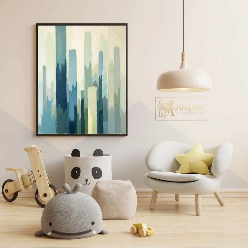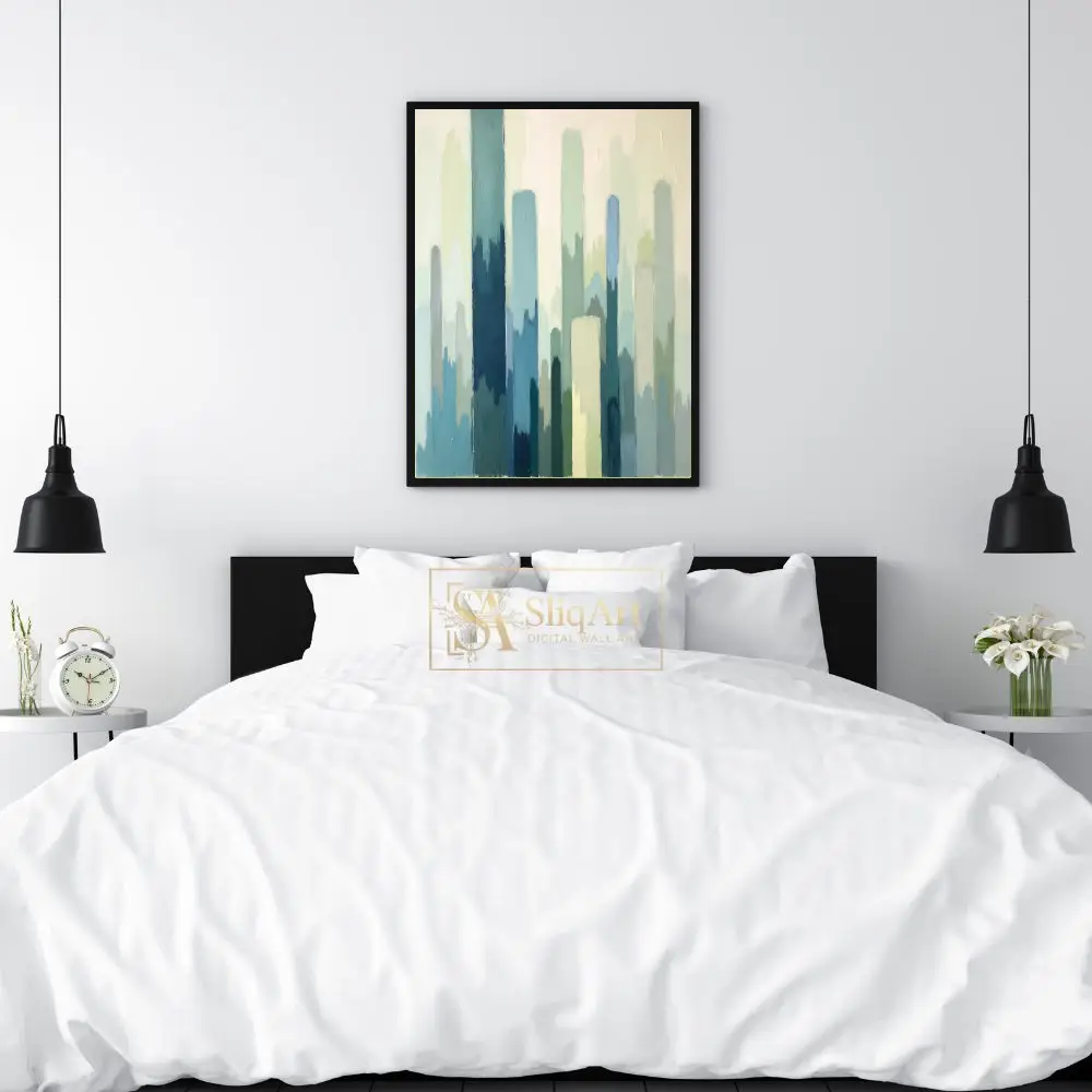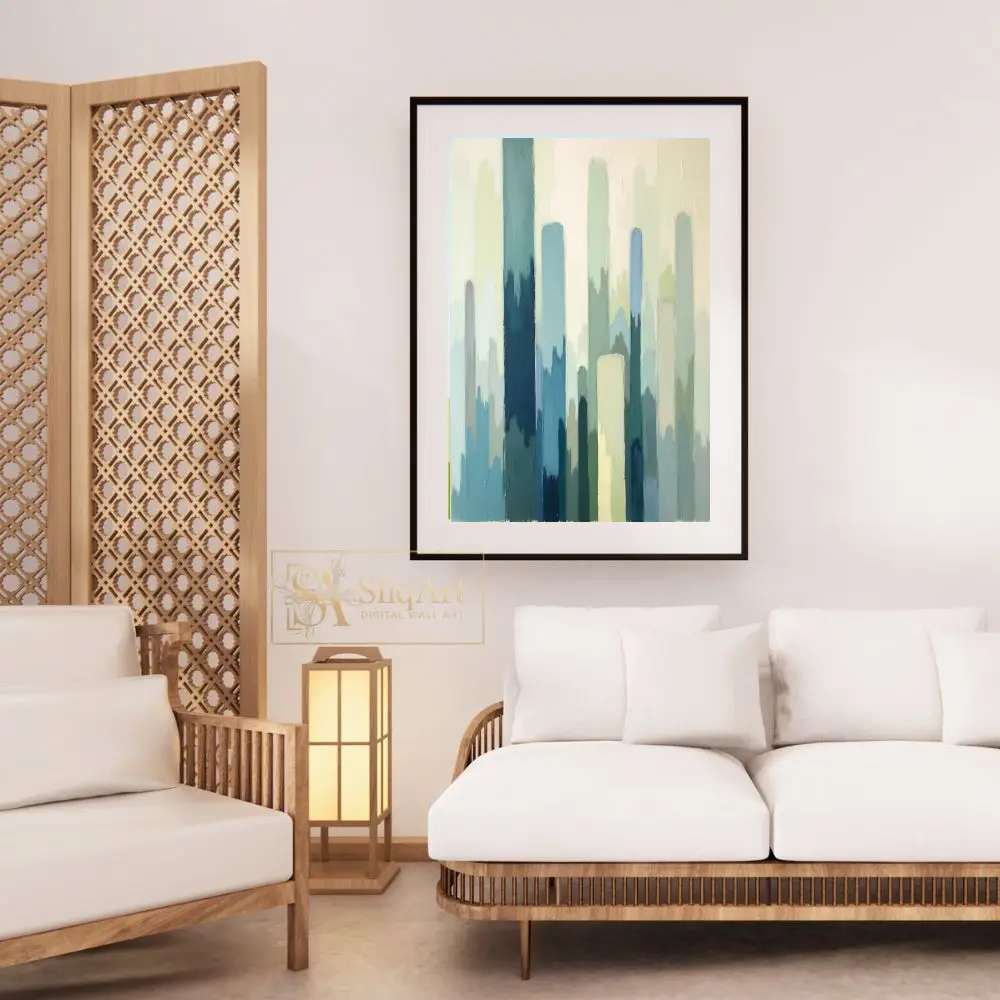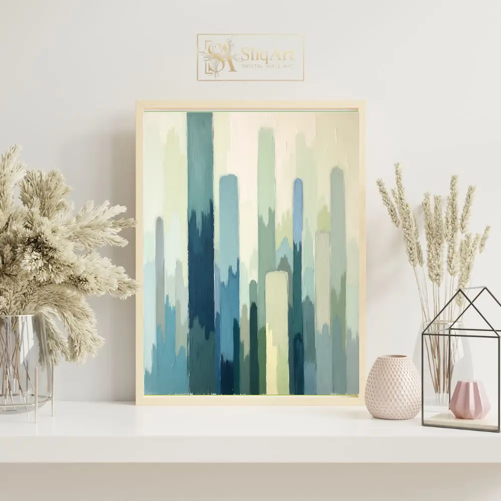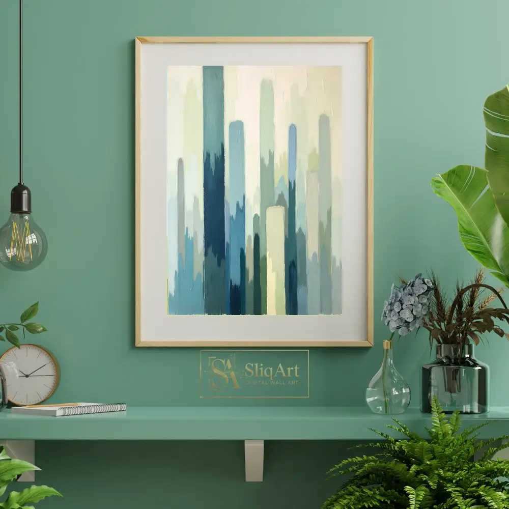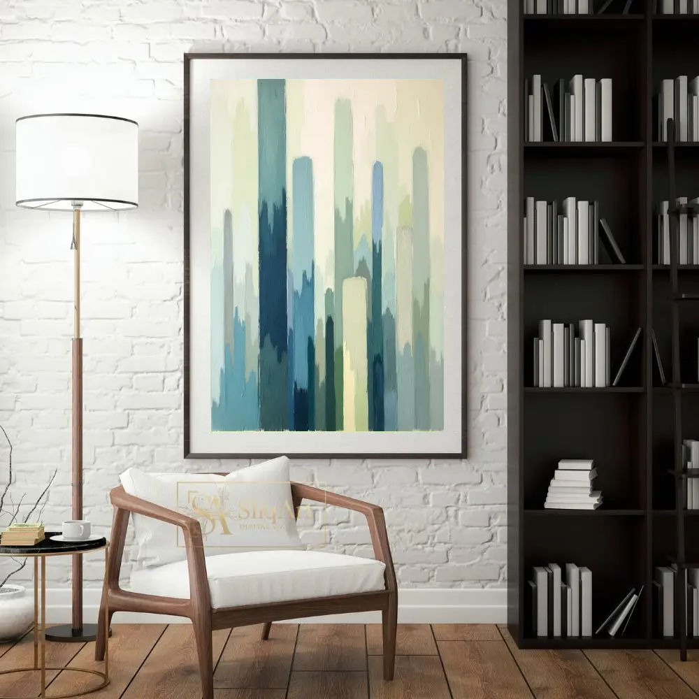 This captivating abstract painting features a rhythmic composition of vertical brushstrokes in a soothing palette of teal, sage, and misty blues.