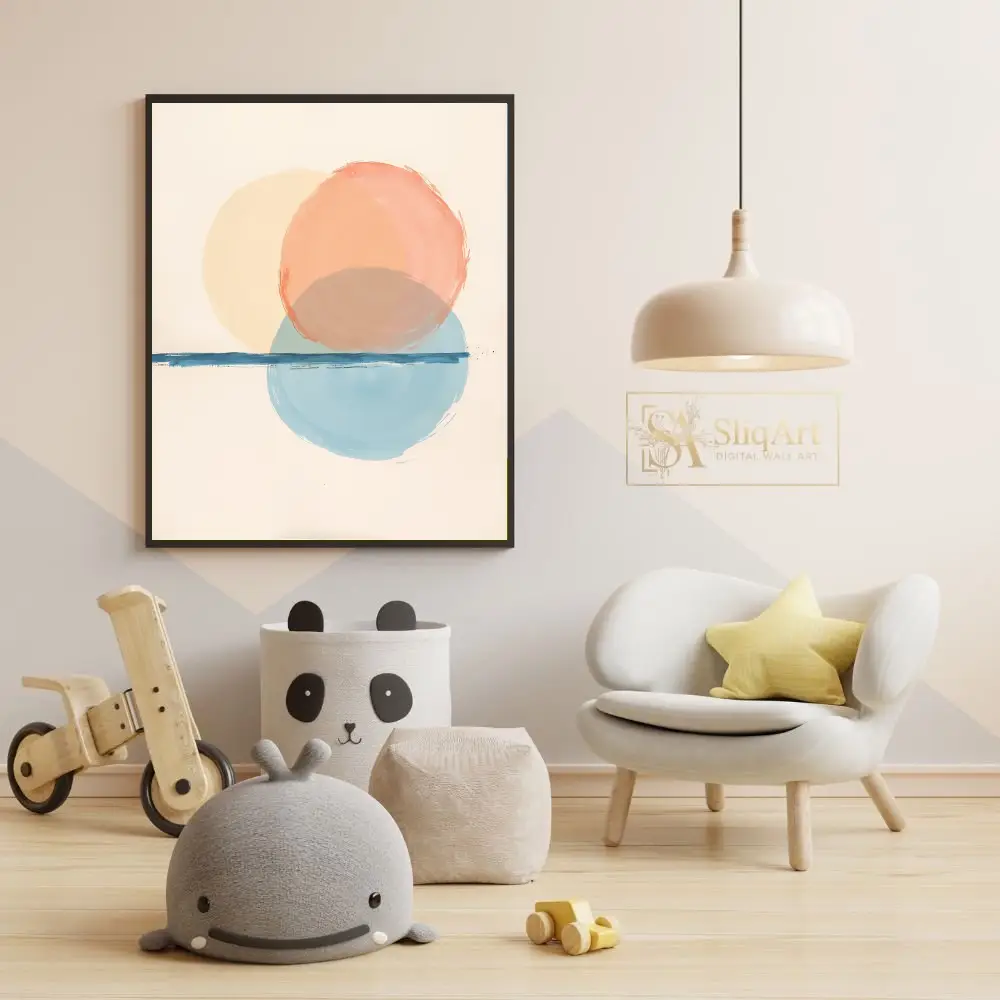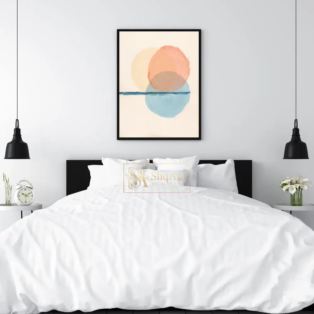 Experience a moment of zen with this abstract artwork, featuring a delicate interplay of overlapping spheres in soft peach, warm cream, and tranquil sky blue. The composition captures the essence of a celestial alignment or a setting sun reflecting over a calm body of water.