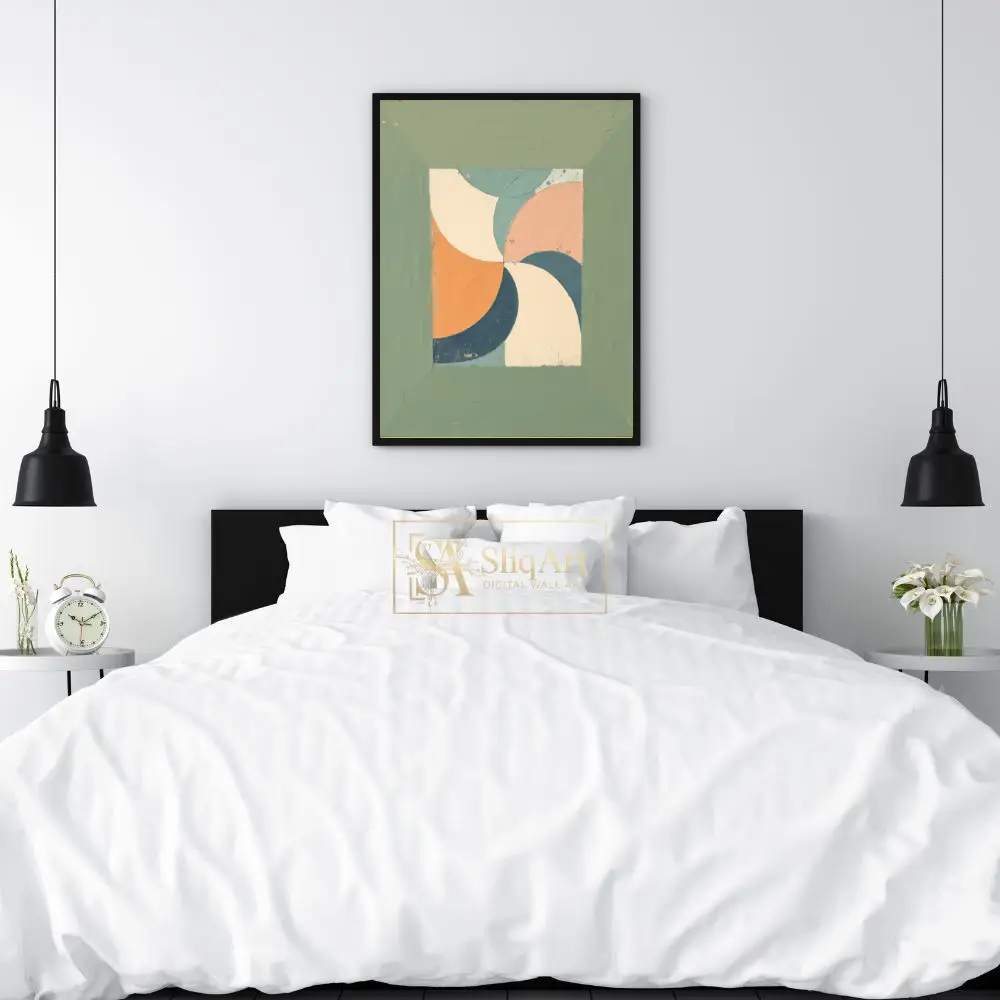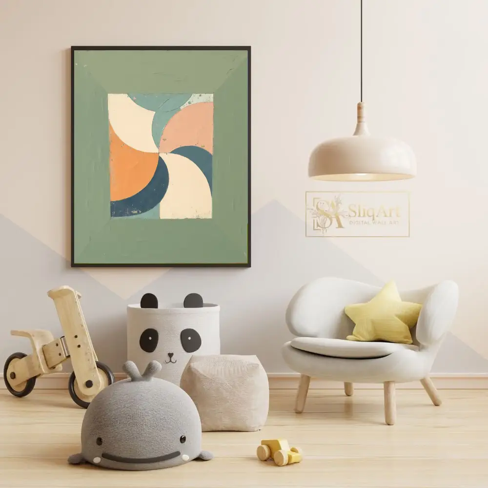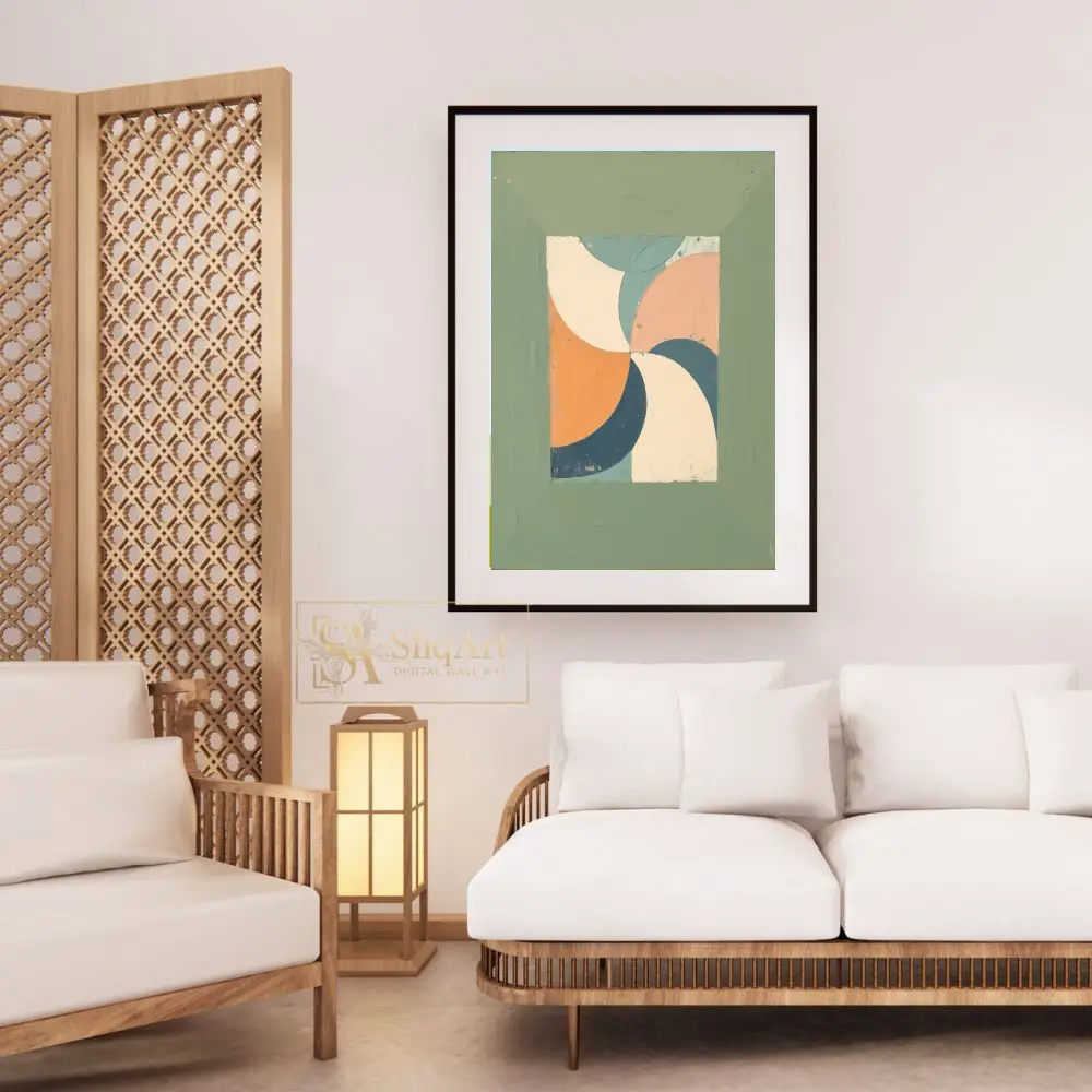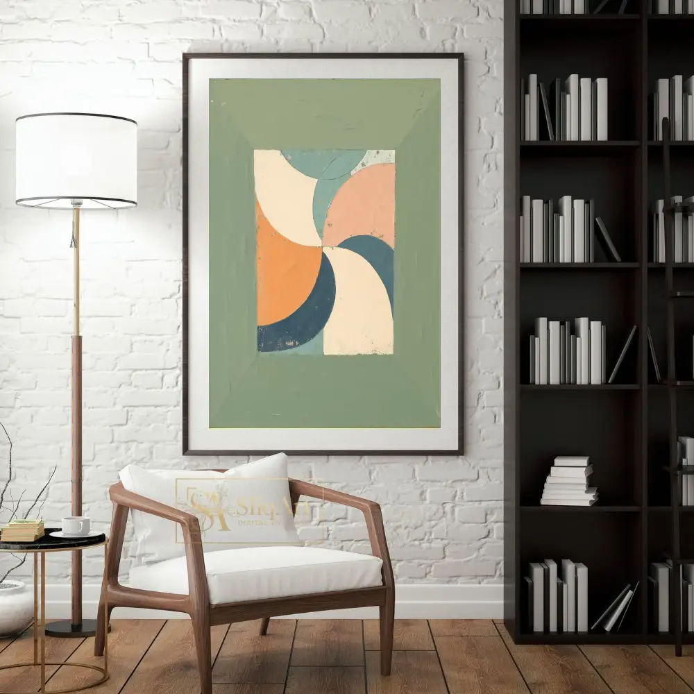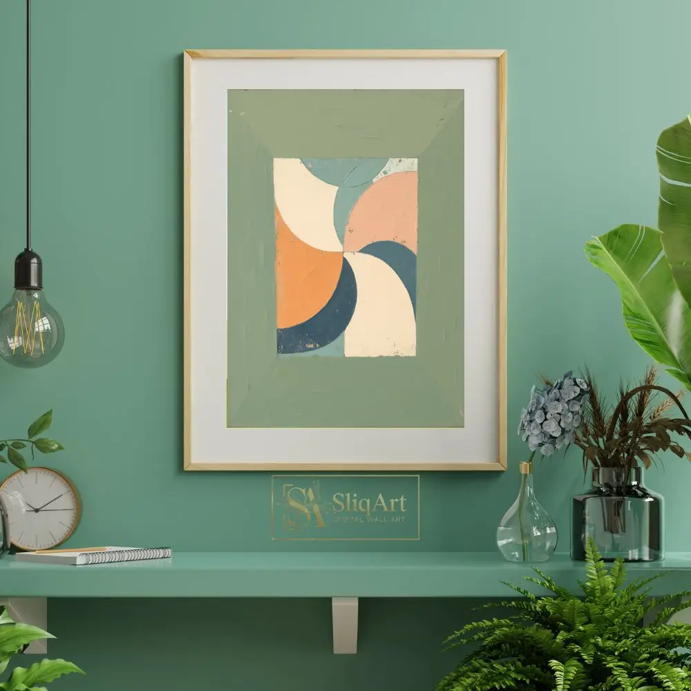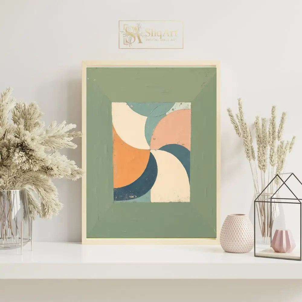 Surrounded by a wide, textured sage green border that mimics a rustic frame, this artwork brings a harmonious mid-century modern vibe to any interior. The distressed finish adds depth and character, making it a perfect addition to contemporary or vintage-inspired spaces.