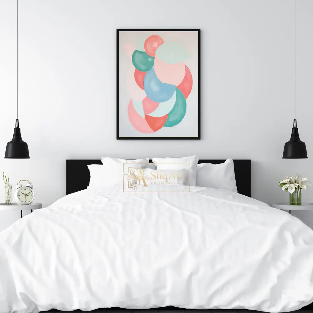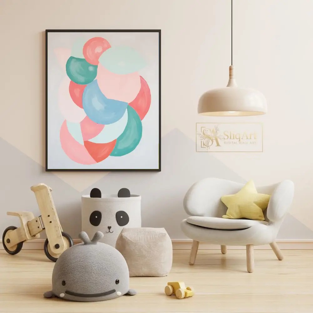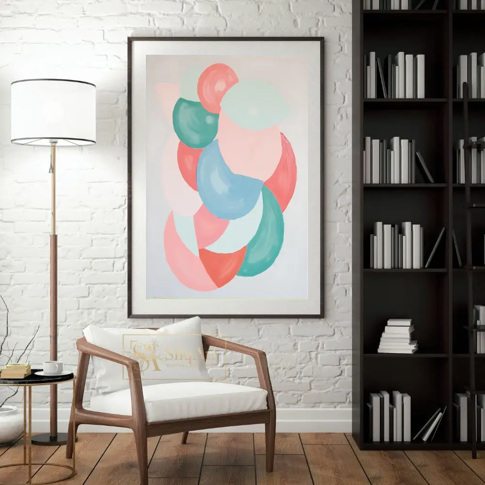 Experience the soothing rhythm of ‘Pastel Circular Harmony,’ a contemporary abstract painting that breathes life into any room. This piece showcases a playful dance of overlapping circles and crescents, rendered in a sophisticated palette of blush pink, mint green, and serene sky blue, accented by vibrant coral and deep teal.