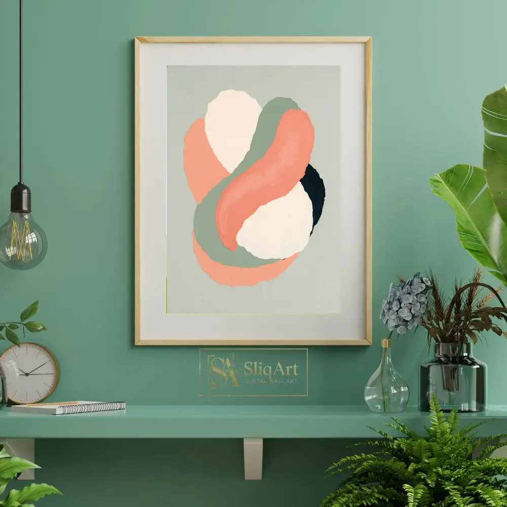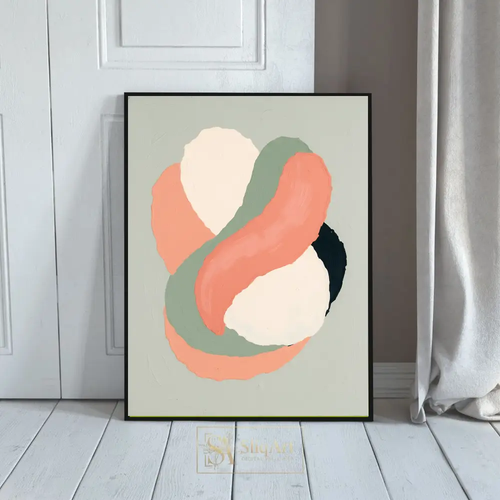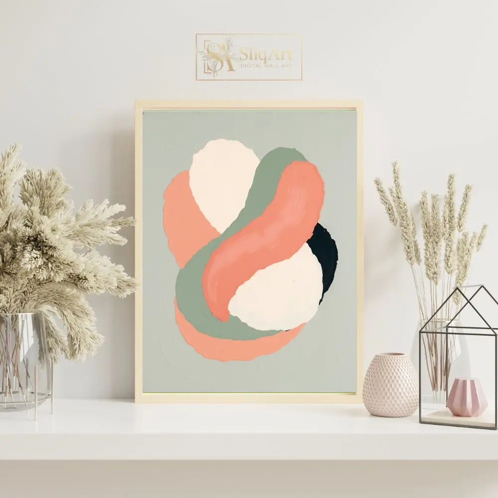 Add a touch of contemporary elegance to your home with this stunning abstract artwork. Featuring fluid, interlocking shapes in a palette of warm coral, earthy sage green, and soft cream, this piece captures a sense of rhythmic movement.