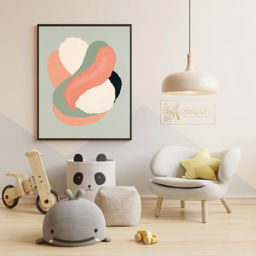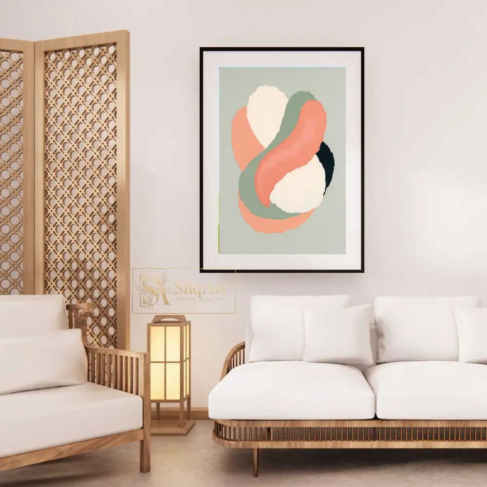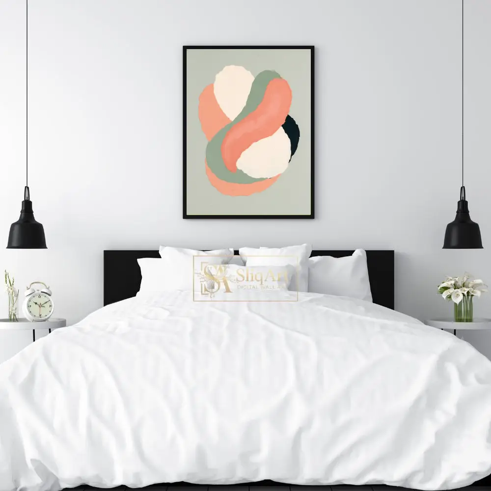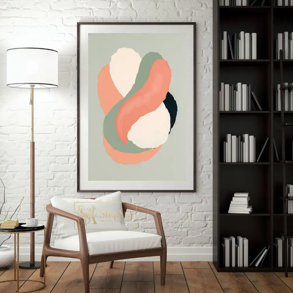 Add a touch of contemporary elegance to your home with this stunning abstract artwork. Featuring fluid, interlocking shapes in a palette of warm coral, earthy sage green, and soft cream, this piece captures a sense of rhythmic movement.