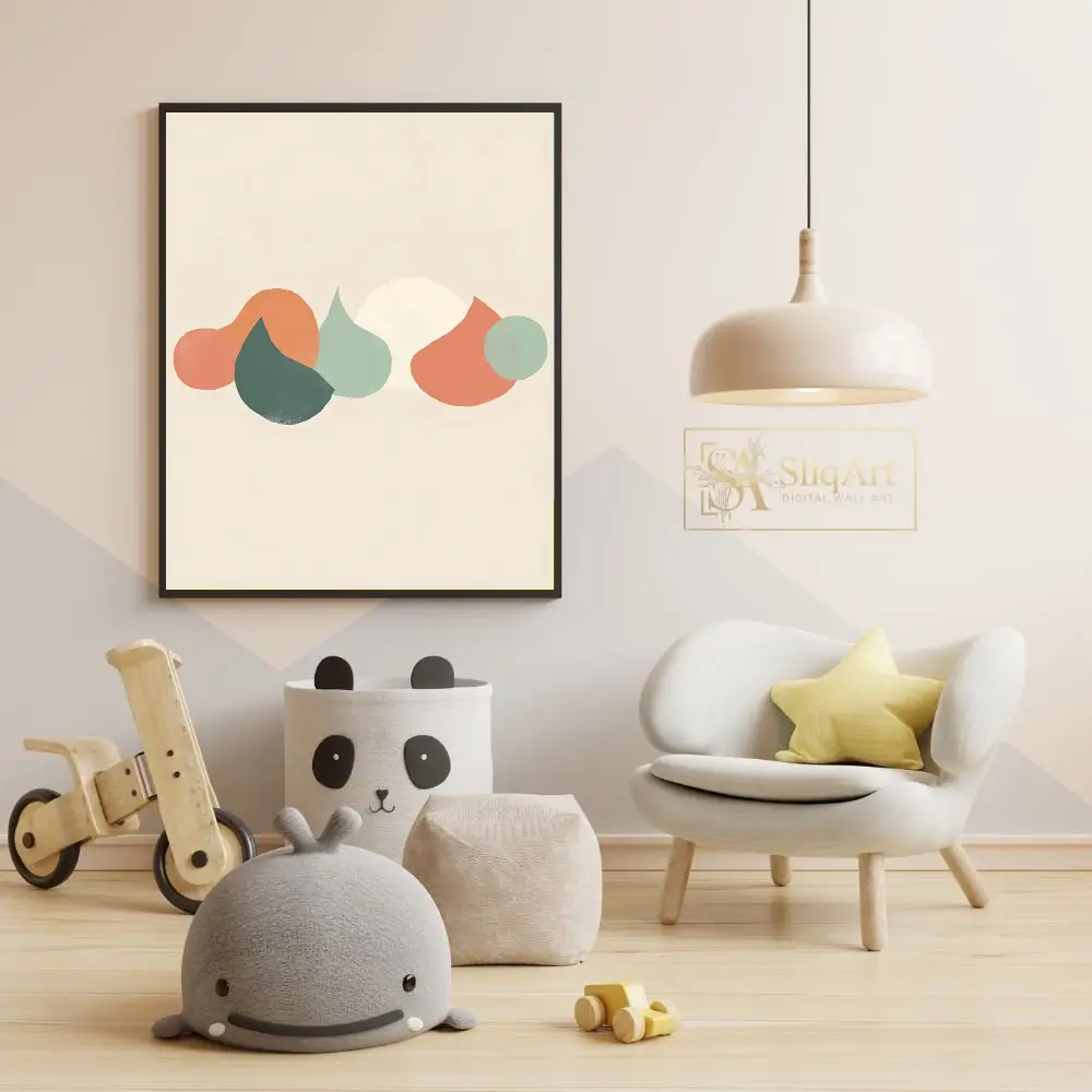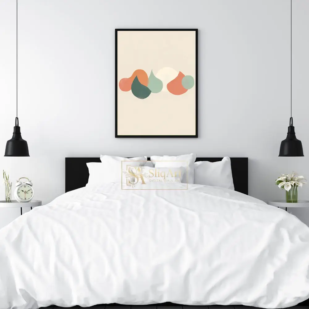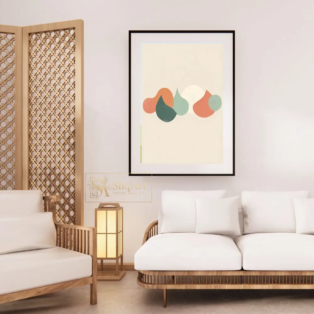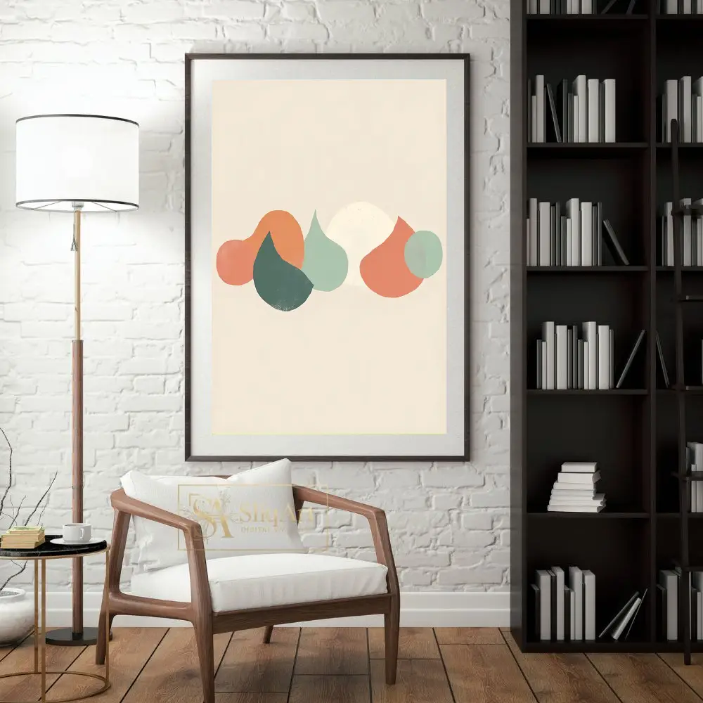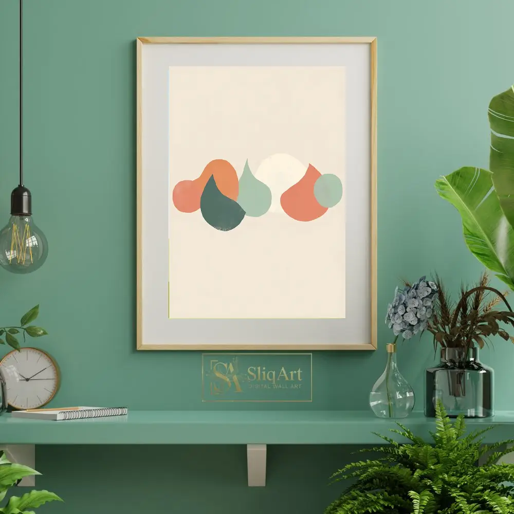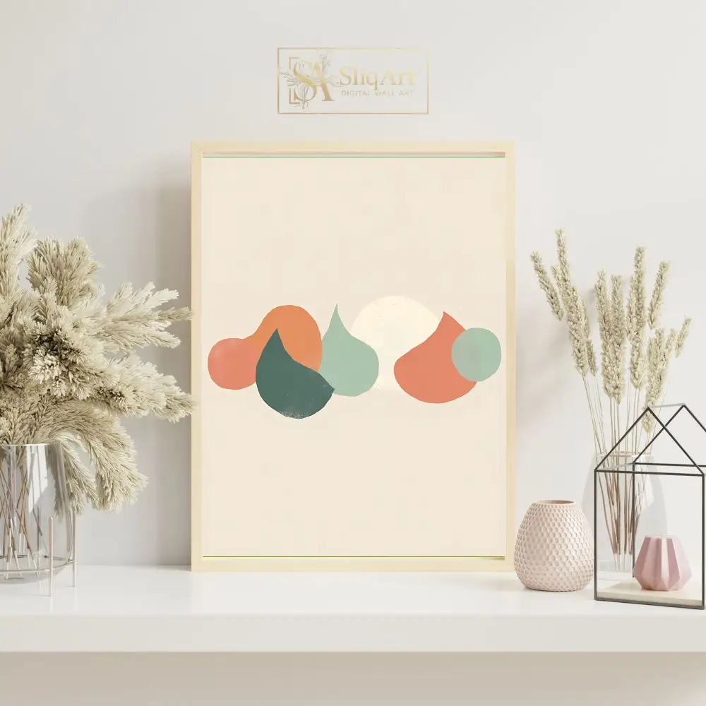 Enhance your home with this sophisticated minimalist abstract piece, featuring a curated arrangement of organic, pebble-like shapes in a soothing palette of sage green, terracotta, and warm cream. Set against a neutral beige background, the overlapping forms create a sense of depth and natural tranquility.