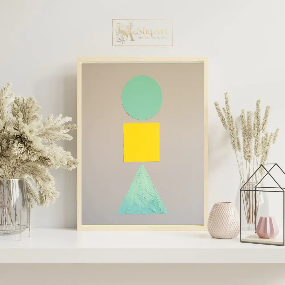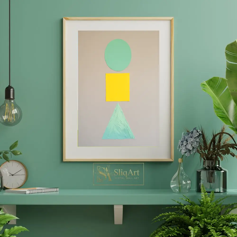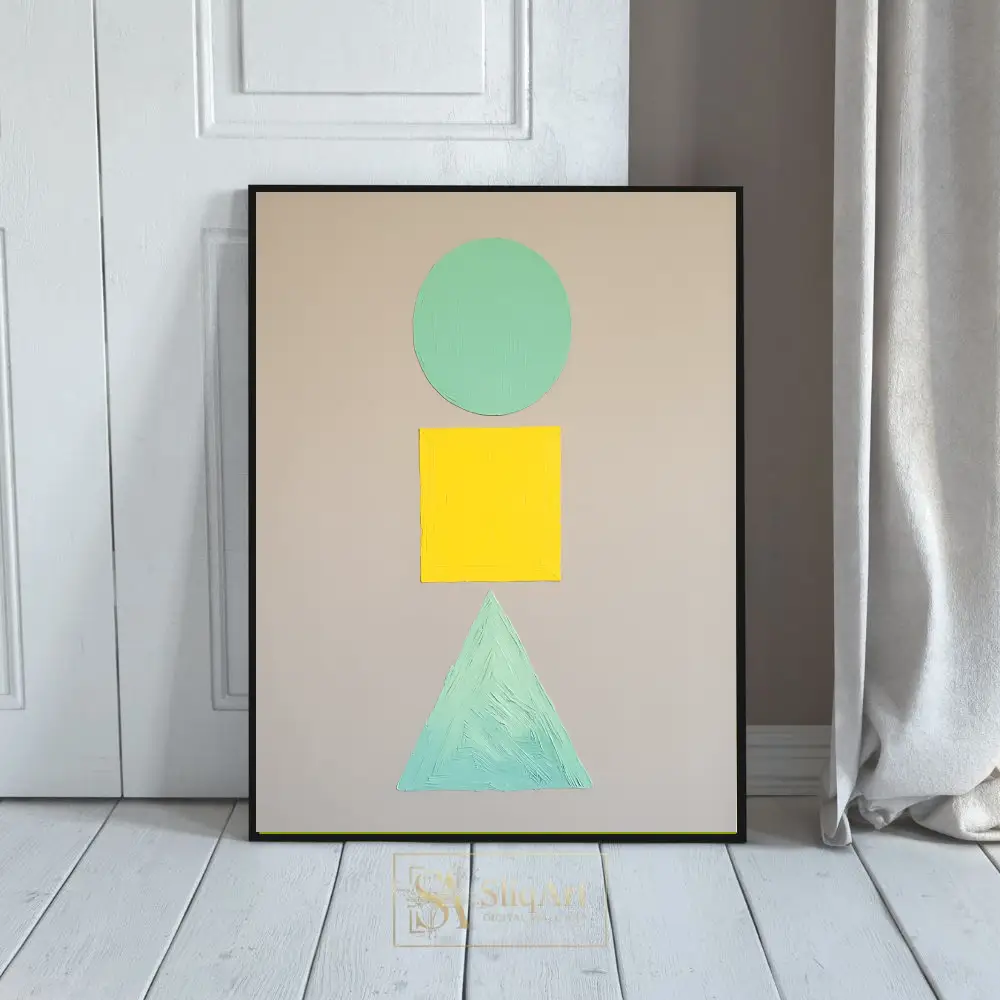 Featuring a vertically stacked arrangement of a mint green circle, a bright yellow square, and a mint green triangle, this artwork utilizes heavy impasto-style texture to create a 3D effect on the canvas. The clean, neutral background ensures the vibrant shapes remain the focal point, bringing a sense of balance and playfulness to any contemporary space.