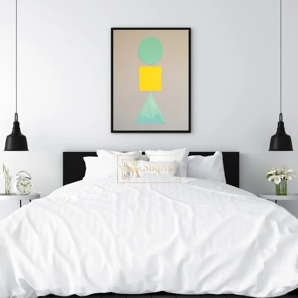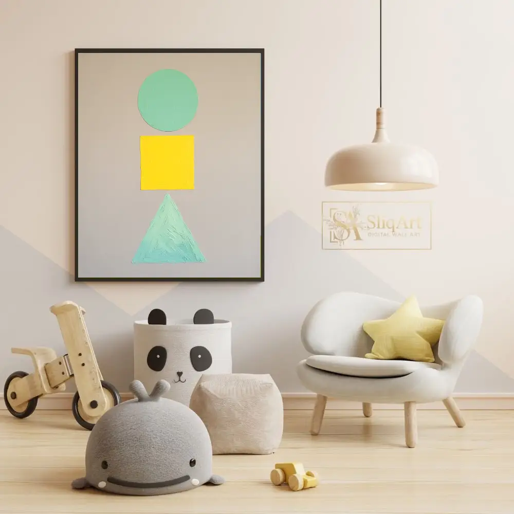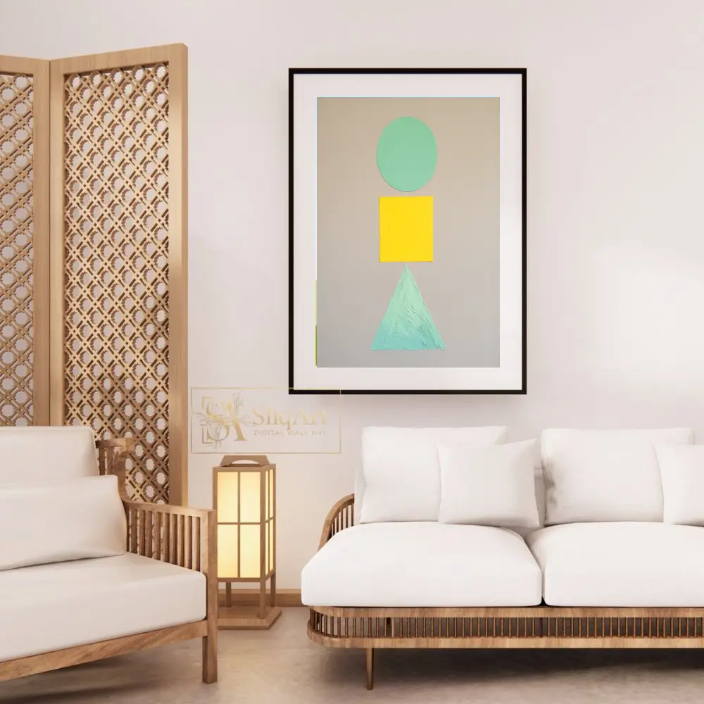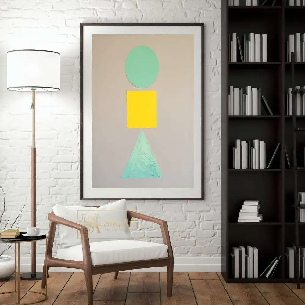 Featuring a vertically stacked arrangement of a mint green circle, a bright yellow square, and a mint green triangle, this artwork utilizes heavy impasto-style texture to create a 3D effect on the canvas. The clean, neutral background ensures the vibrant shapes remain the focal point, bringing a sense of balance and playfulness to any contemporary space.