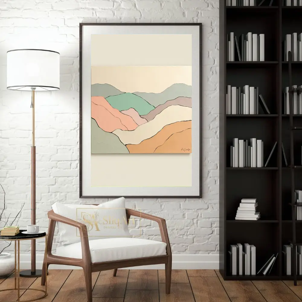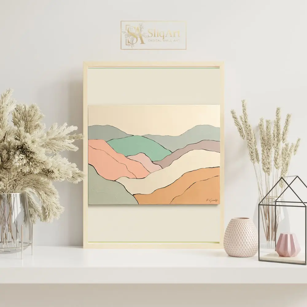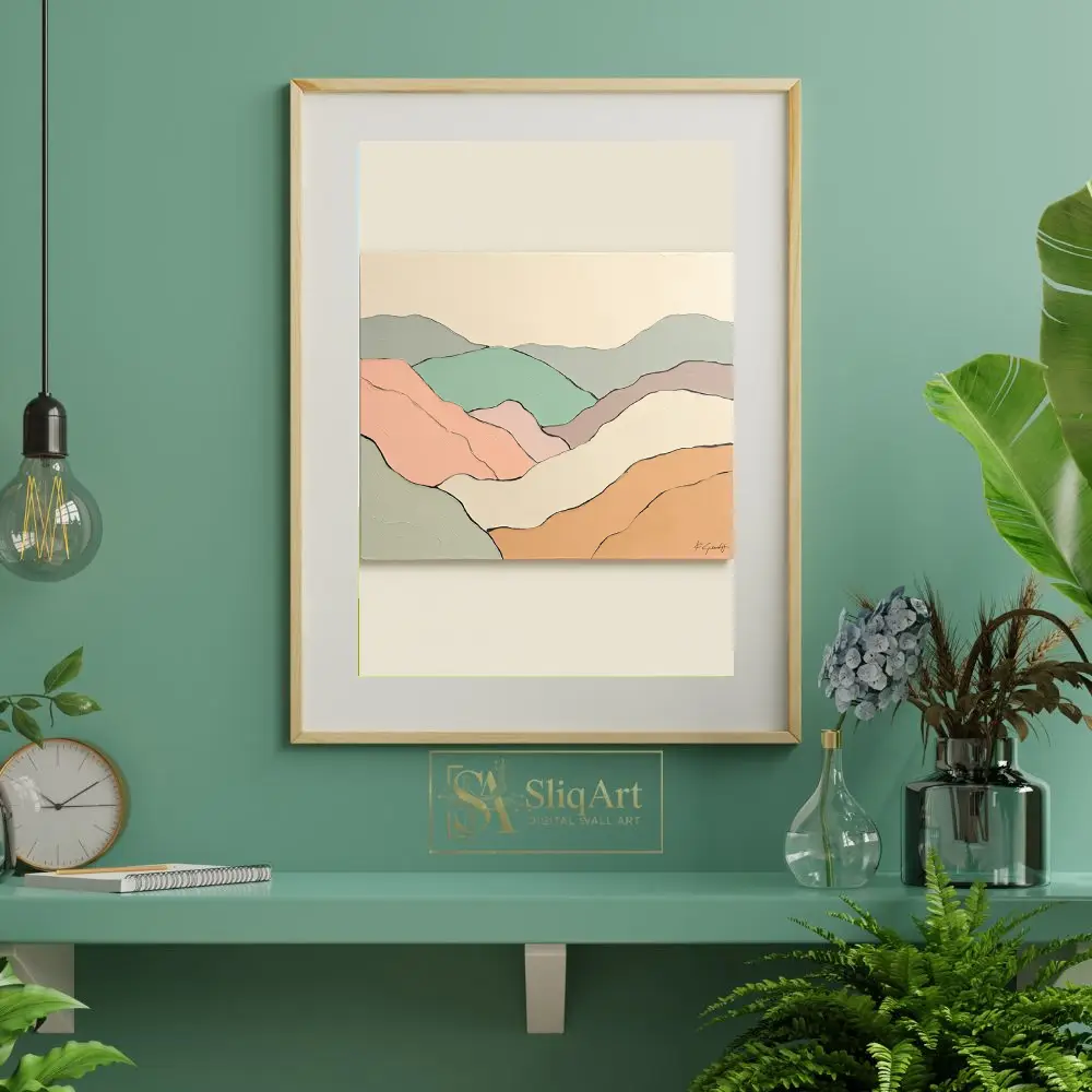 Enhance your living space with this serene abstract landscape, featuring rolling hills rendered in a harmonious palette of sage green, dusty rose, and warm earth tones.