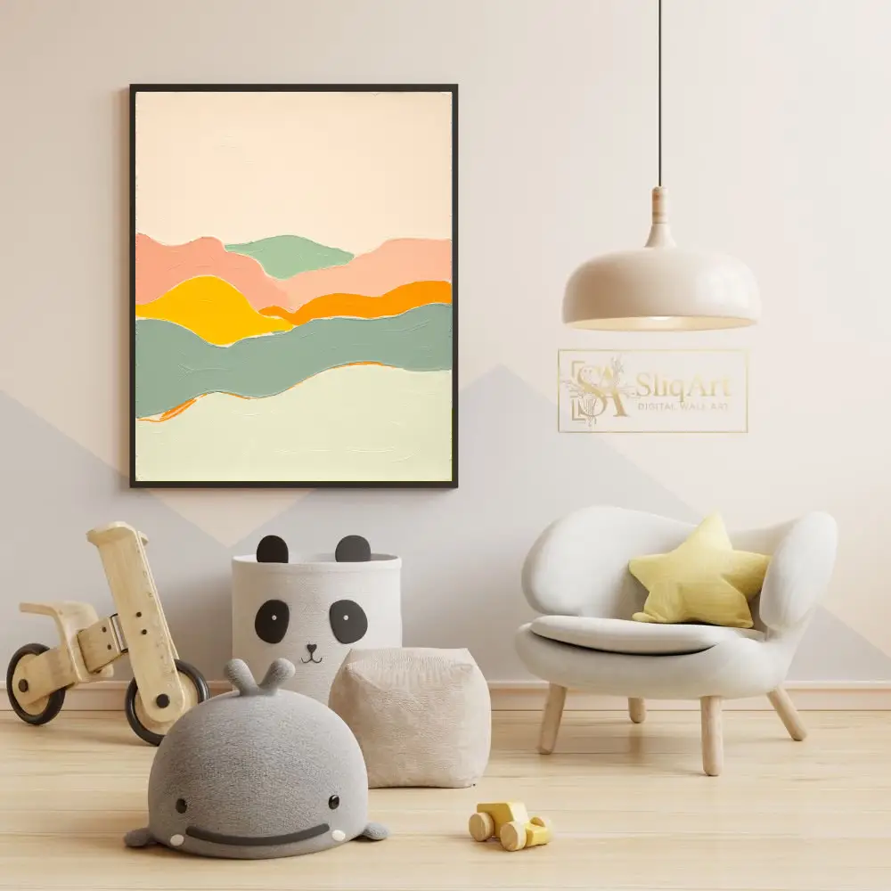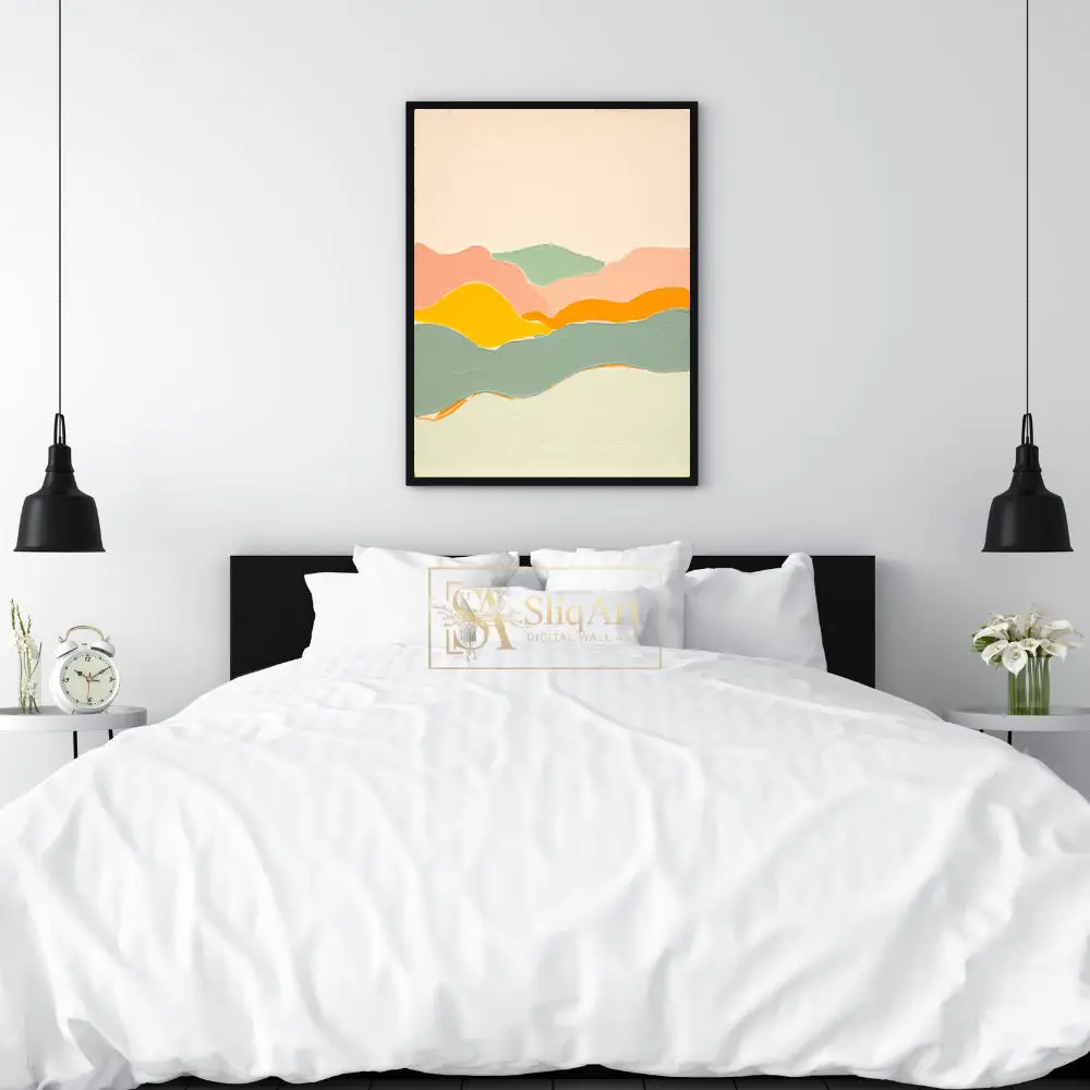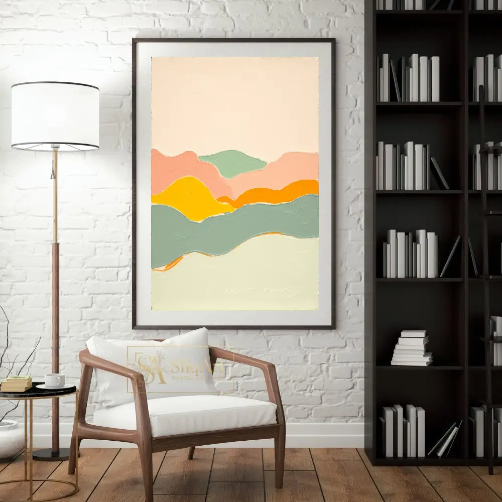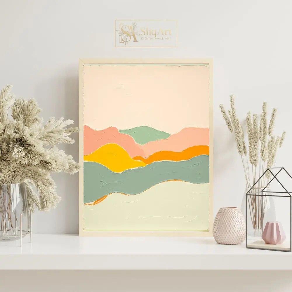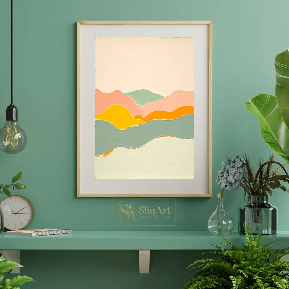 Transform your space with this captivating abstract landscape, defined by its thick, impasto-style texture and serene color palette. The artwork features flowing, organic shapes representing rolling hills or gentle dunes in a balanced arrangement of sage green, mustard yellow, and soft salmon pink.