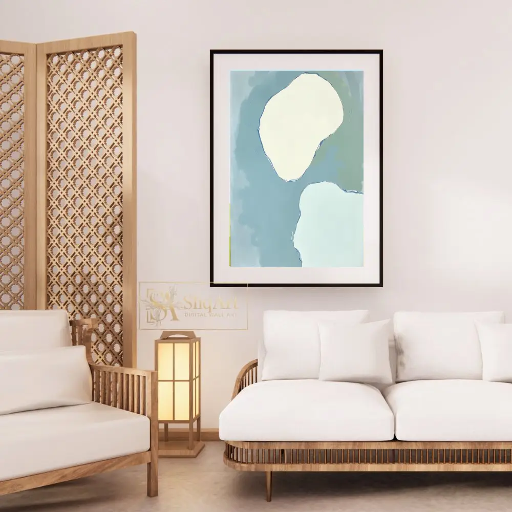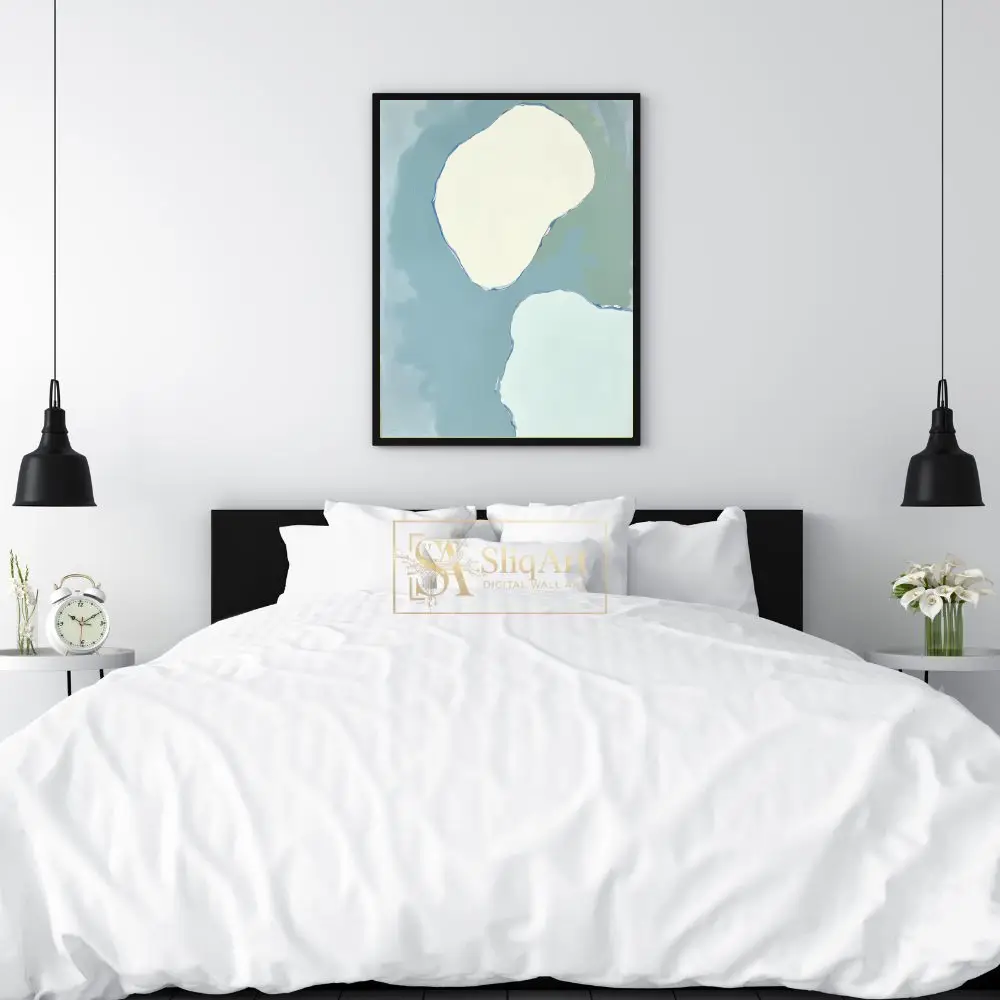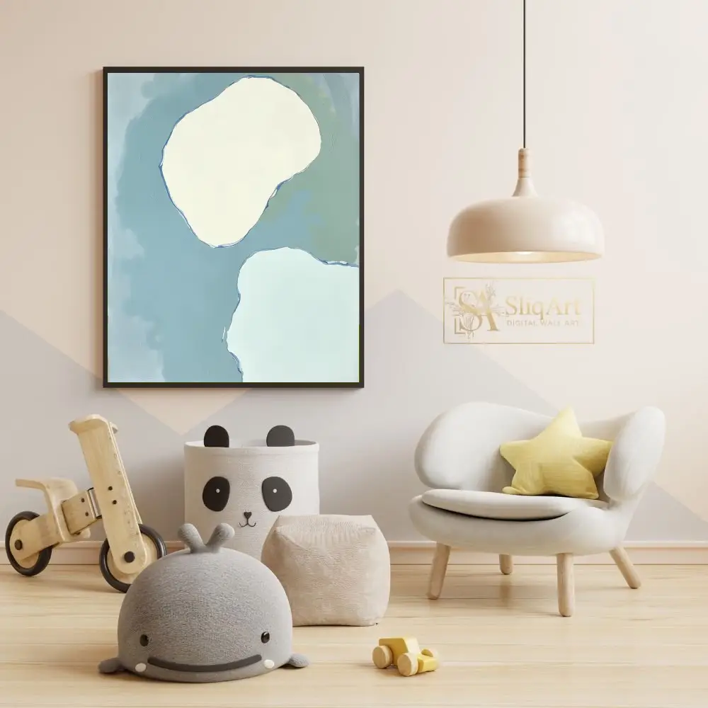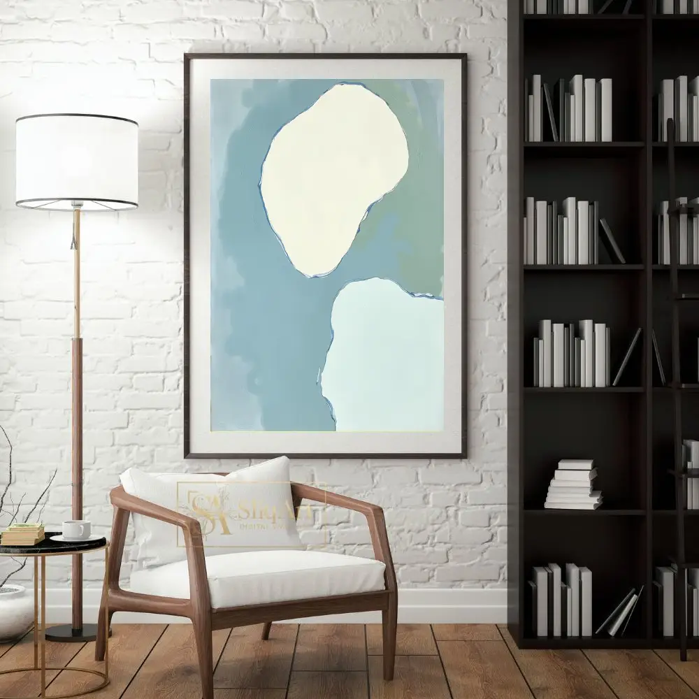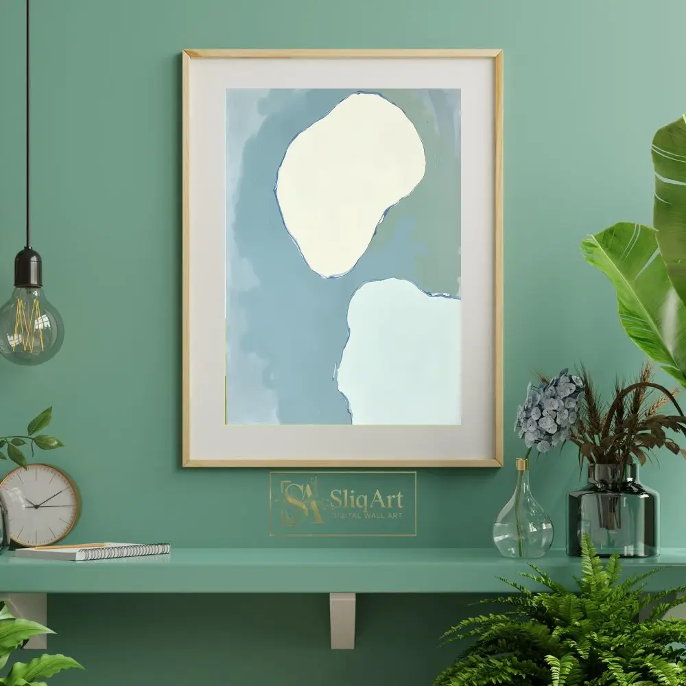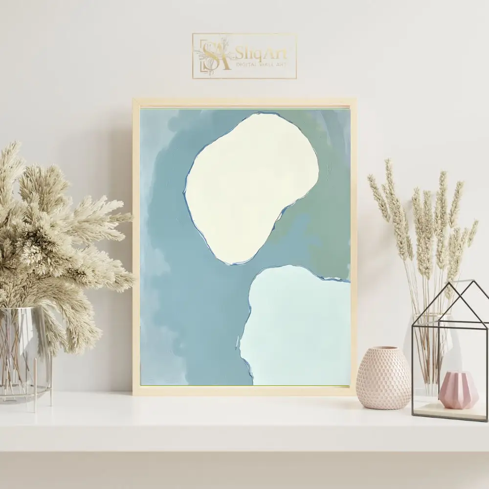 A calming abstract art piece featuring soft organic shapes in muted blue, green, and cream tones.