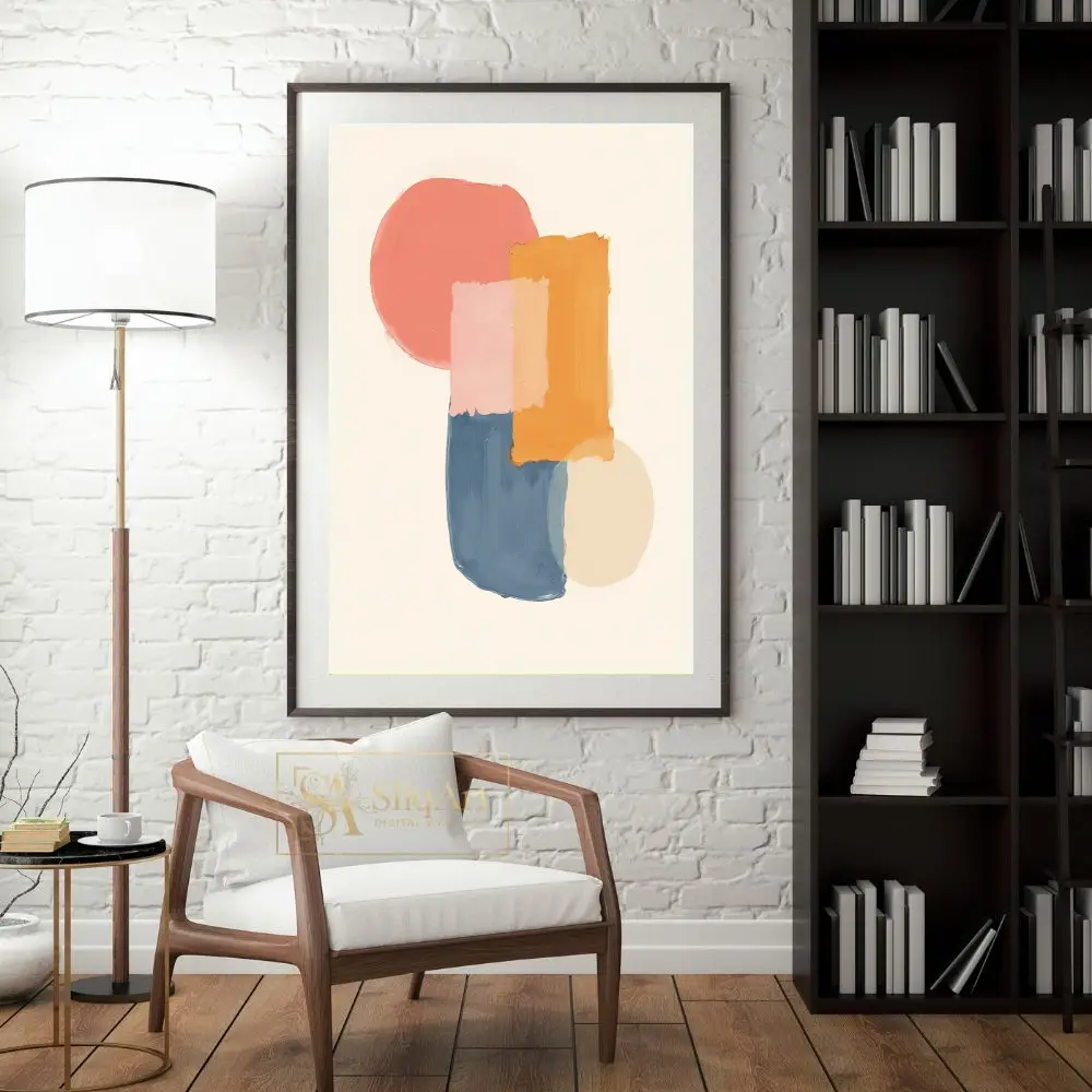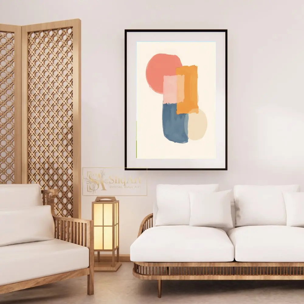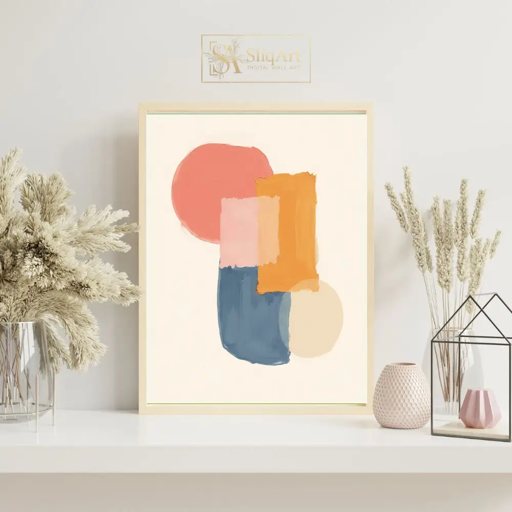 Elevate your interior with this sophisticated piece of modern abstract art. Featuring a harmonious blend of organic circular forms and structured rectangular blocks, this piece captures the essence of contemporary minimalism.