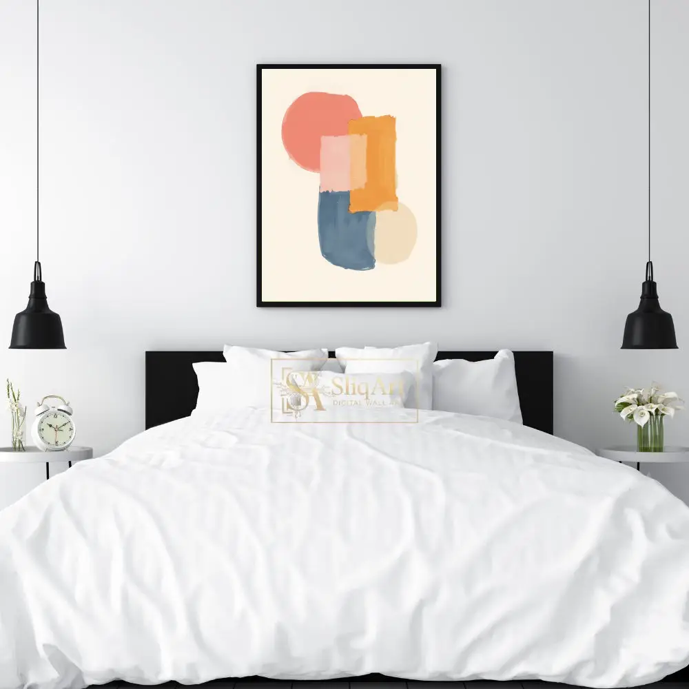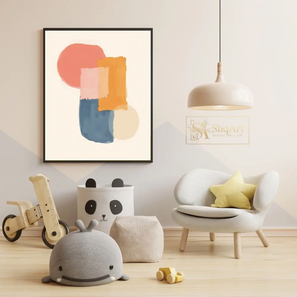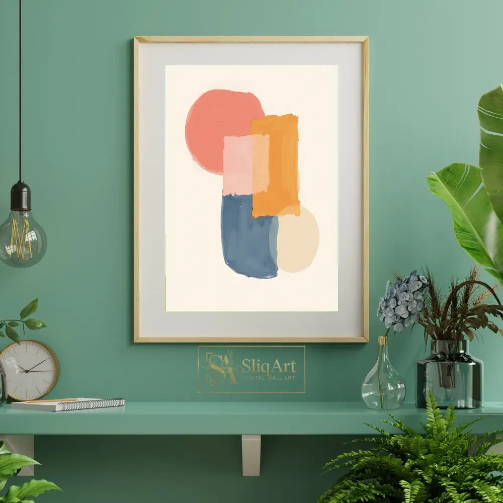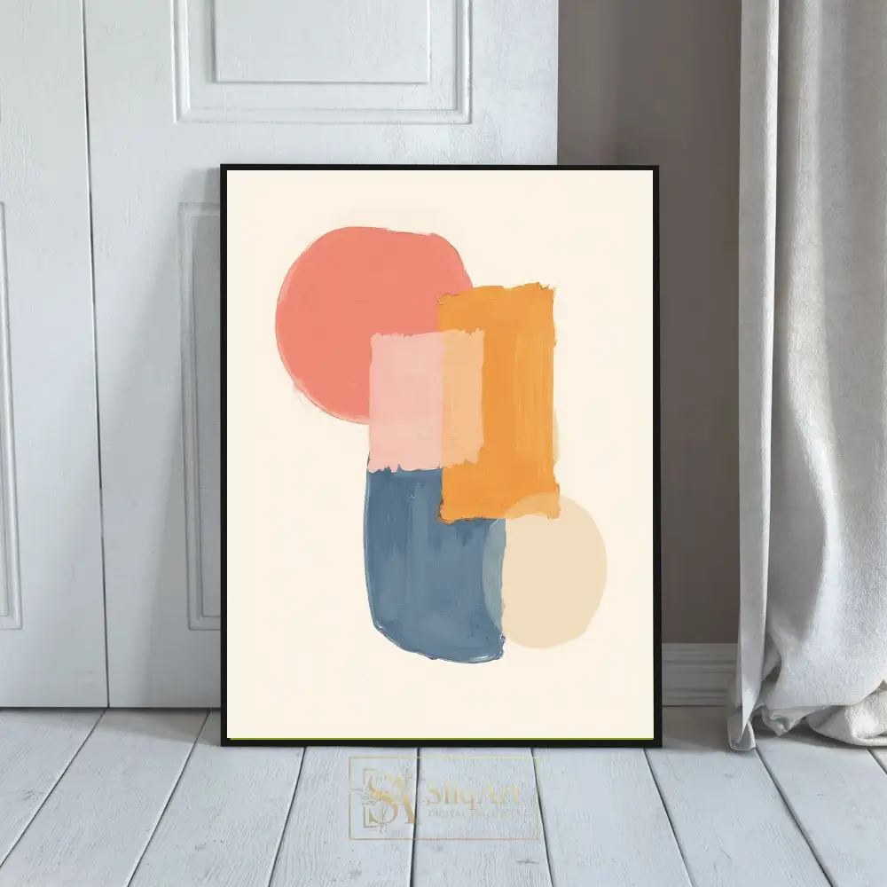 Elevate your interior with this sophisticated piece of modern abstract art. Featuring a harmonious blend of organic circular forms and structured rectangular blocks, this piece captures the essence of contemporary minimalism.