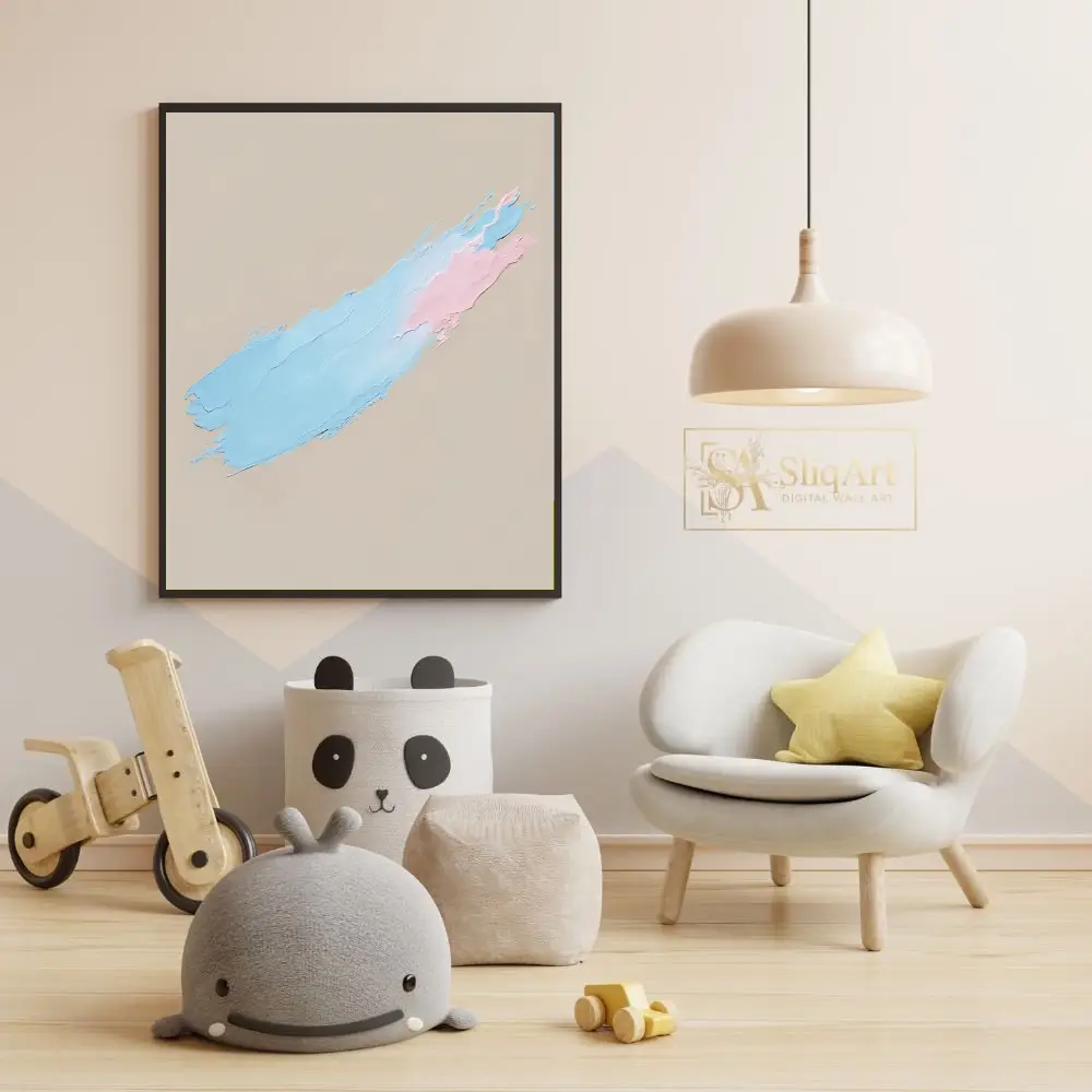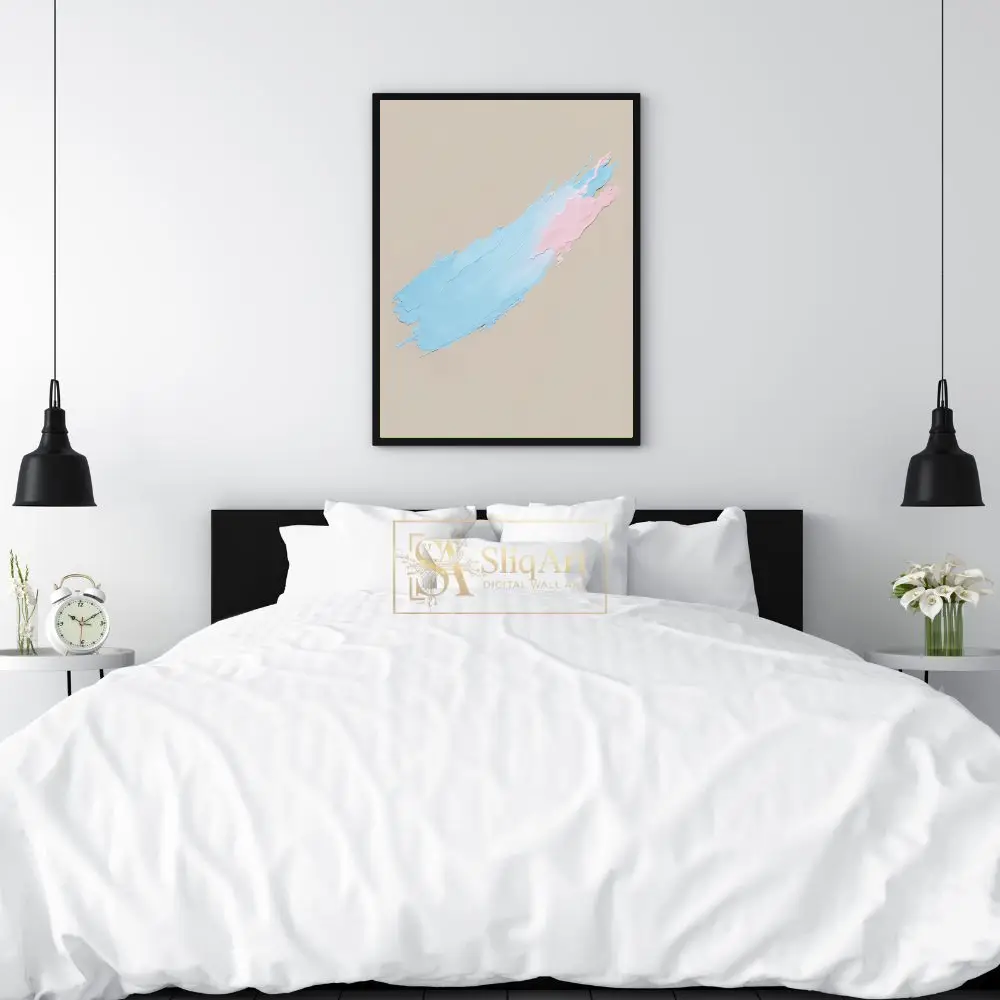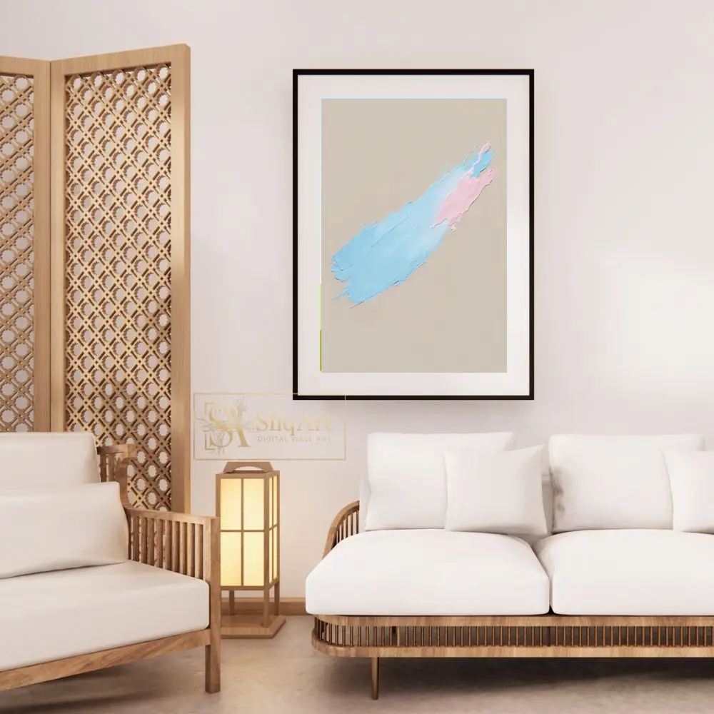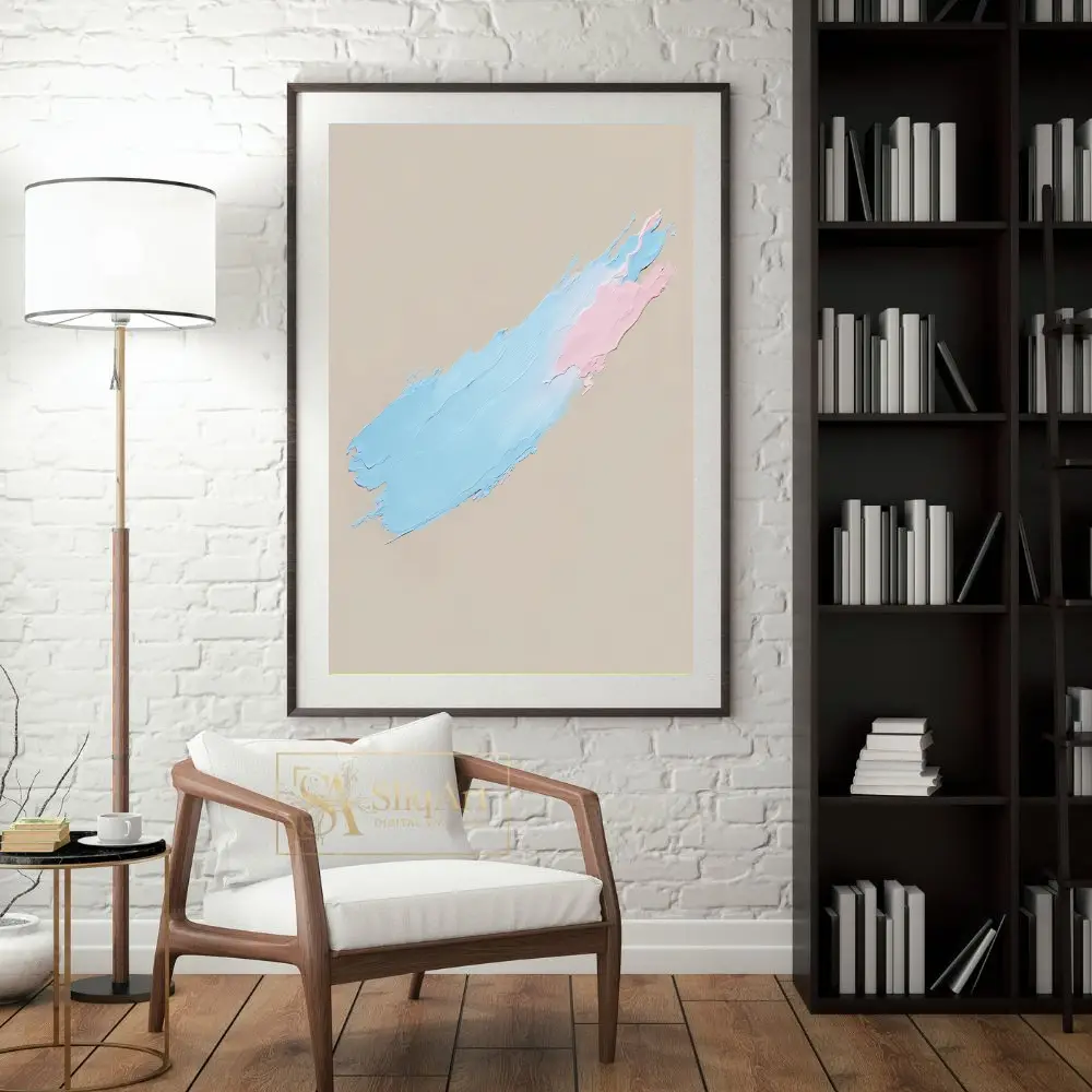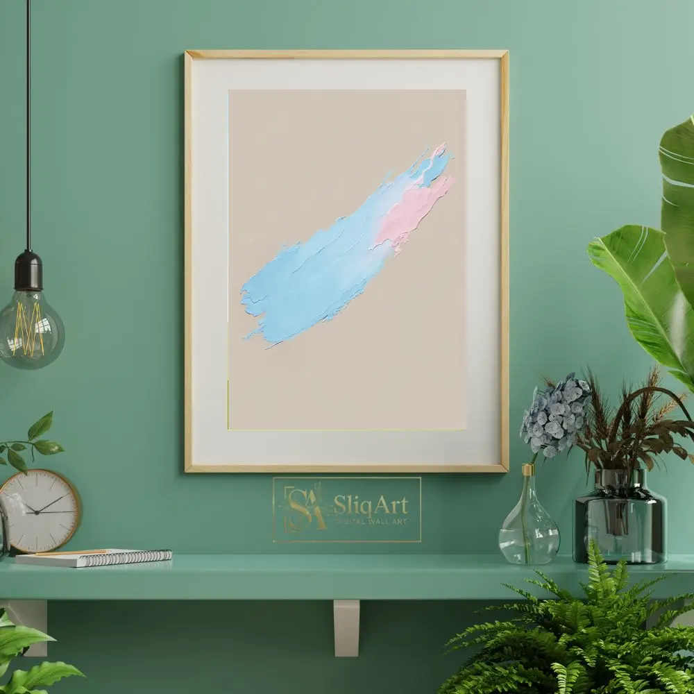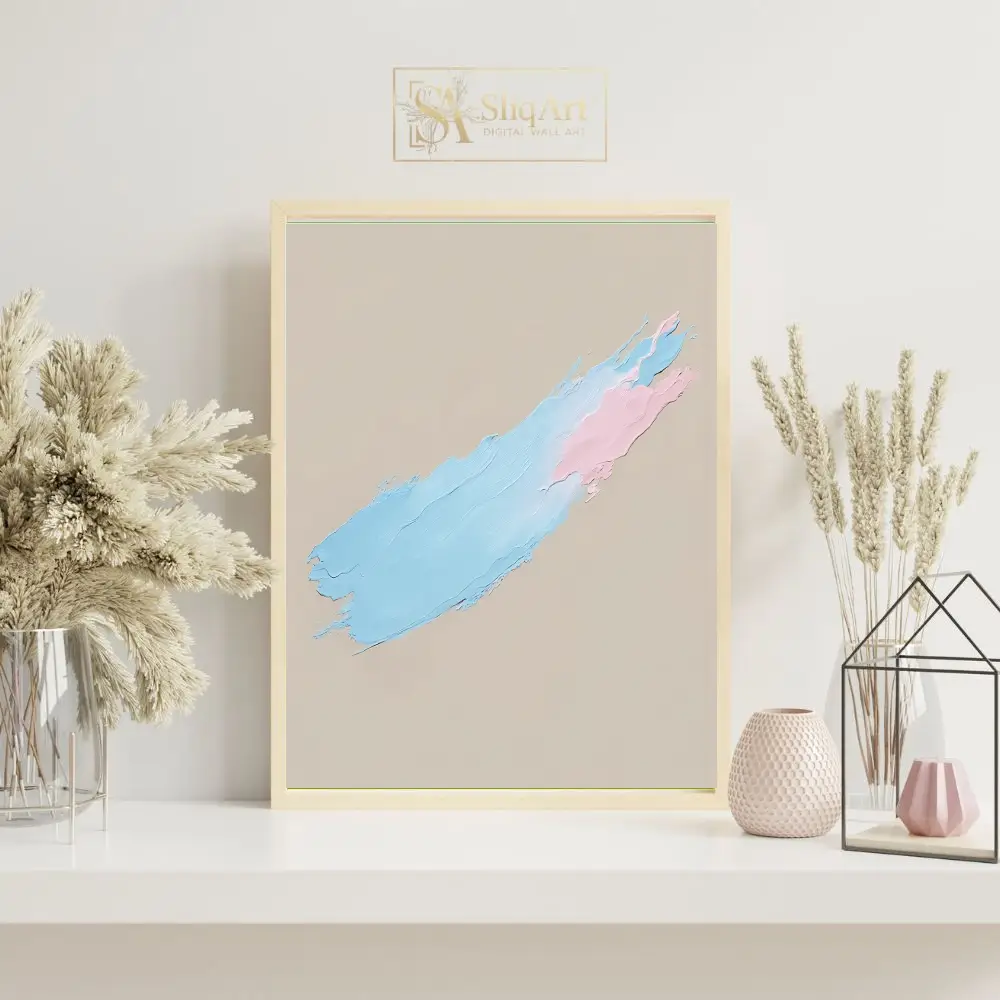 Experience the tactile beauty of contemporary minimalism with this stunning impasto artwork. Featuring a single, sweeping diagonal brushstroke, the piece showcases a delicate interplay between soothing pastel blue and soft pink hues.