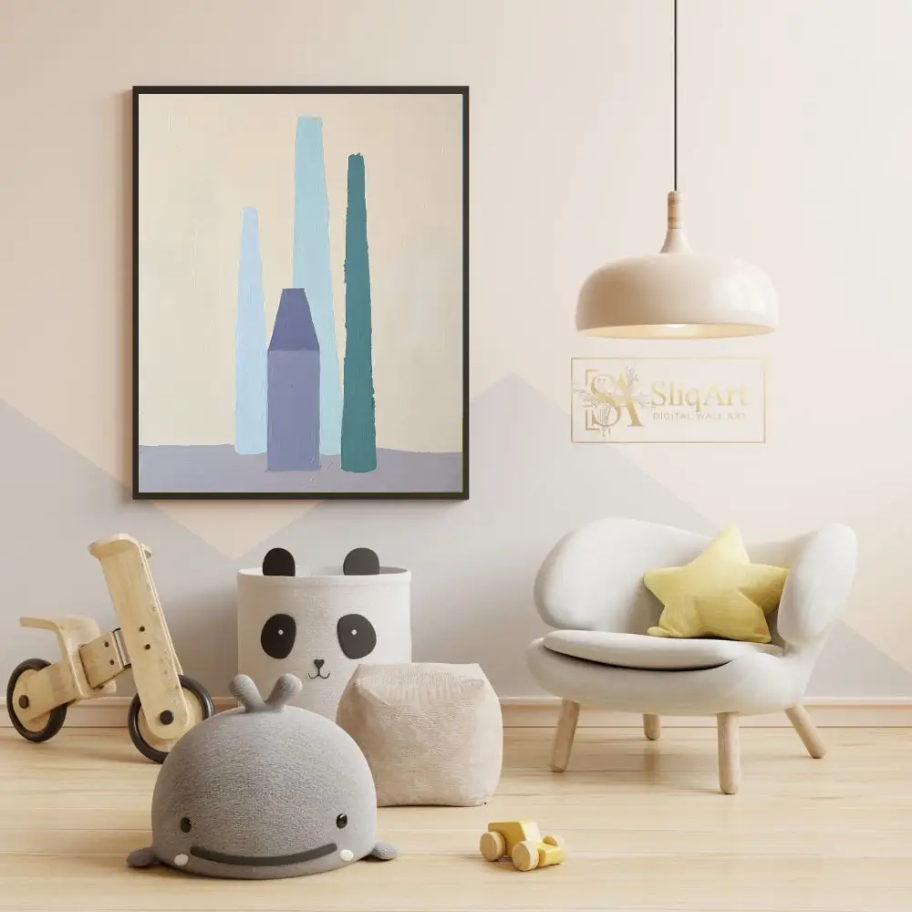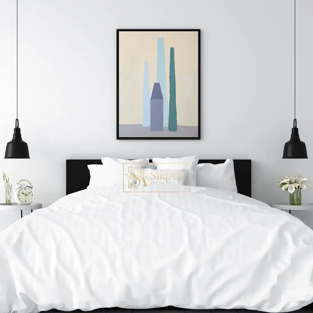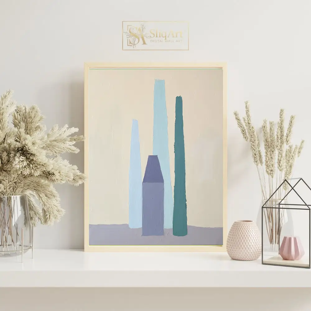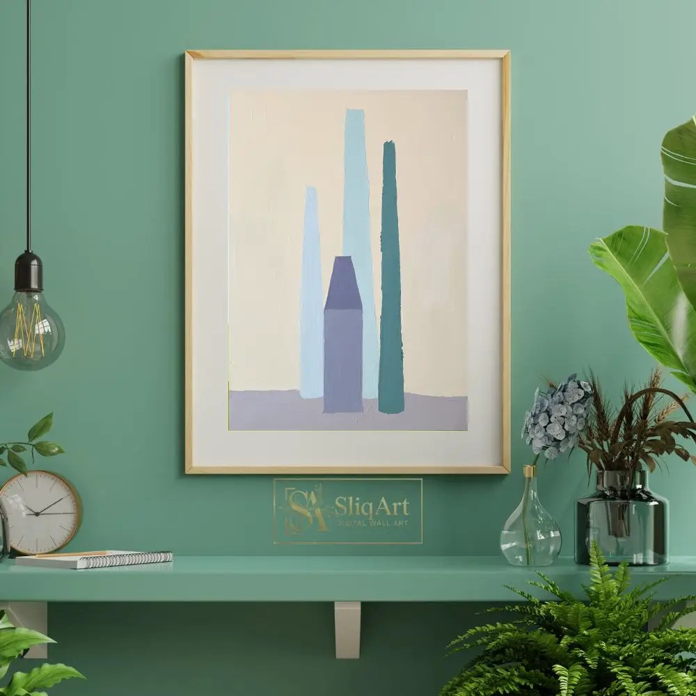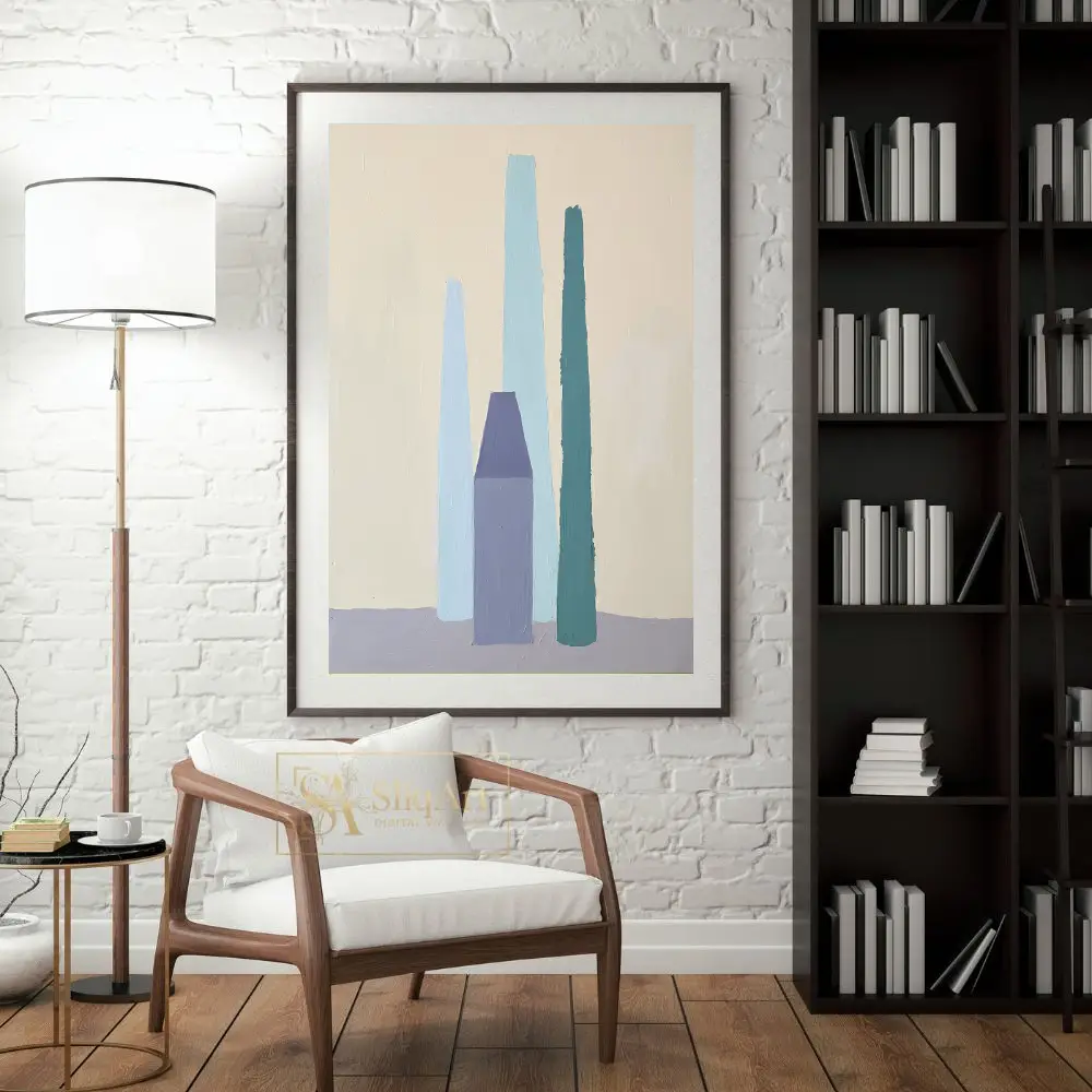 Enhance your interior design with this sophisticated minimalist abstract piece. The artwork features elongated, vertical forms reminiscent of architectural structures or glass vessels, rendered in a calming palette of sky blue, deep teal, and muted lavender.