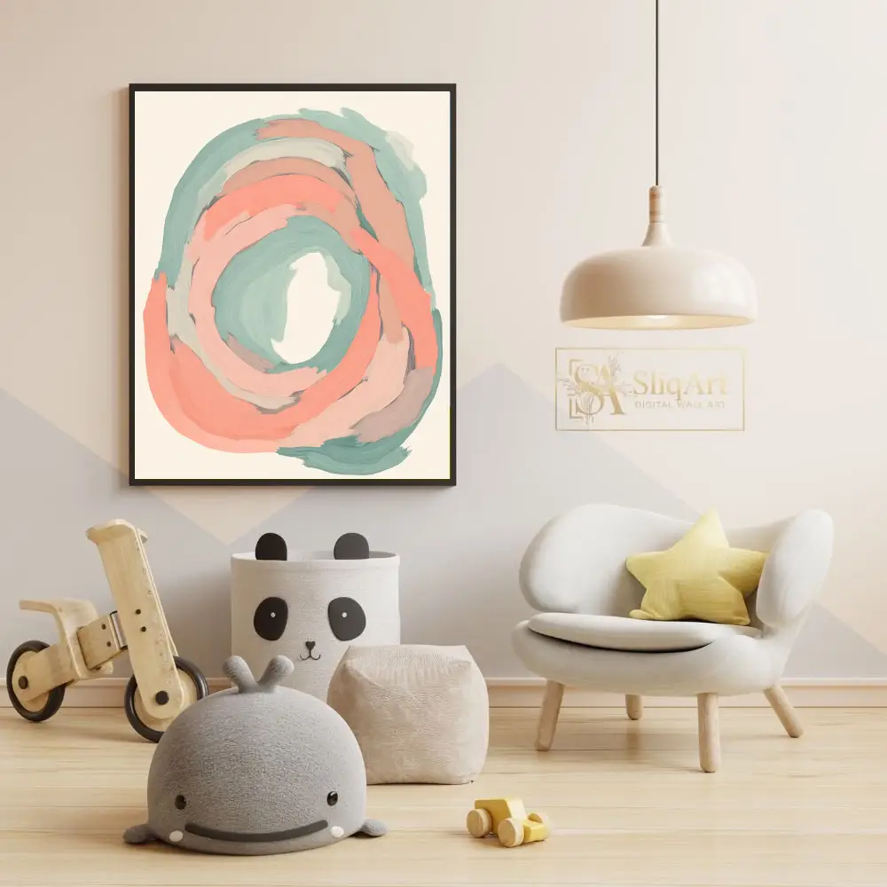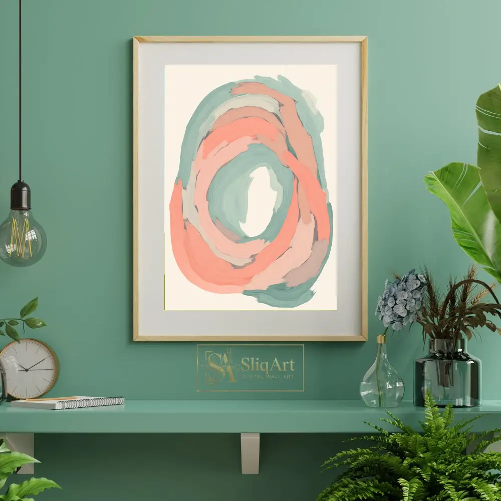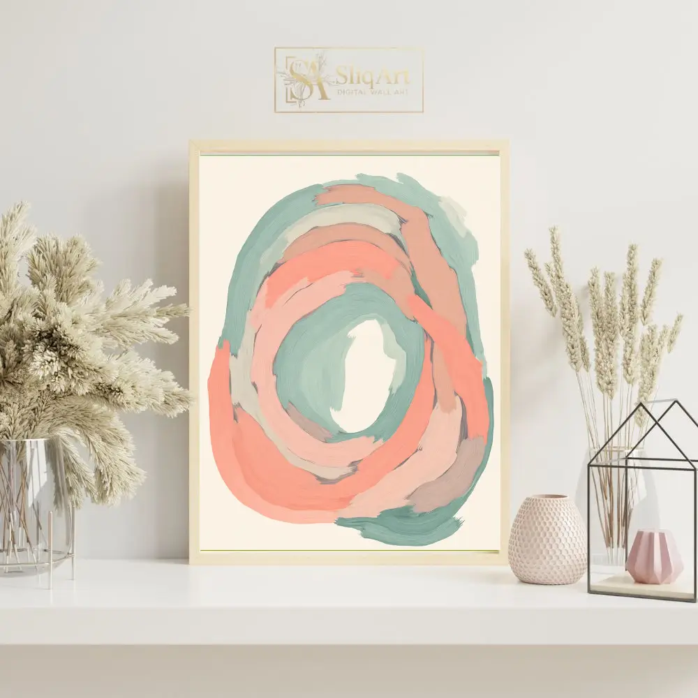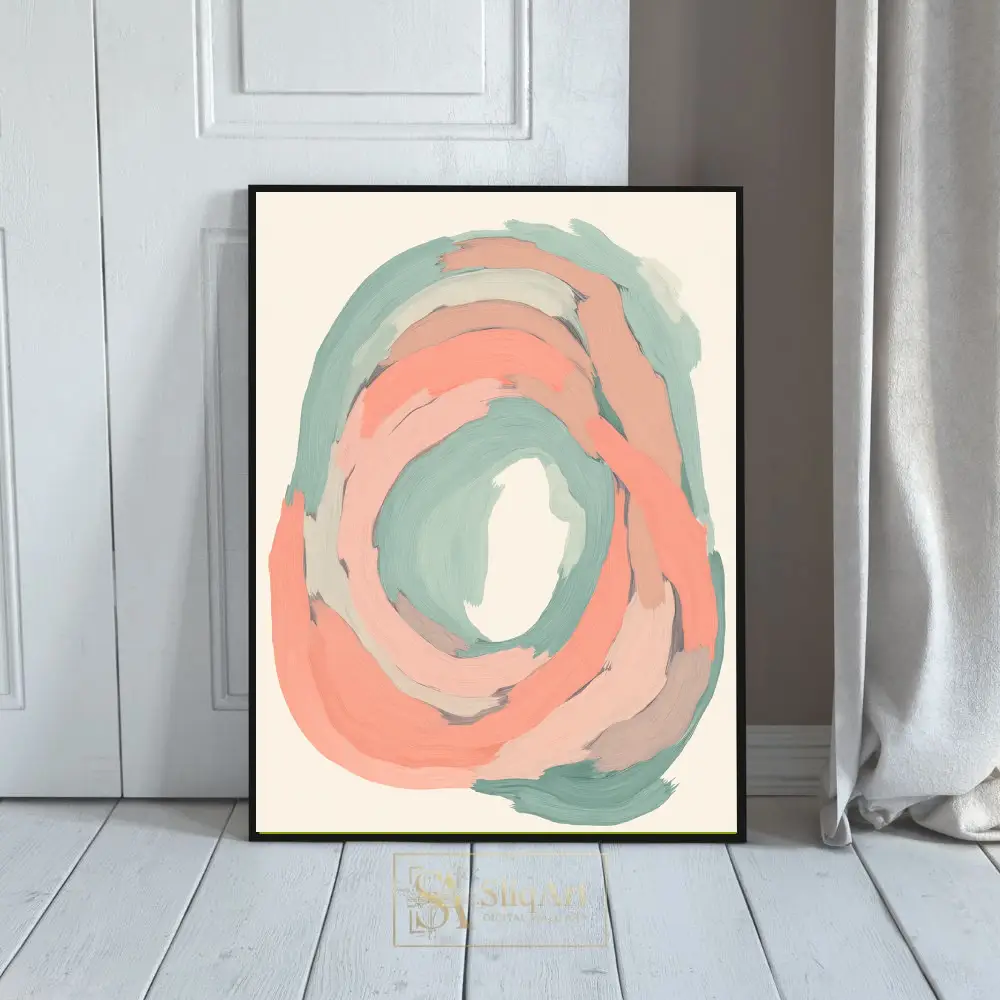 This captivating abstract art piece features organic, circular brushstrokes in a soothing palette of peach, salmon, and sage green. The thick, textured appearance of the strokes creates a sense of depth and movement, reminiscent of a natural vortex or a cozy nest.