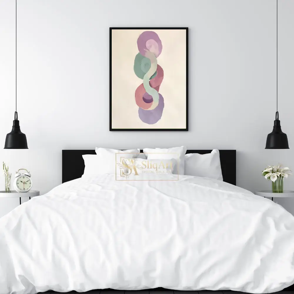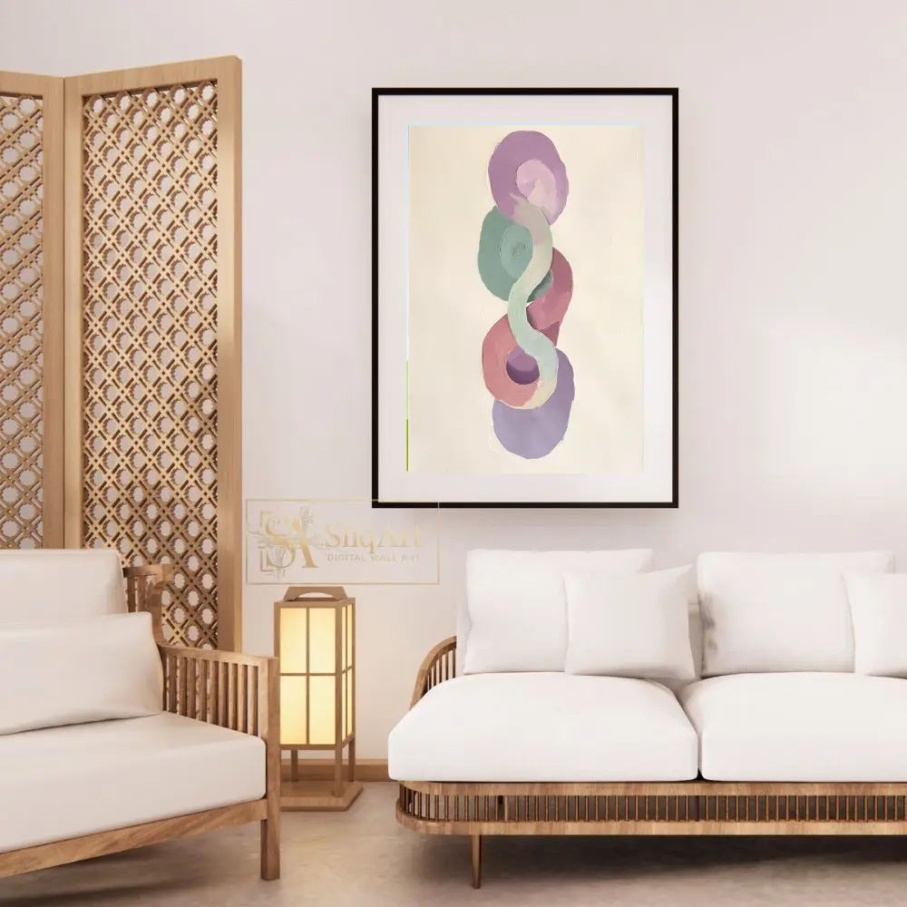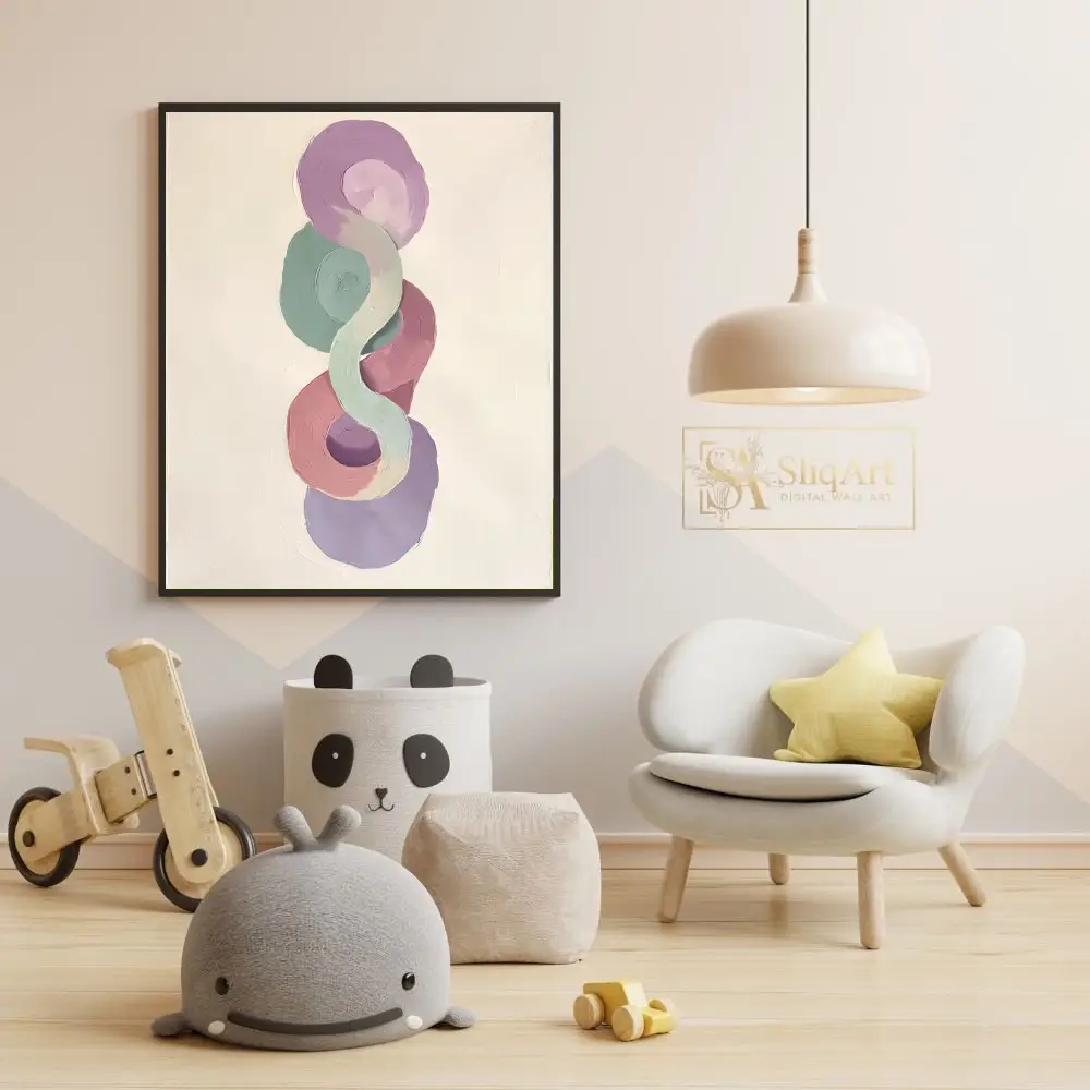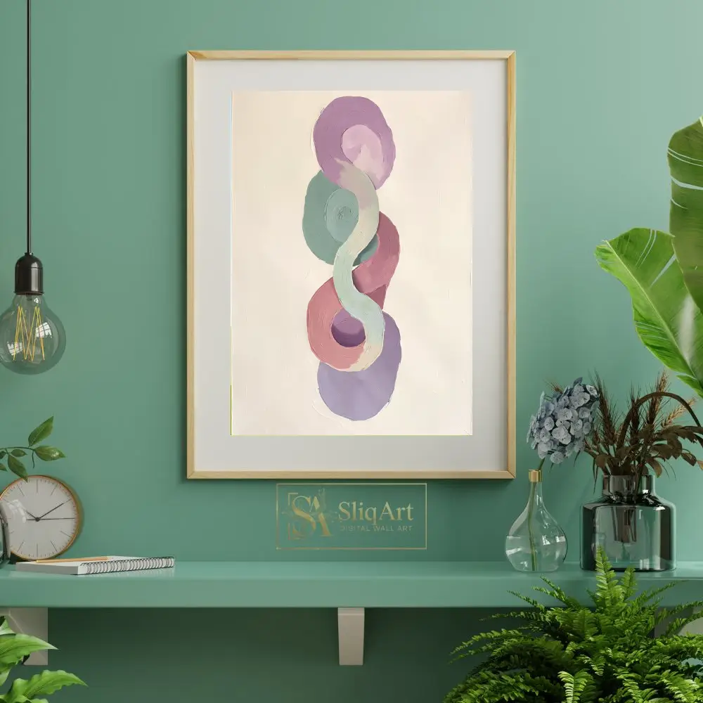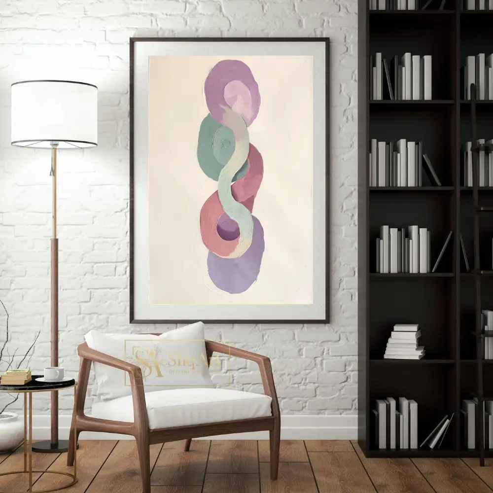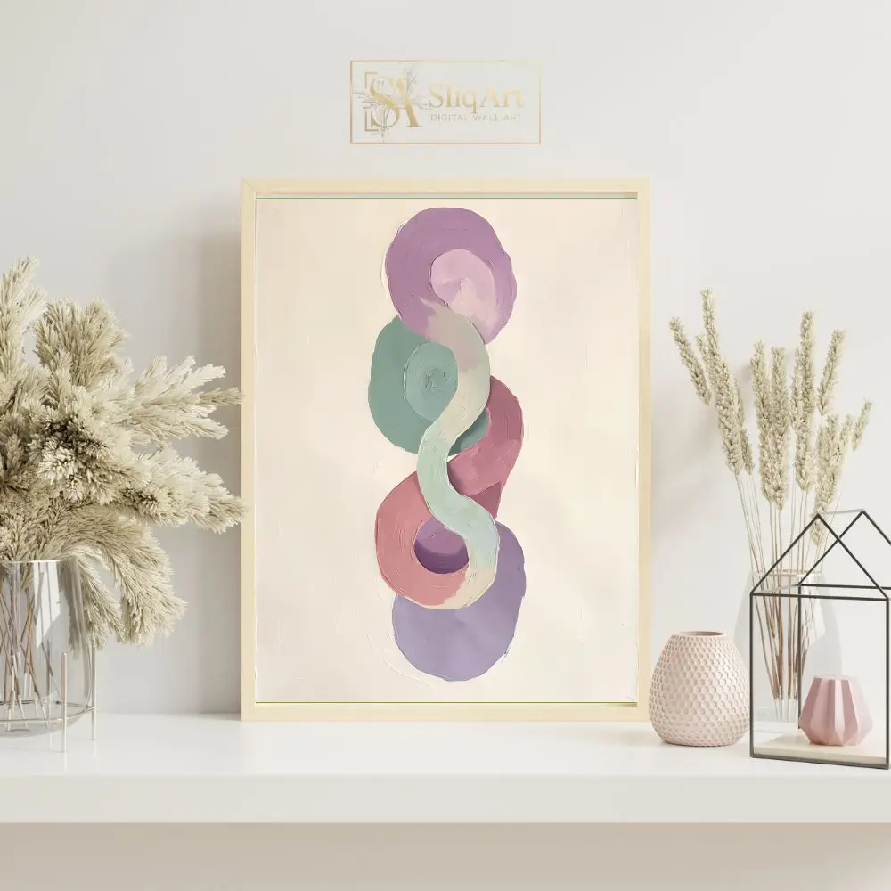 Elevate your interior with ‘Serene Pastel Swirls,’ a masterpiece of impasto texture and soft, harmonious color. This abstract piece features a vertical arrangement of rhythmic, interlocking swirls in soothing shades of lavender, sage green, and dusty rose.