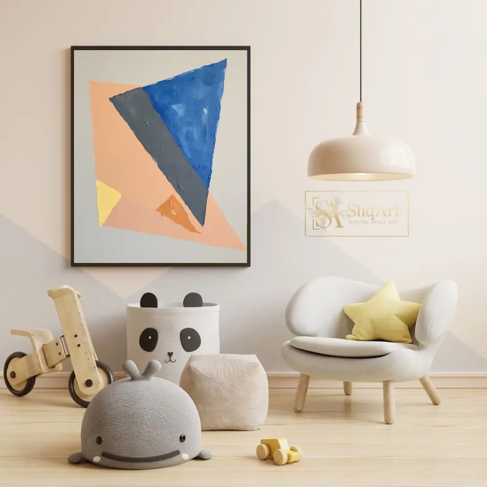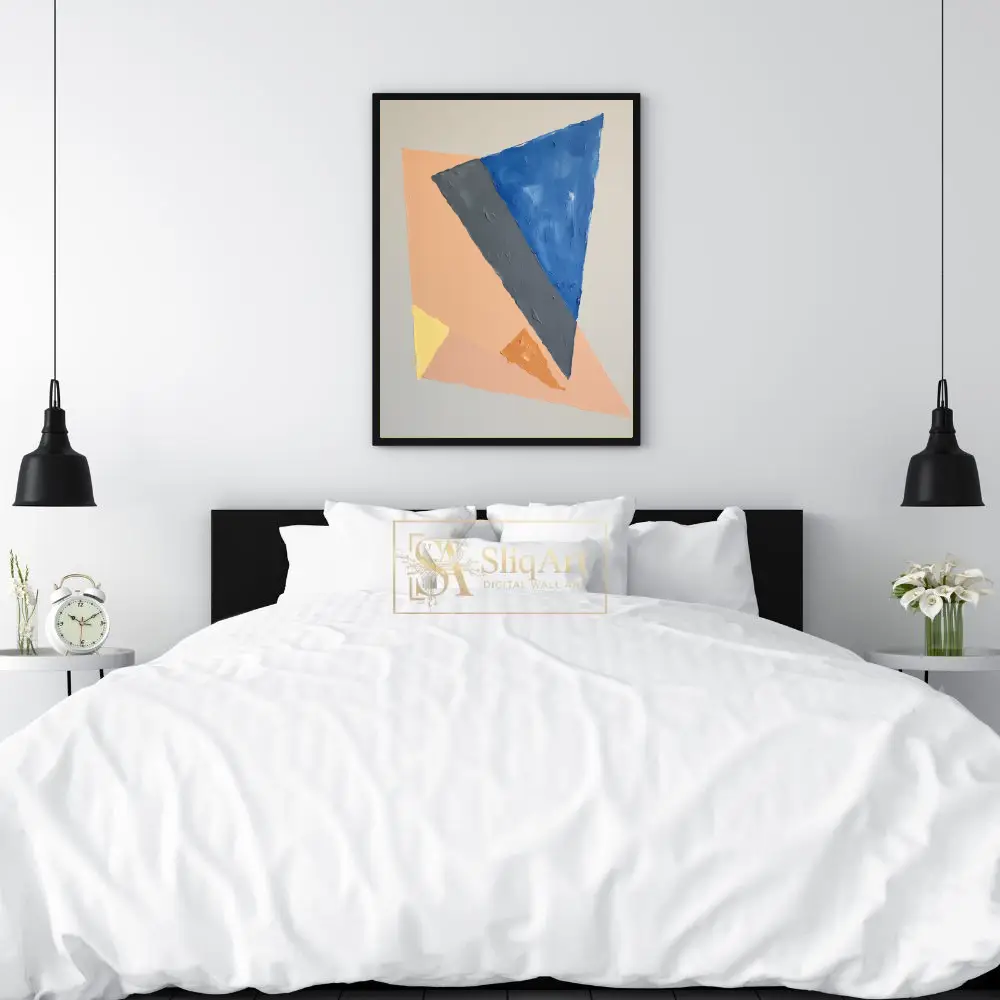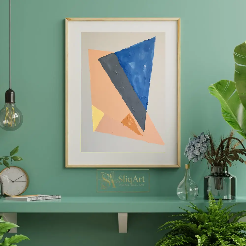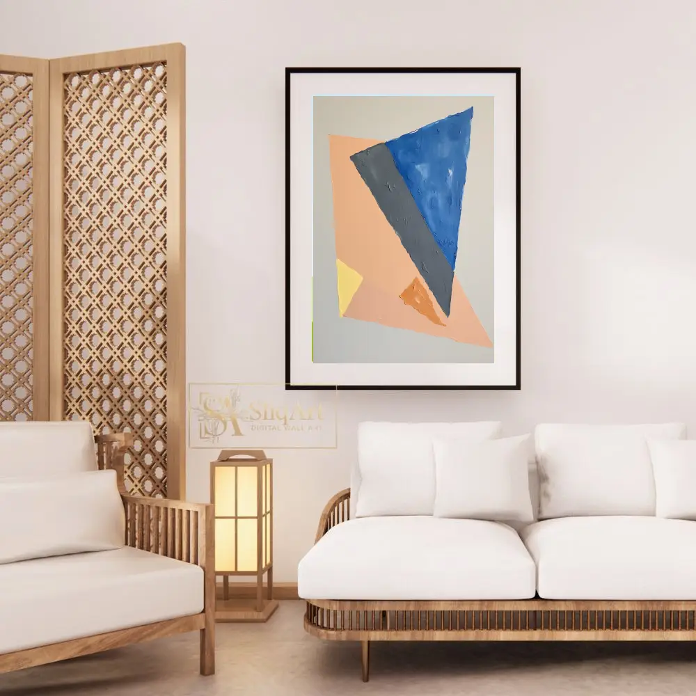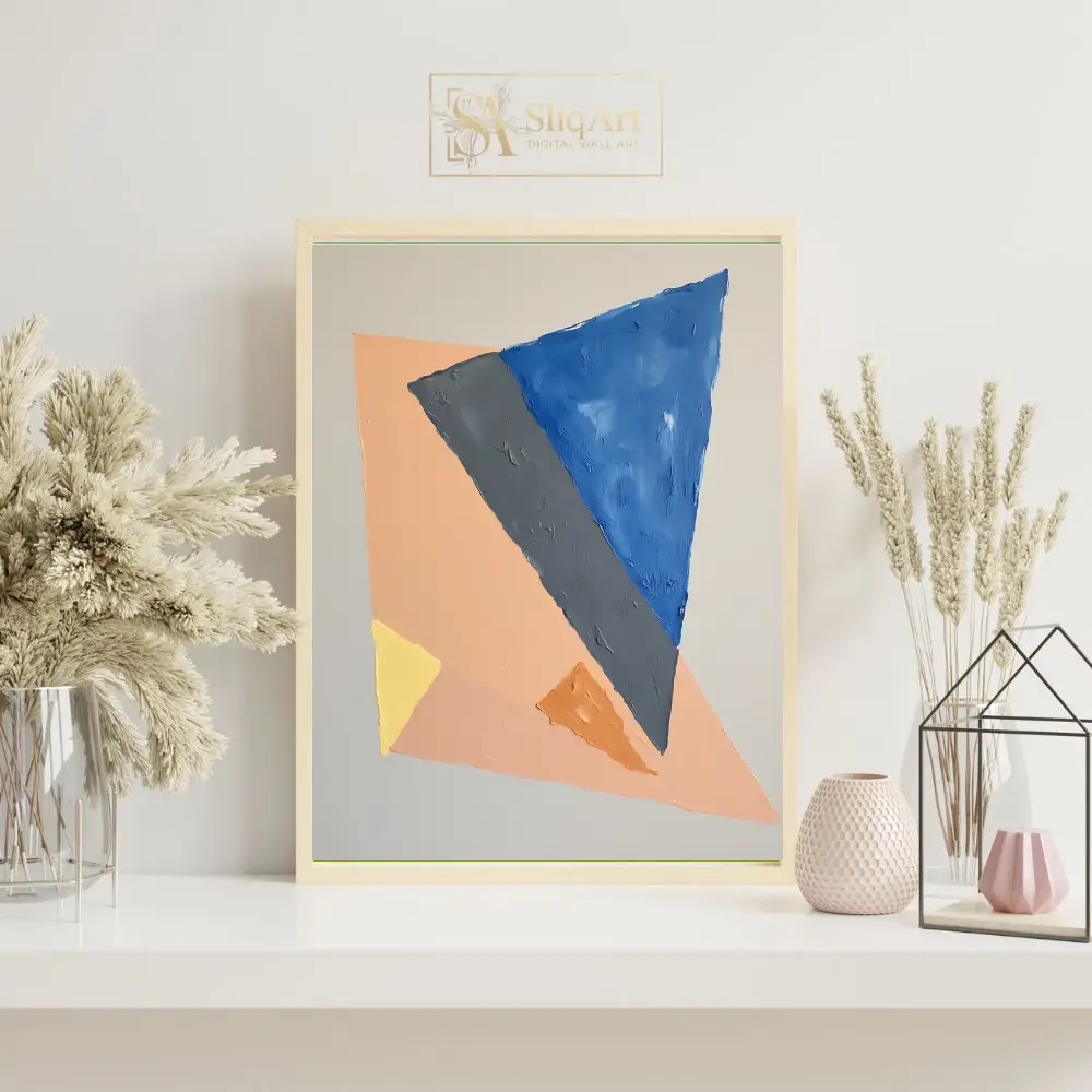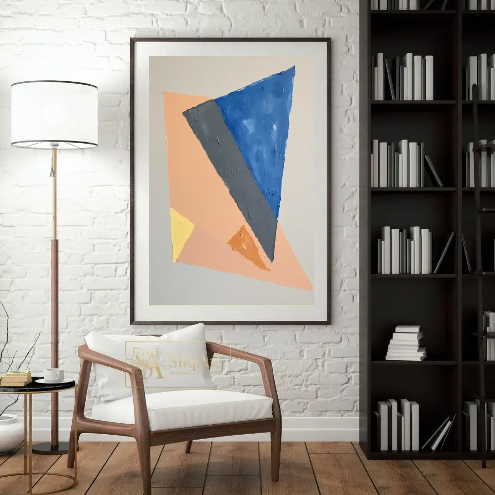Featuring bold, textured strokes of cerulean blue, slate grey, and warm peach, this piece plays with angular shapes and impasto textures to create a sense of balanced modernism. The visible brushwork adds a tactile, hand-crafted feel to the composition, making it a perfect focal point for contemporary spaces that value clean lines and sophisticated color palettes.