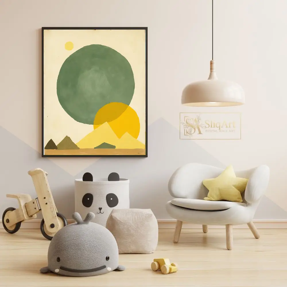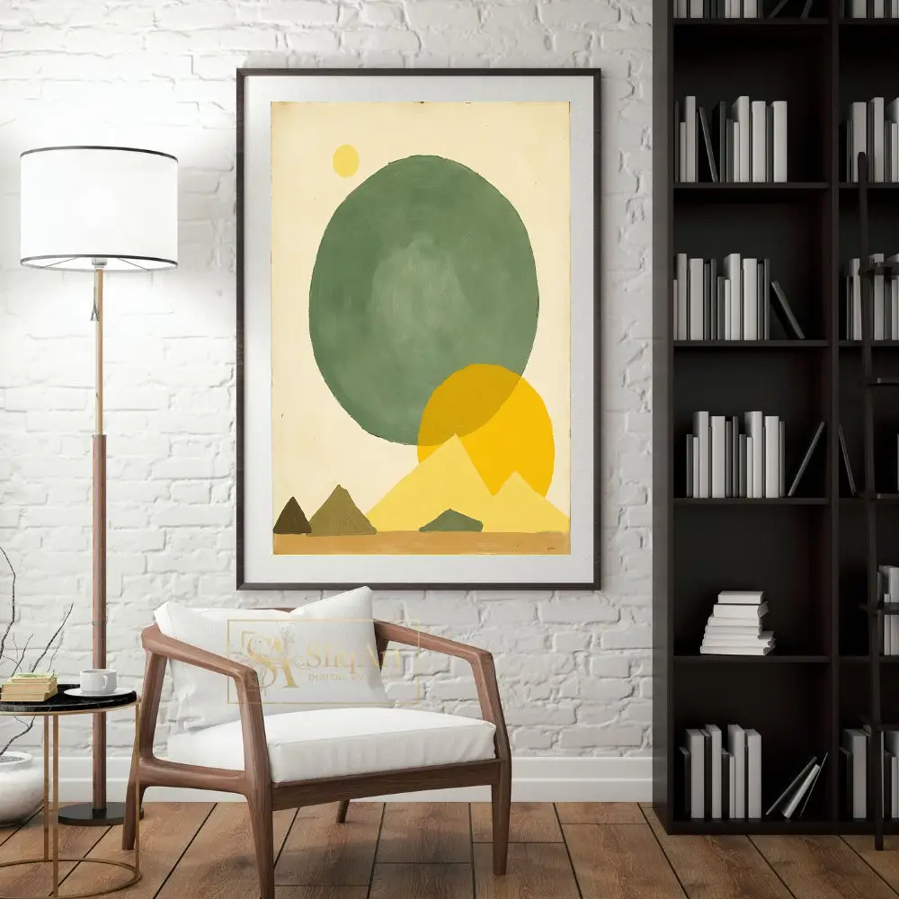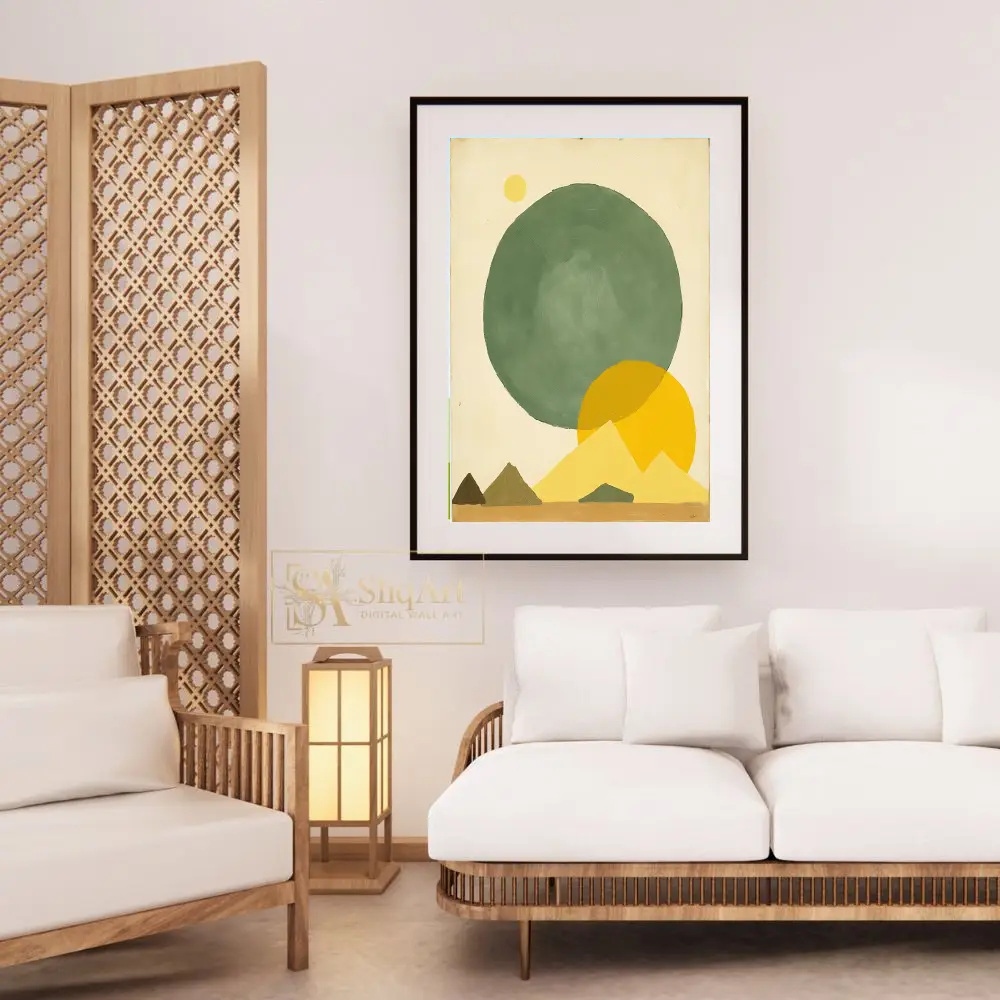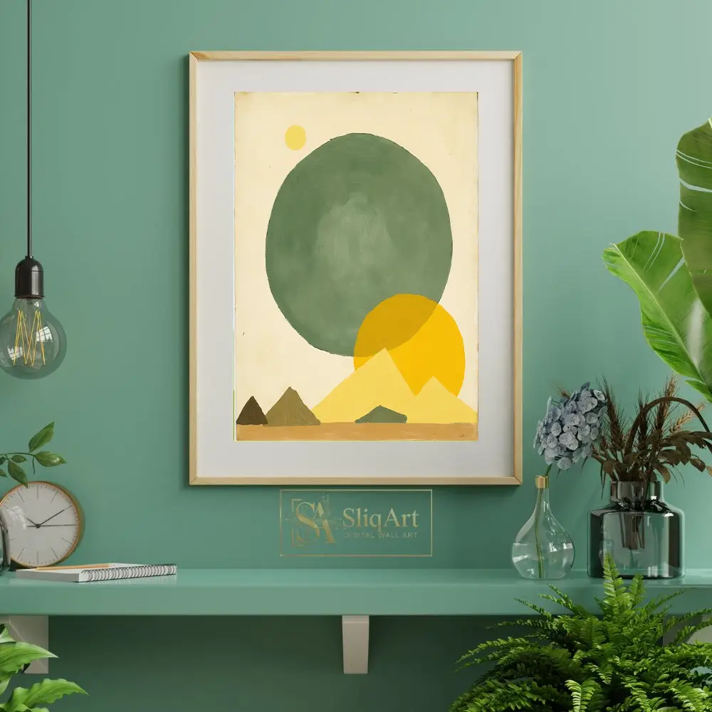 This stunning minimalist piece features a harmonious blend of geometric shapes and earthy tones, creating a serene desert-inspired landscape. A large, textured sage green circle anchors the composition, contrasted by vibrant ochre suns and stylized triangular mountains.