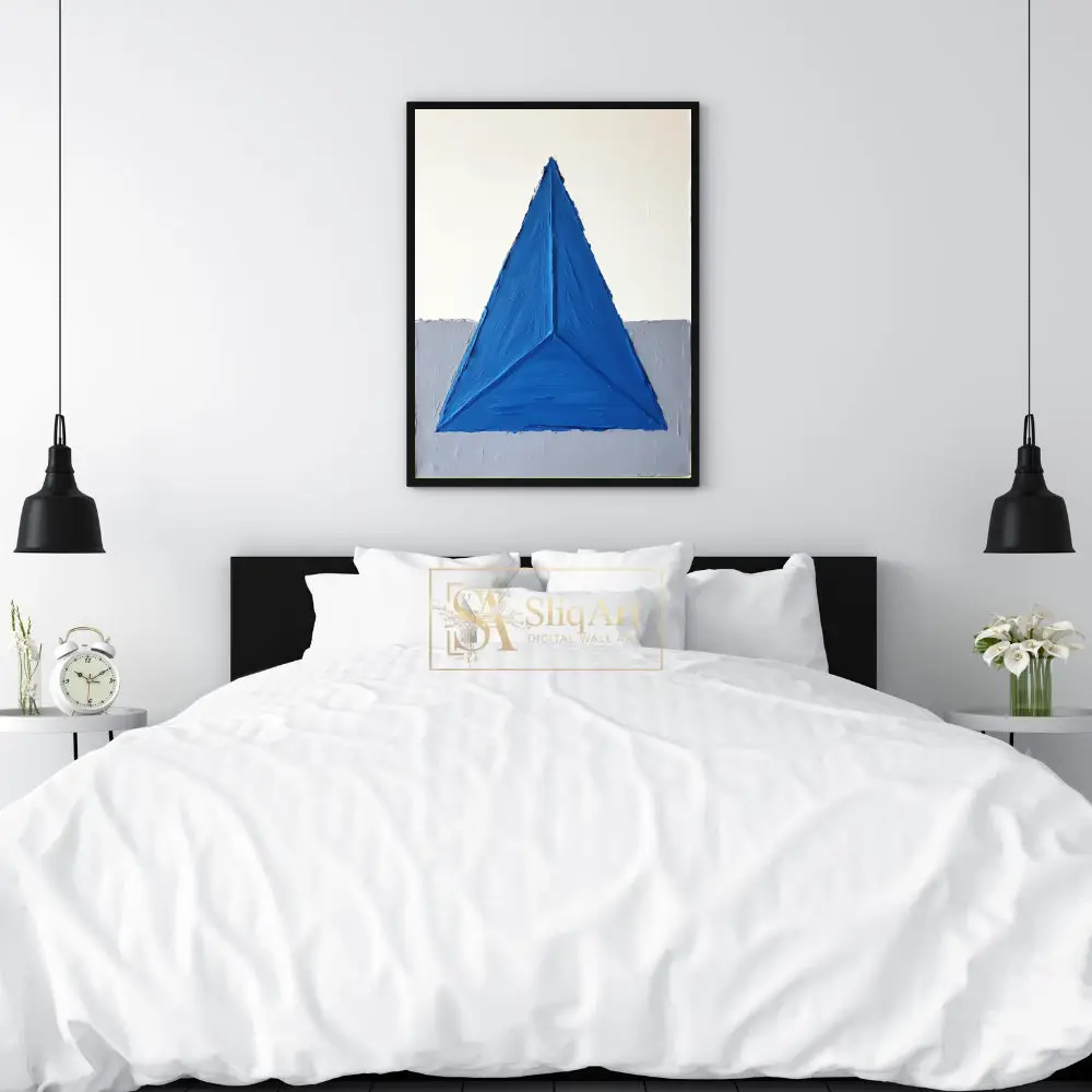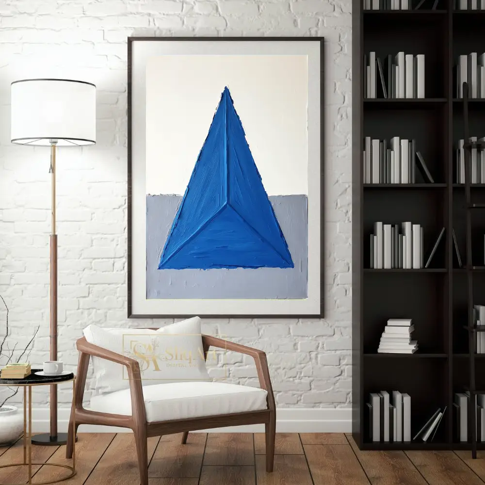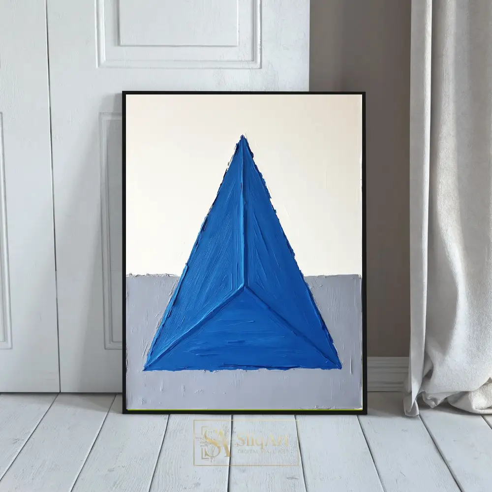 This striking piece of abstract art features a bold, textured blue triangle that dominates the composition, creating a sense of balance and focus. The impasto technique adds a tactile dimension, making the vibrant blue pop against the minimalist background of crisp white and soft gray.