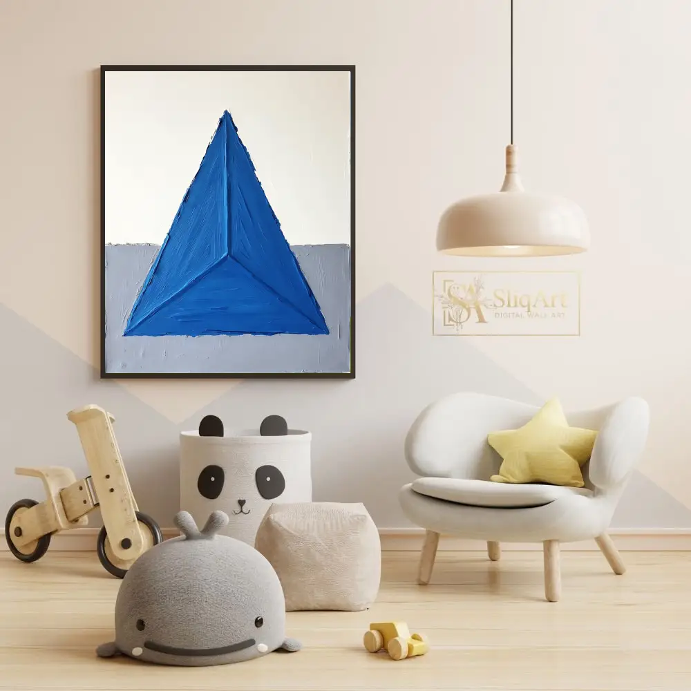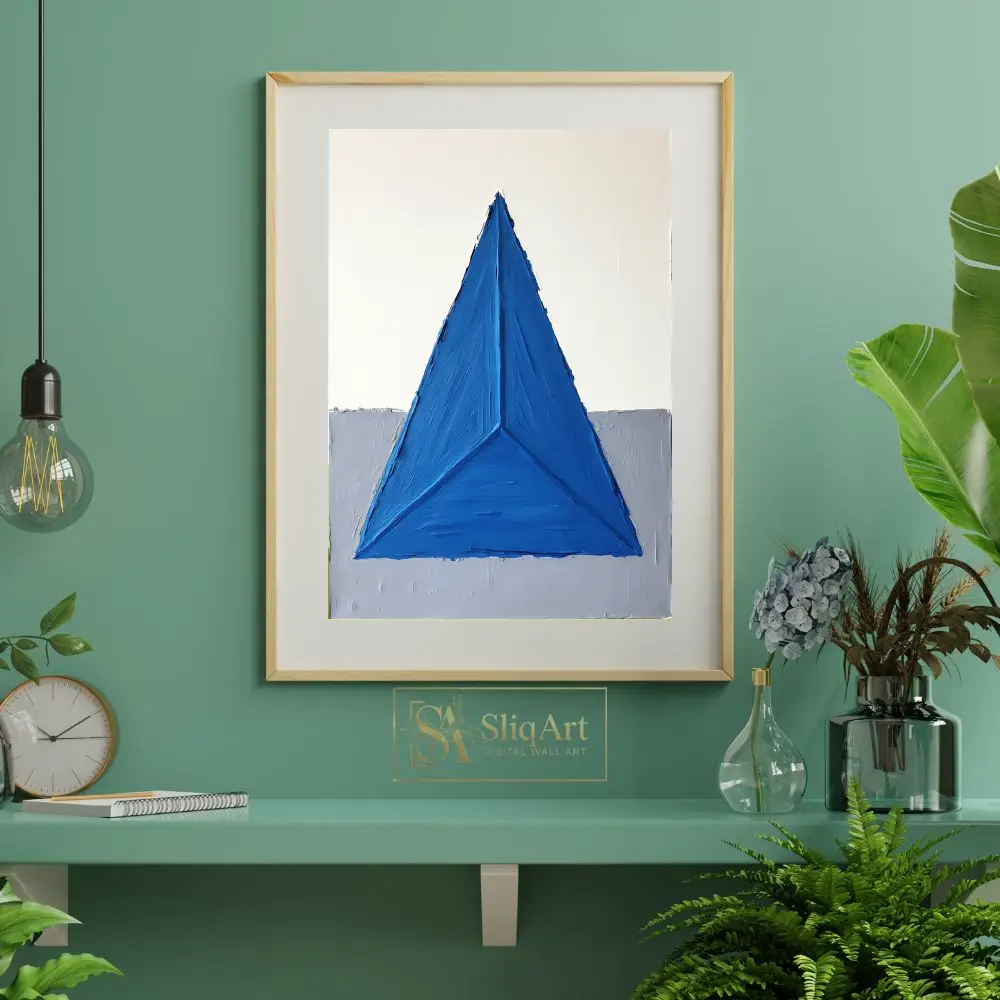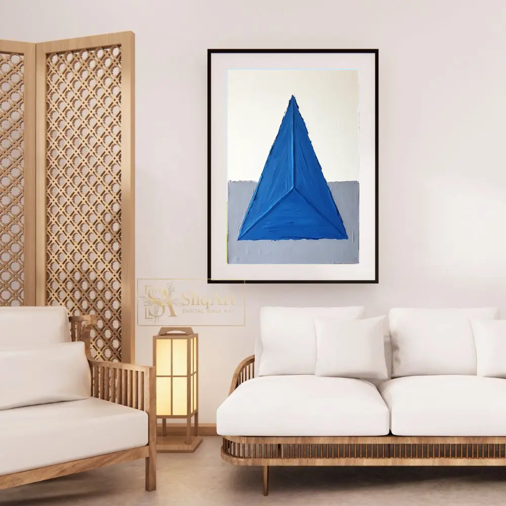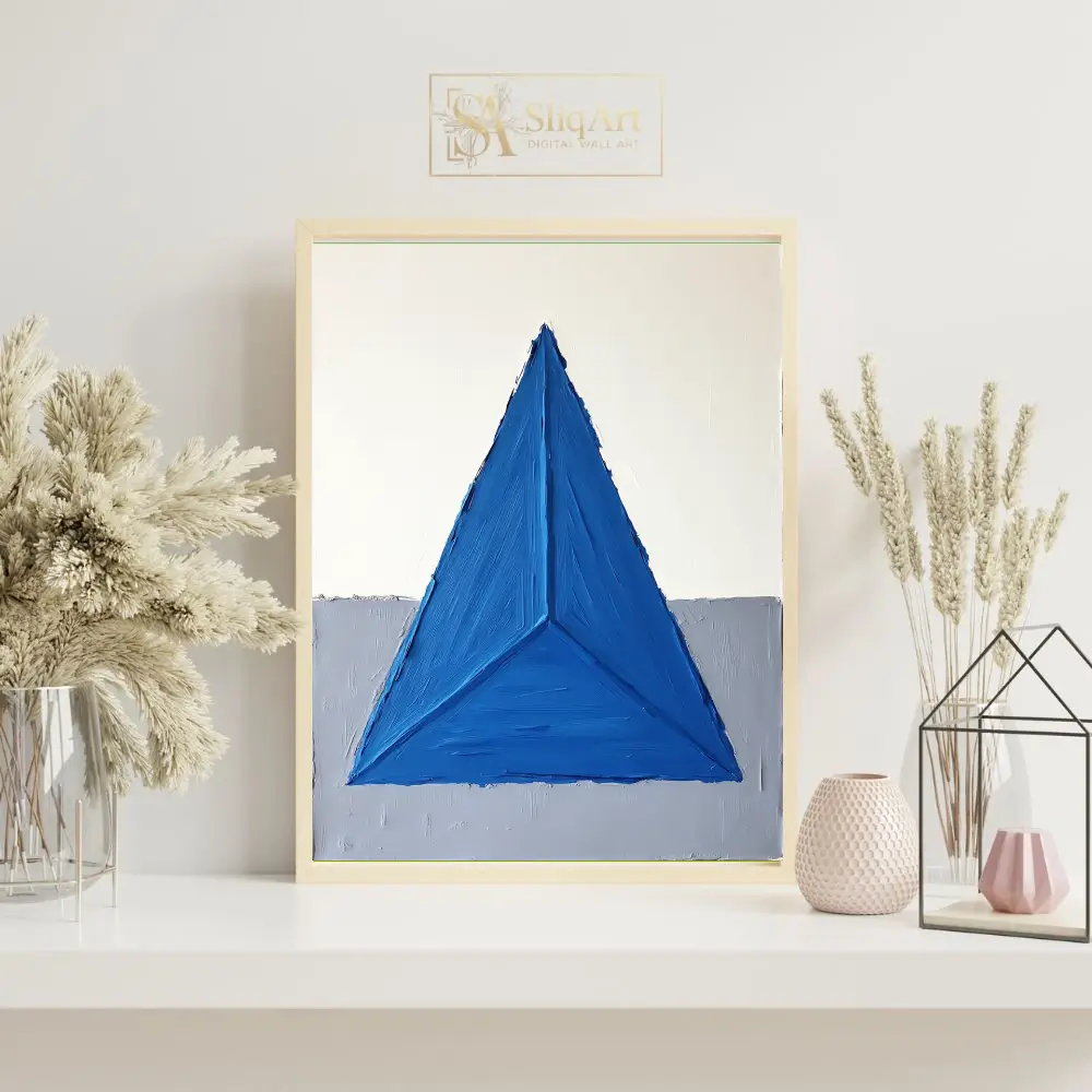This striking piece of abstract art features a bold, textured blue triangle that dominates the composition, creating a sense of balance and focus. The impasto technique adds a tactile dimension, making the vibrant blue pop against the minimalist background of crisp white and soft gray.