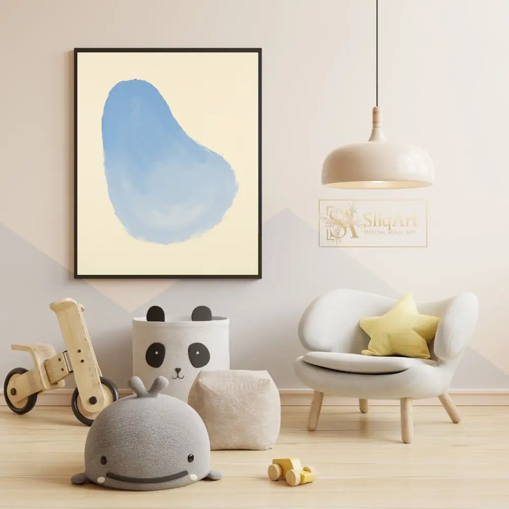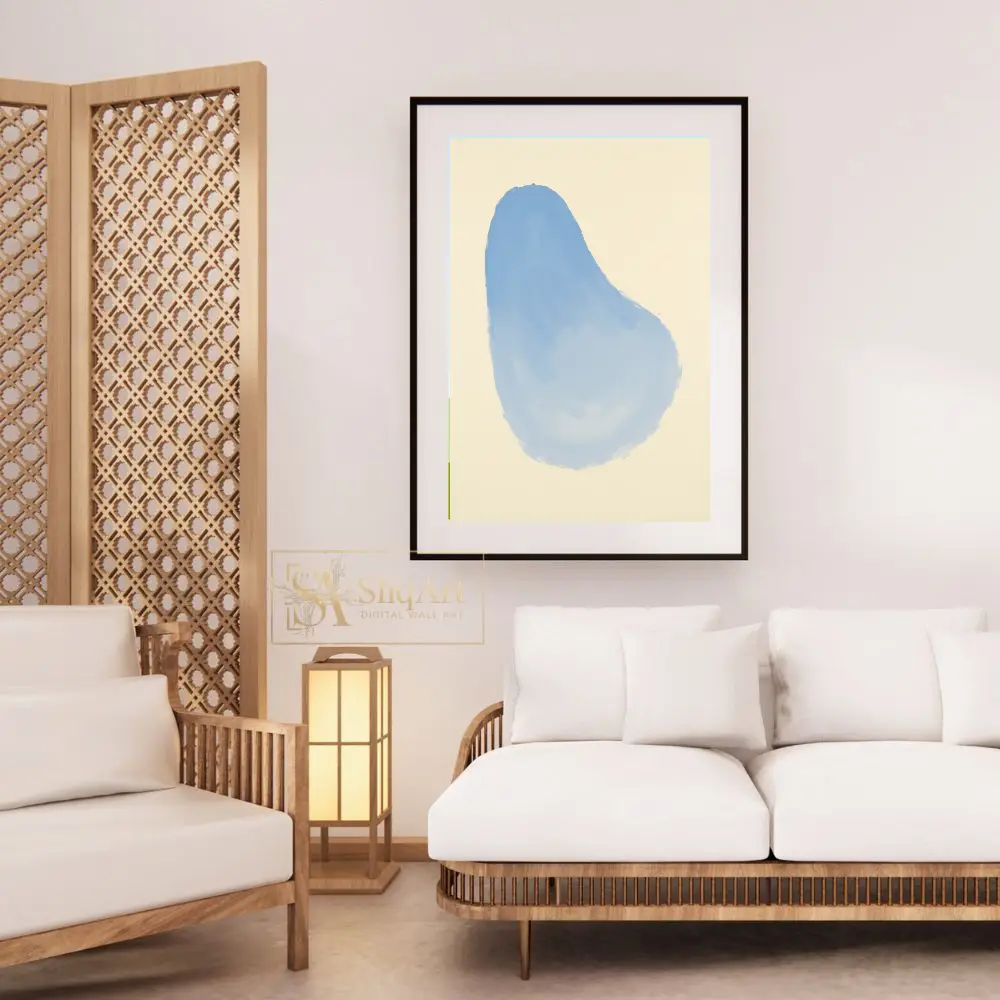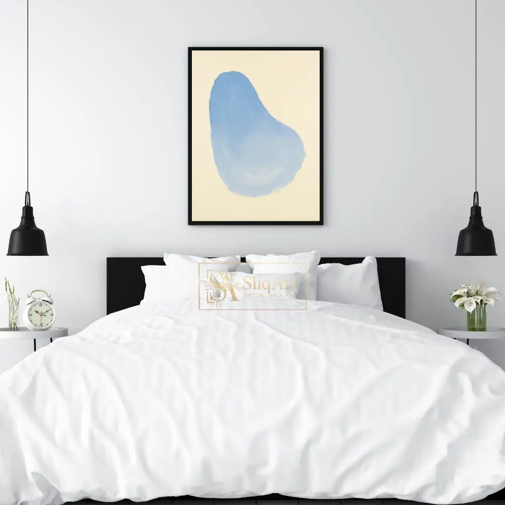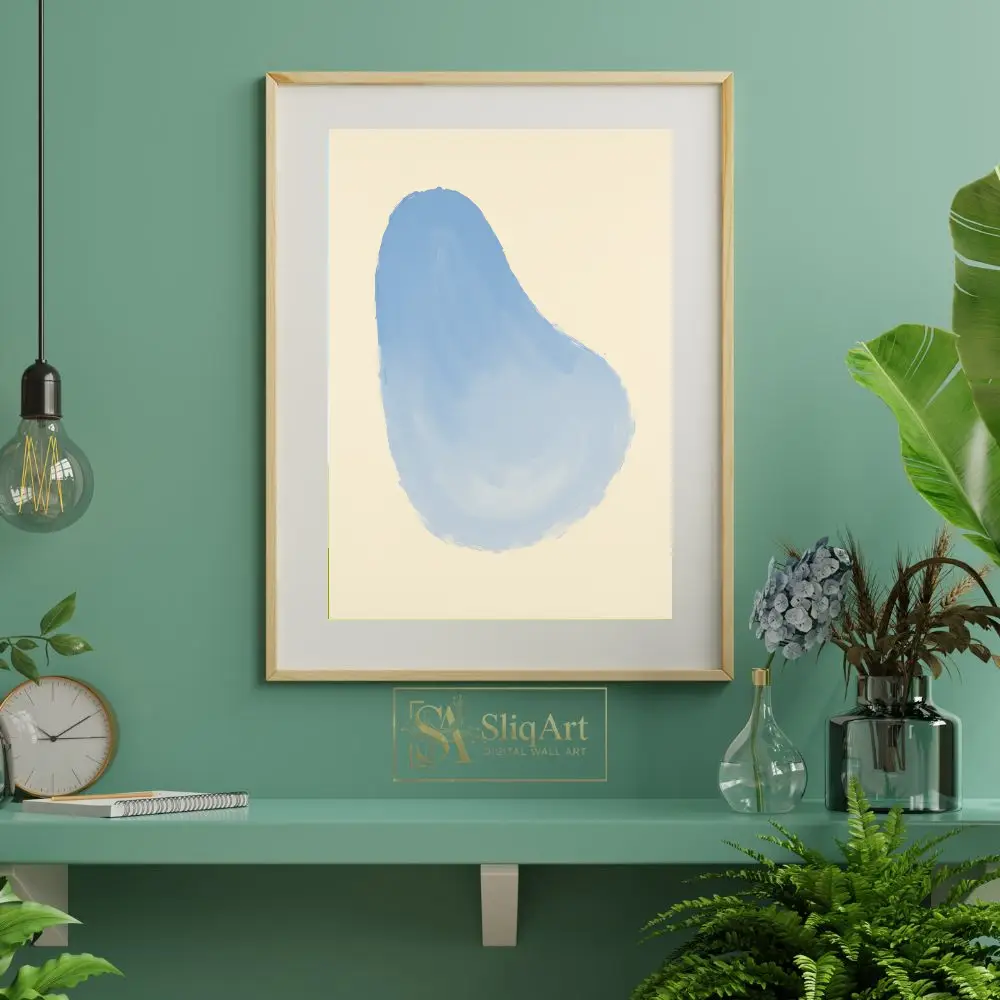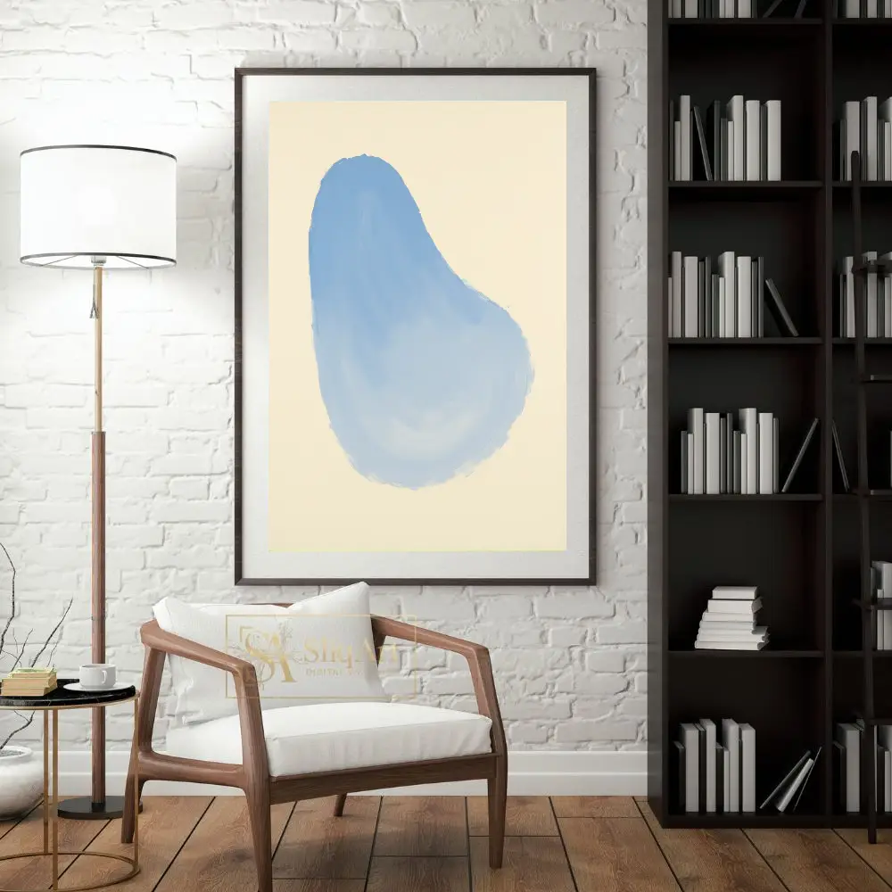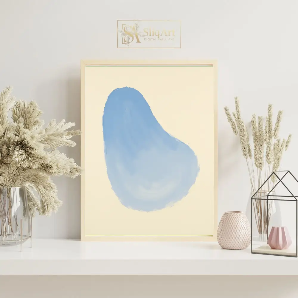 Elevate your interior with this serene minimalist abstract piece. Centered on a warm cream background, a single, fluid organic shape is rendered in a calming shade of cornflower blue.