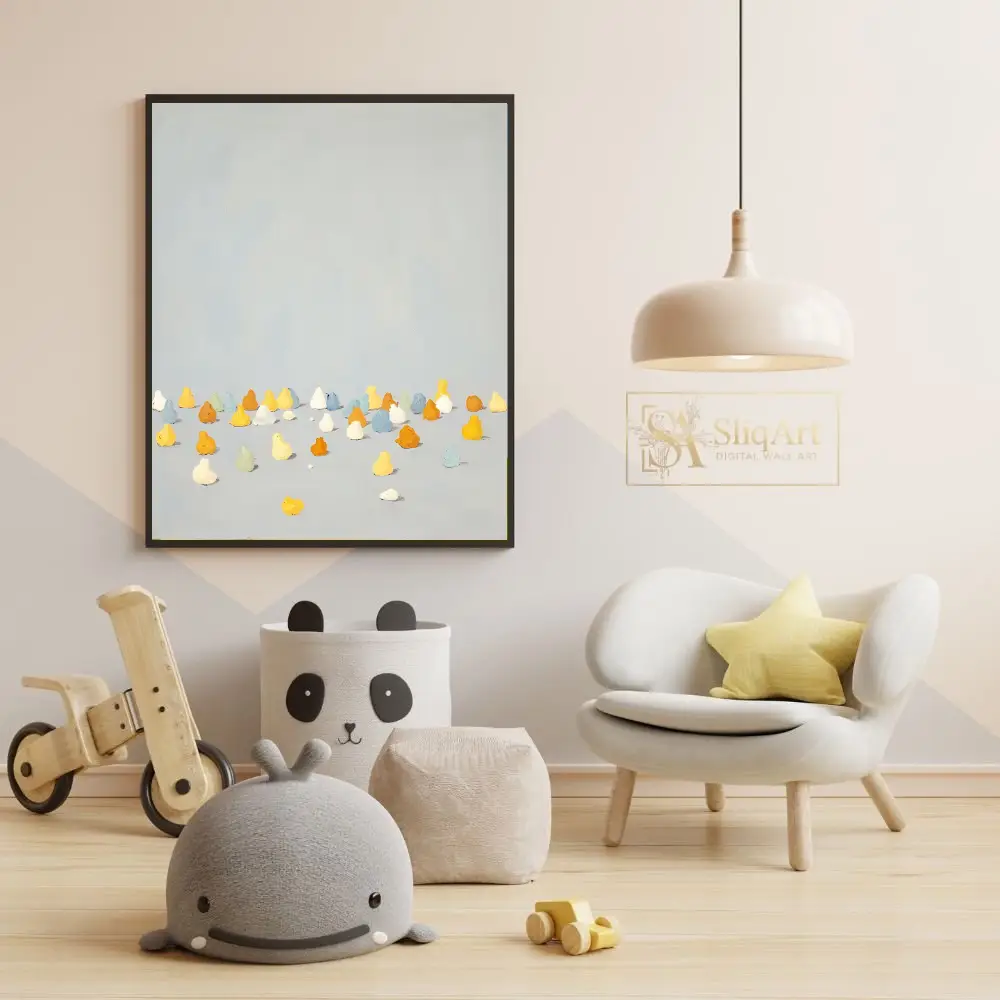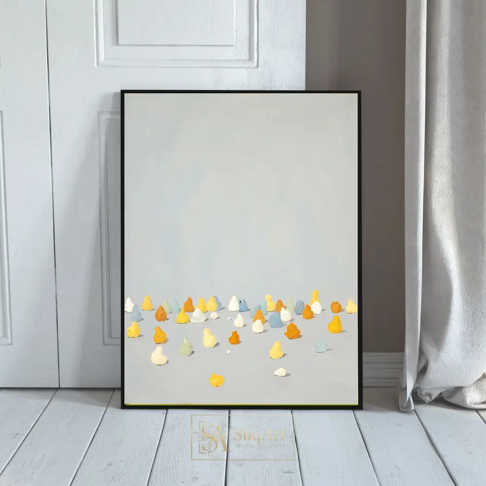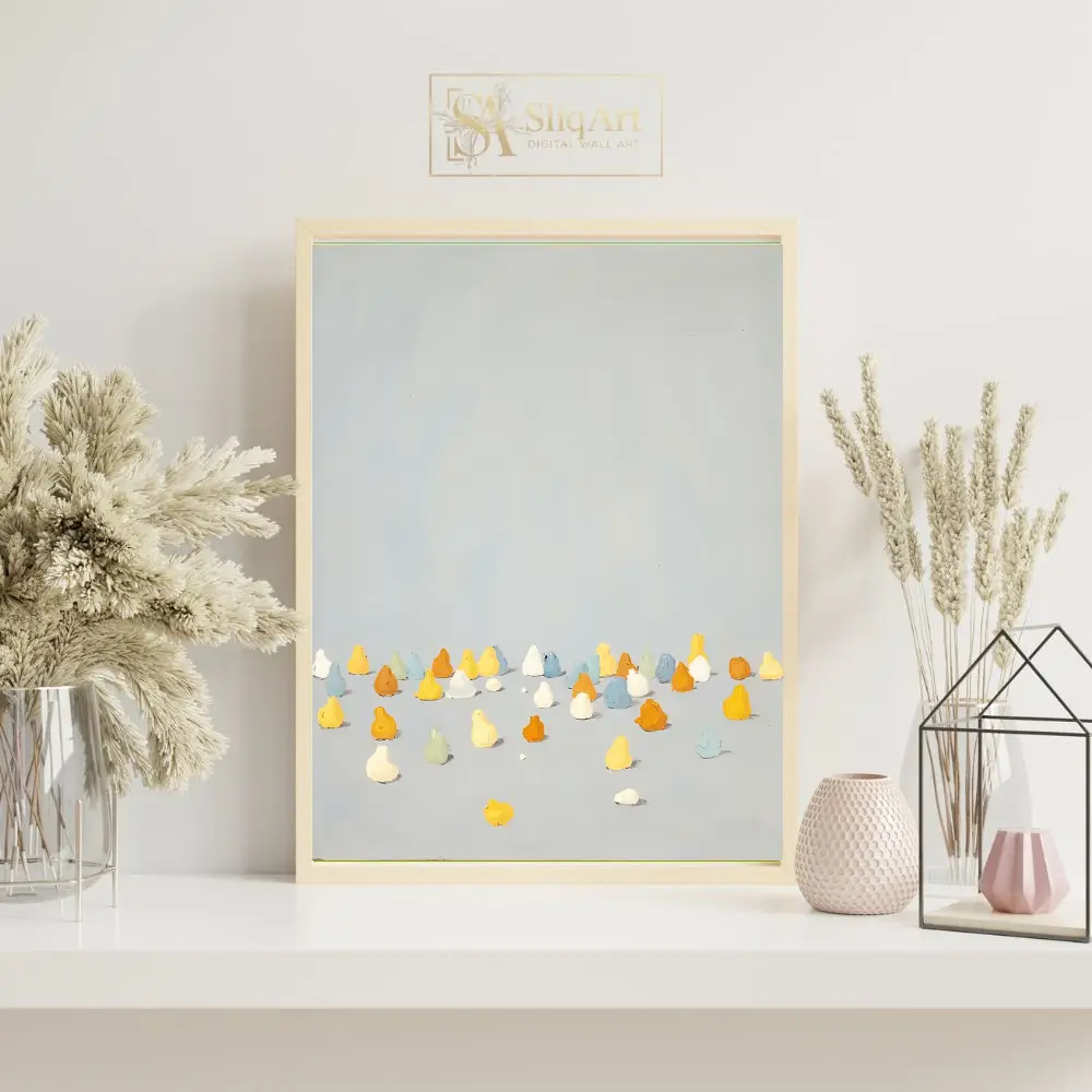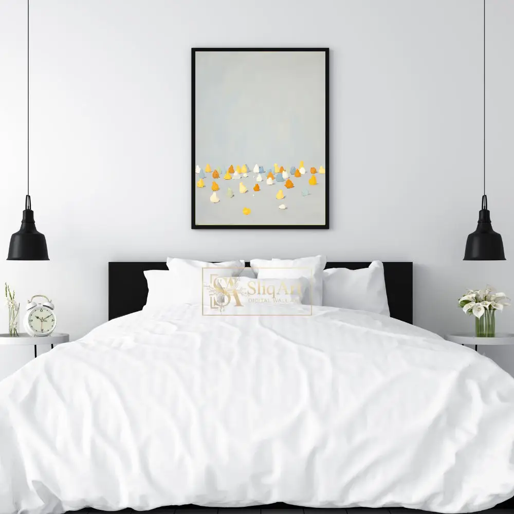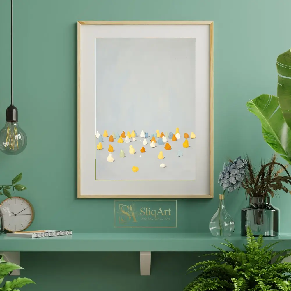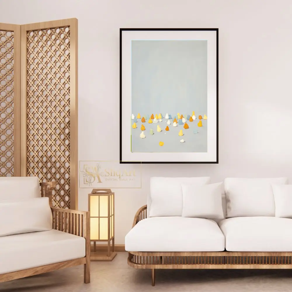 The harmonious blend of sunny yellow, warm ochre, soft white, and muted blue creates a calming visual rhythm. Perfect for contemporary interiors, this piece balances minimalist composition with expressive technique, making it a versatile addition to any curated home collection.