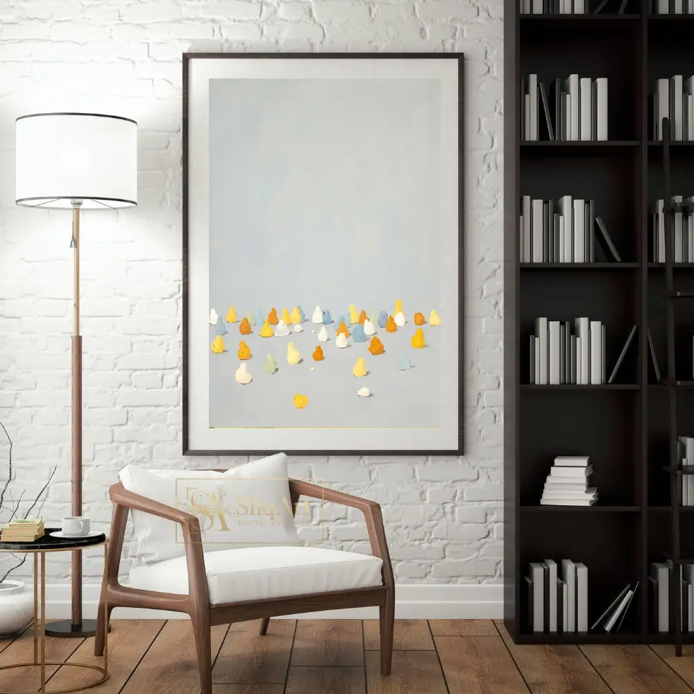 This captivating artwork features a playful yet sophisticated arrangement of stylized pear shapes scattered across a serene, pale blue horizon. Each pear is rendered with thick, impasto-style brushstrokes, adding a tactile depth and modern texture to the piece.