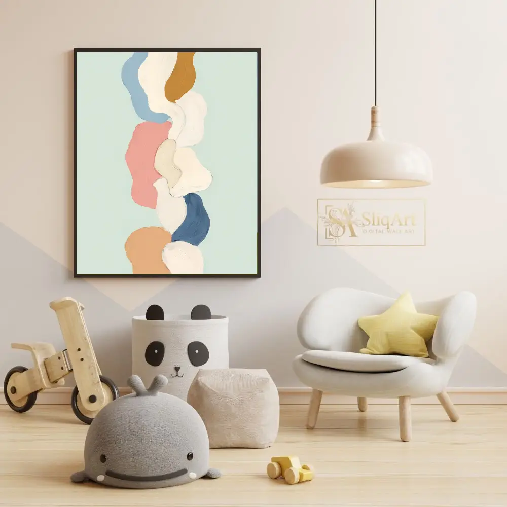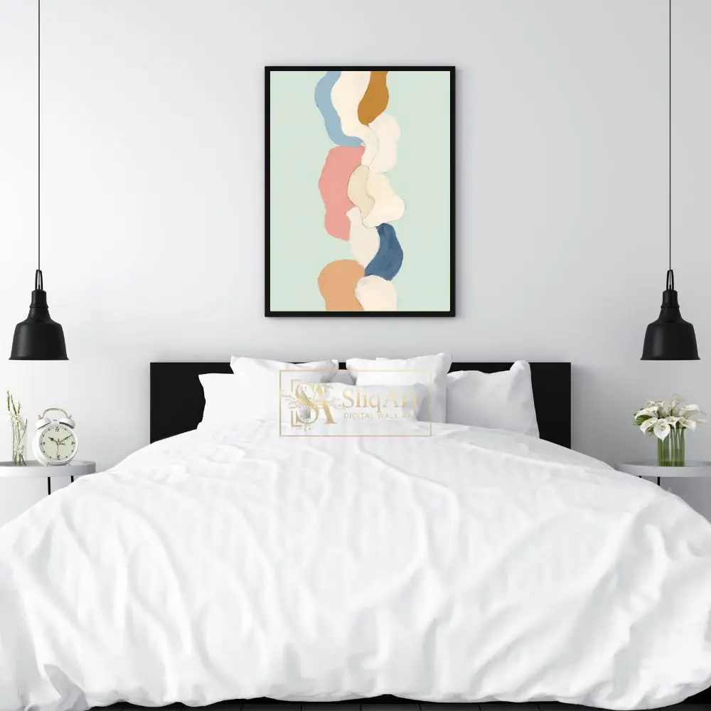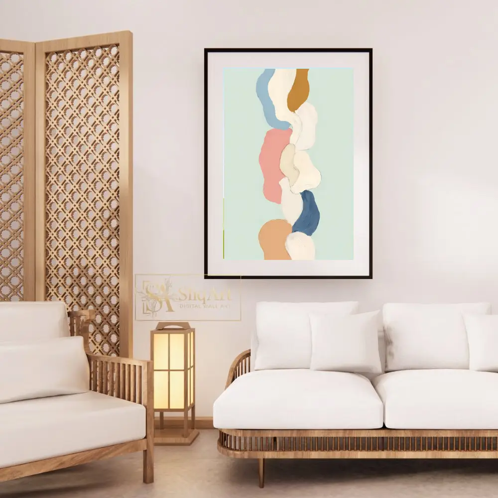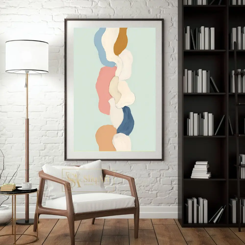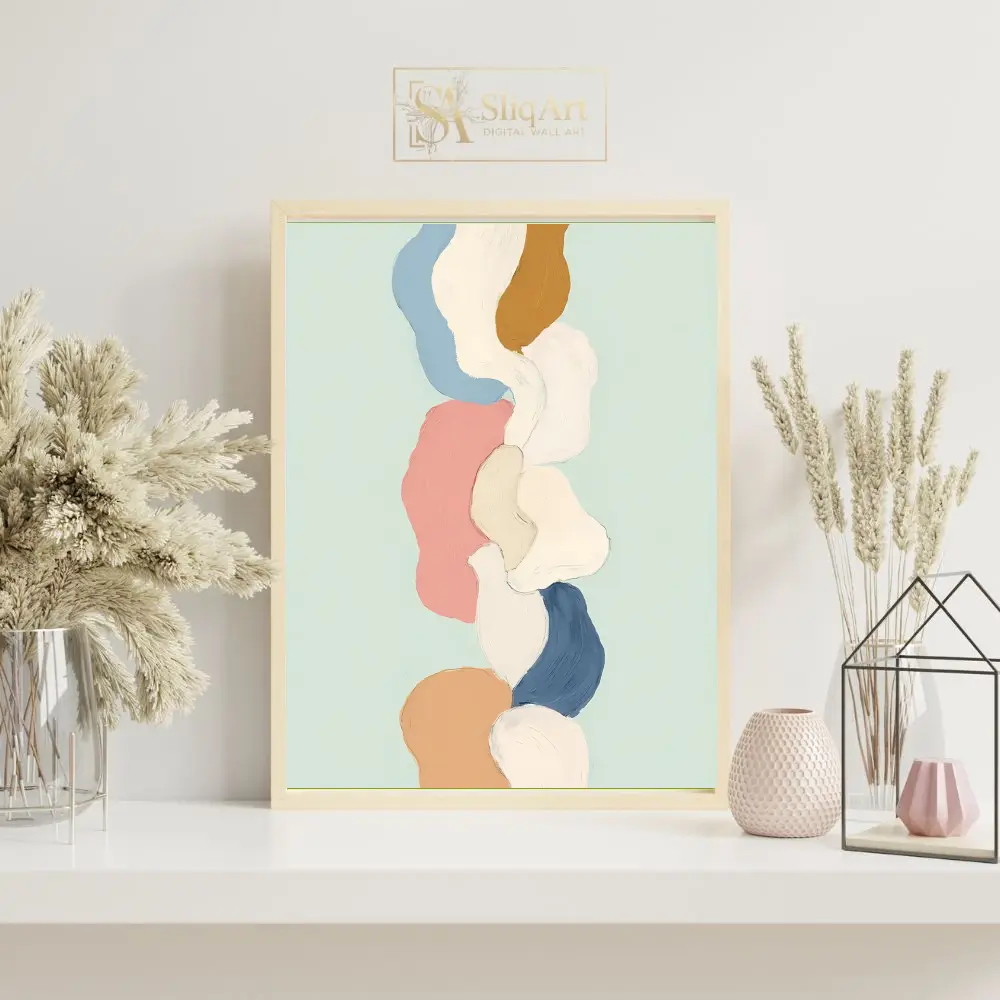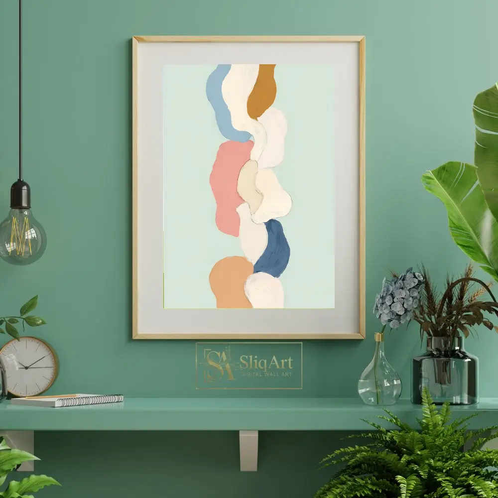 Enhance your interior decor with this captivating minimalist abstract art piece. Featuring a vertical stack of overlapping organic forms, this artwork showcases a sophisticated palette of dusty rose, ochre, navy, and cream set against a soothing mint green backdrop.