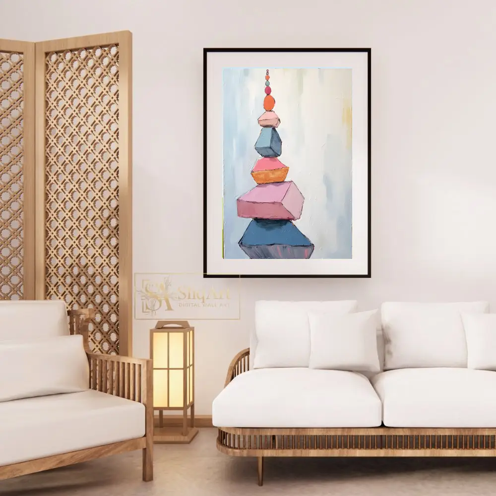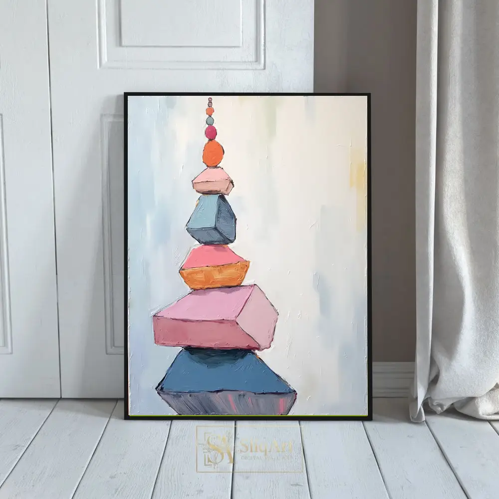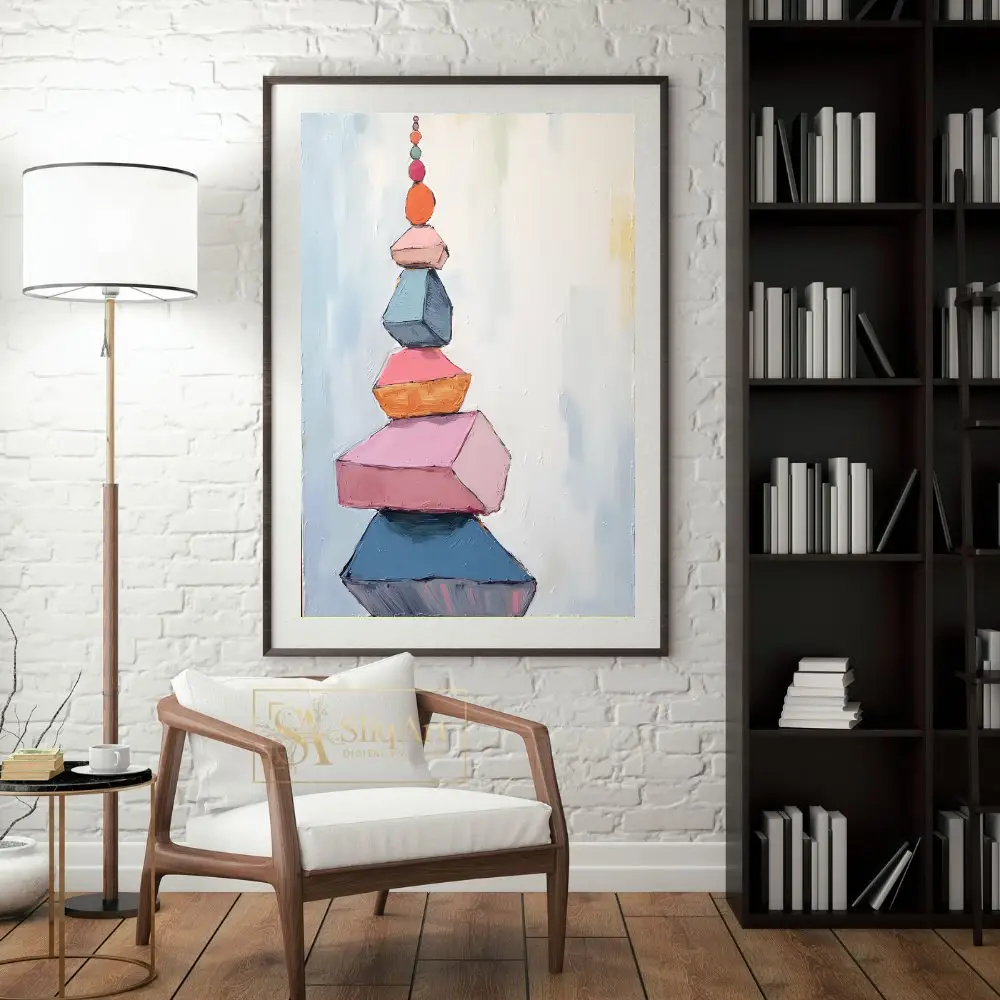 This balanced composition, reminiscent of a modern stone cairn, brings a sense of playful stability and contemporary sophistication to any wall. The neutral, textured background ensures the vibrant colors and structured shapes remain the central focal point of the room.