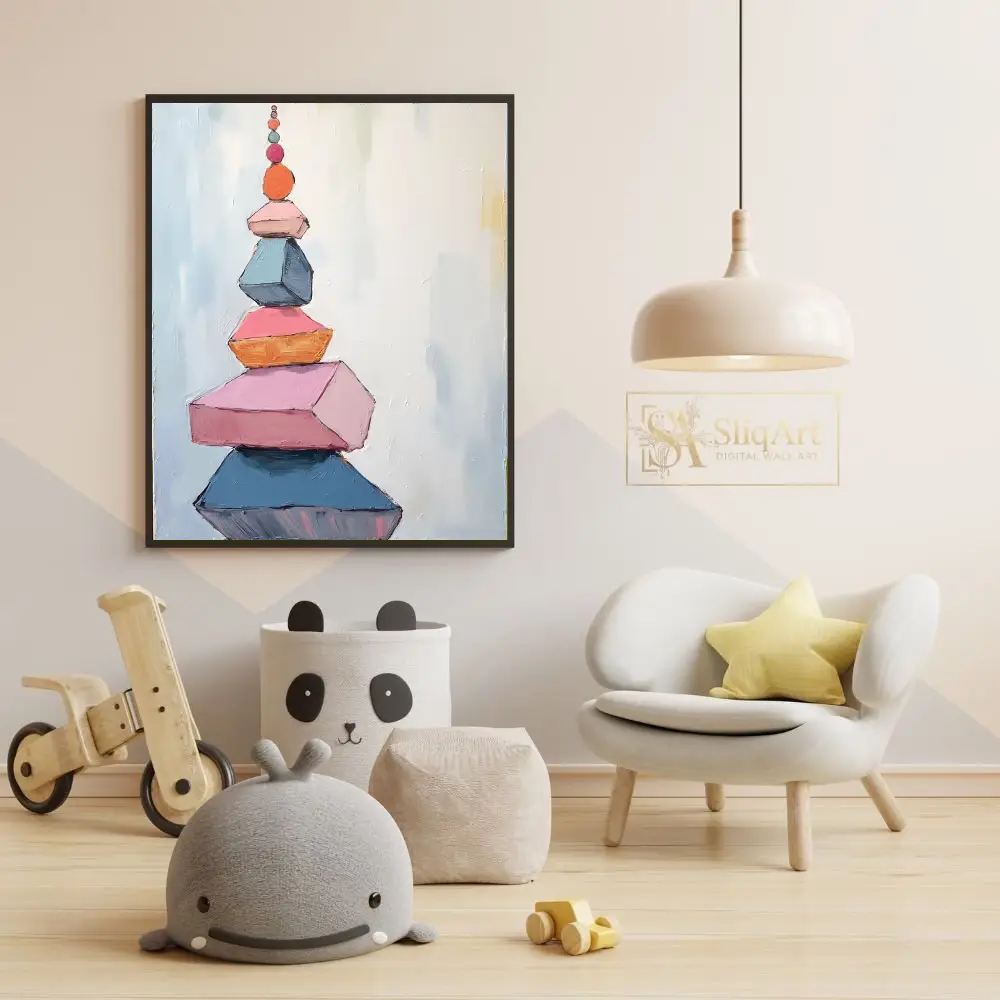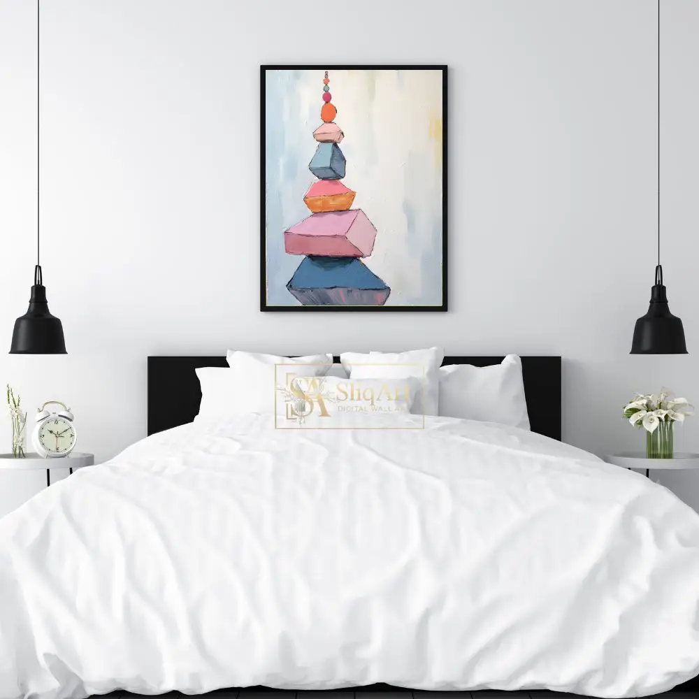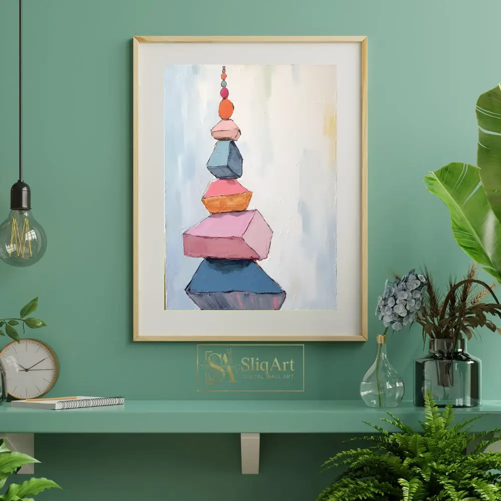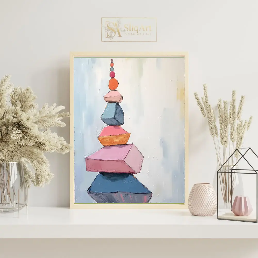 This balanced composition, reminiscent of a modern stone cairn, brings a sense of playful stability and contemporary sophistication to any wall. The neutral, textured background ensures the vibrant colors and structured shapes remain the central focal point of the room.
