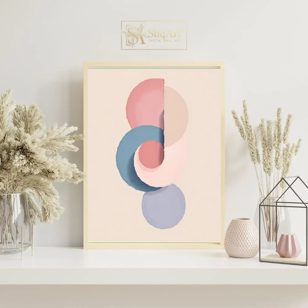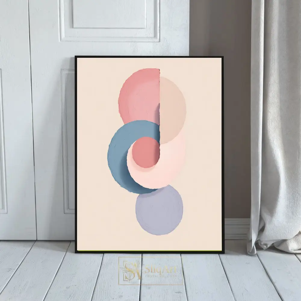 This captivating piece features a series of overlapping circles and semicircles in a harmonious palette of dusty rose, slate blue, and soft lavender. The texture mimics the thick application of paint with a palette knife, adding a tactile dimension to the minimalist composition.