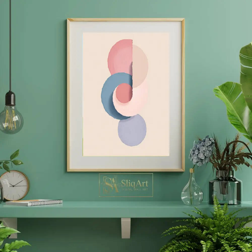 Set against a warm cream background, the interplay of shapes creates a sense of rhythmic balance and calm. It’s a perfect example of contemporary geometric abstraction that blends soft colors with bold forms, making it an ideal choice for a sophisticated interior.