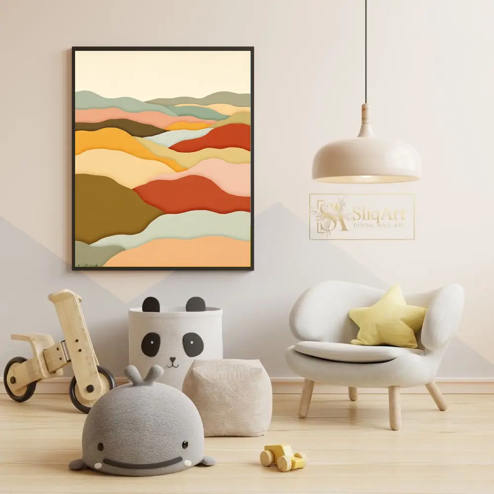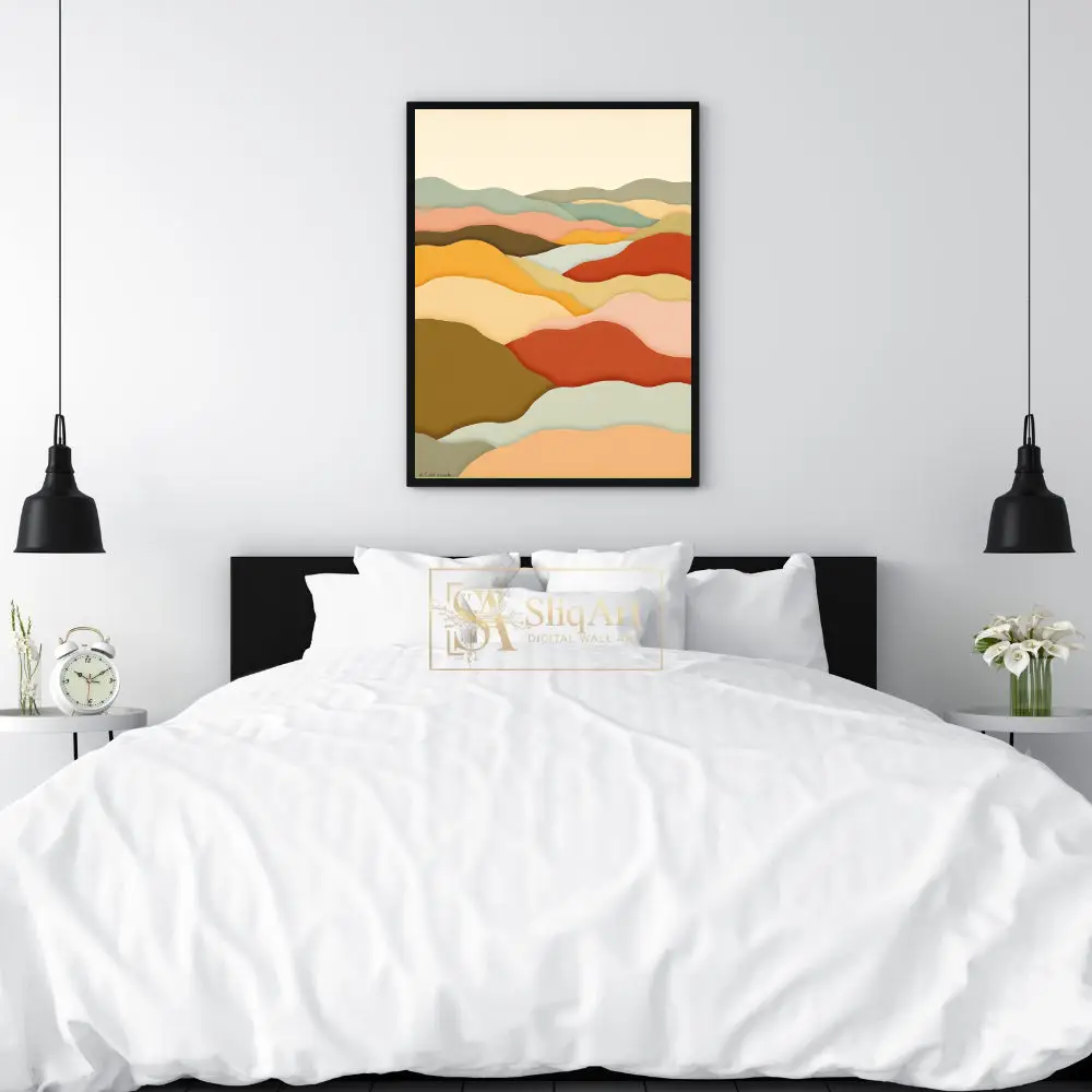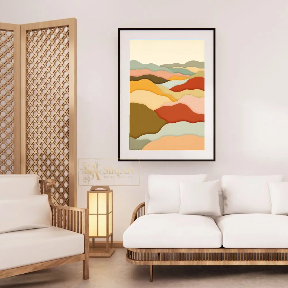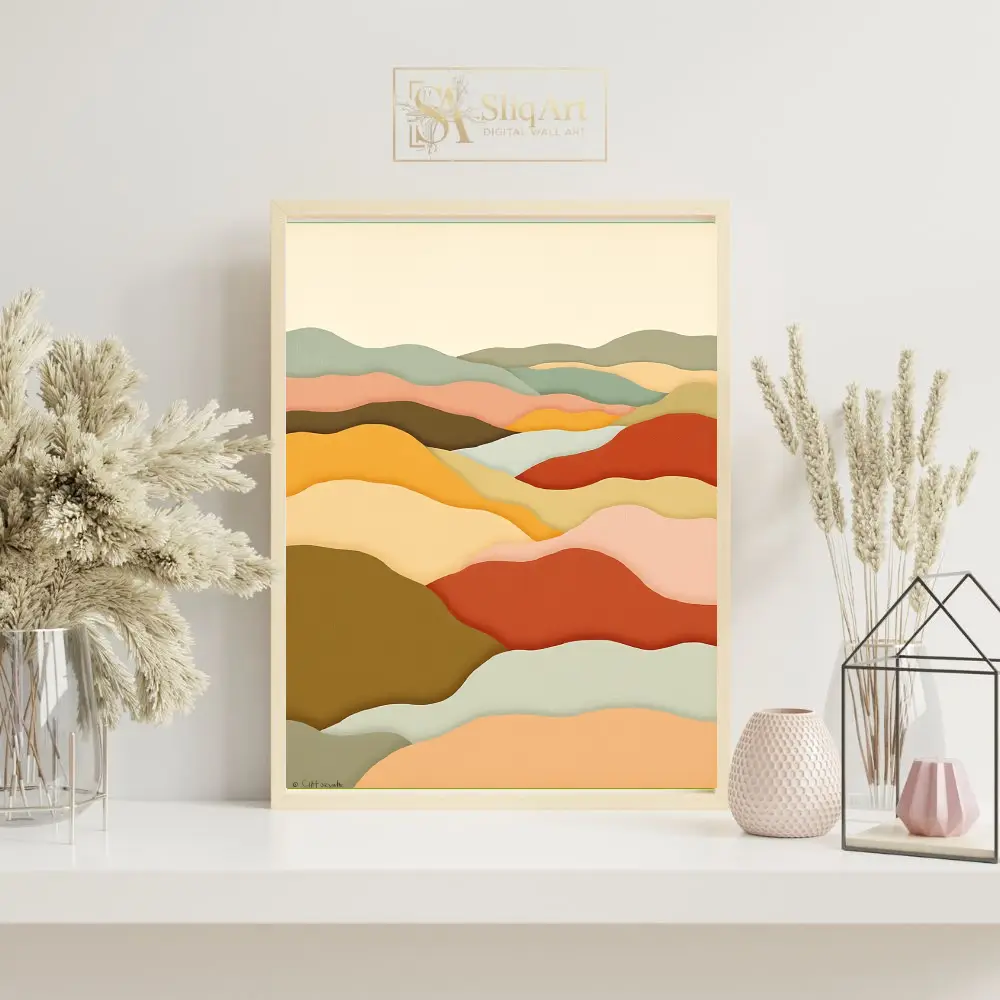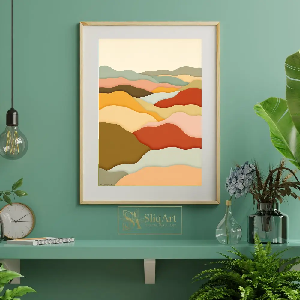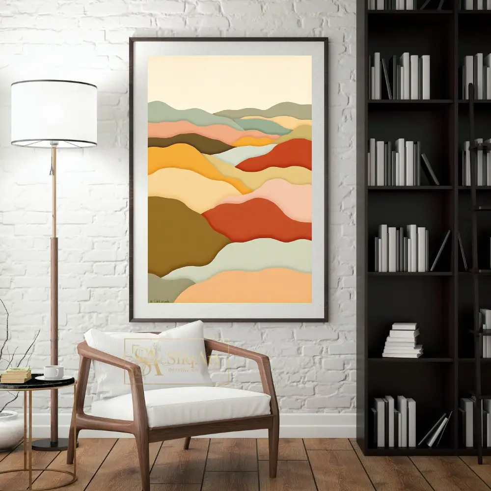 Elevate your interior design with this stunning abstract landscape featuring layered, organic shapes that evoke the tranquil essence of rolling hills.