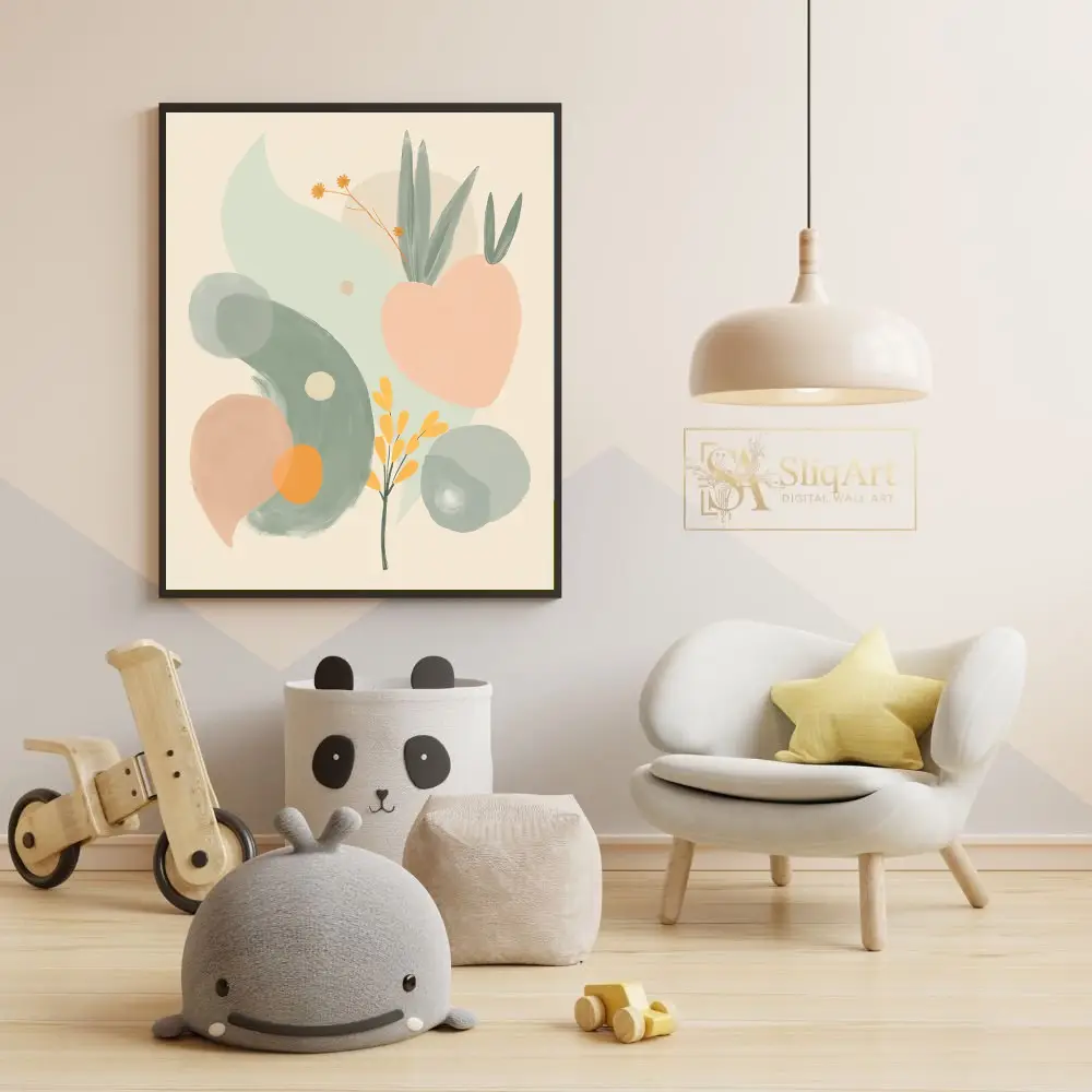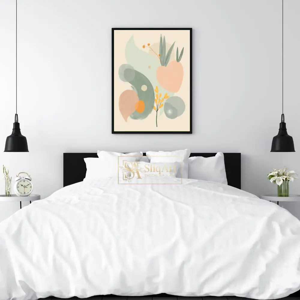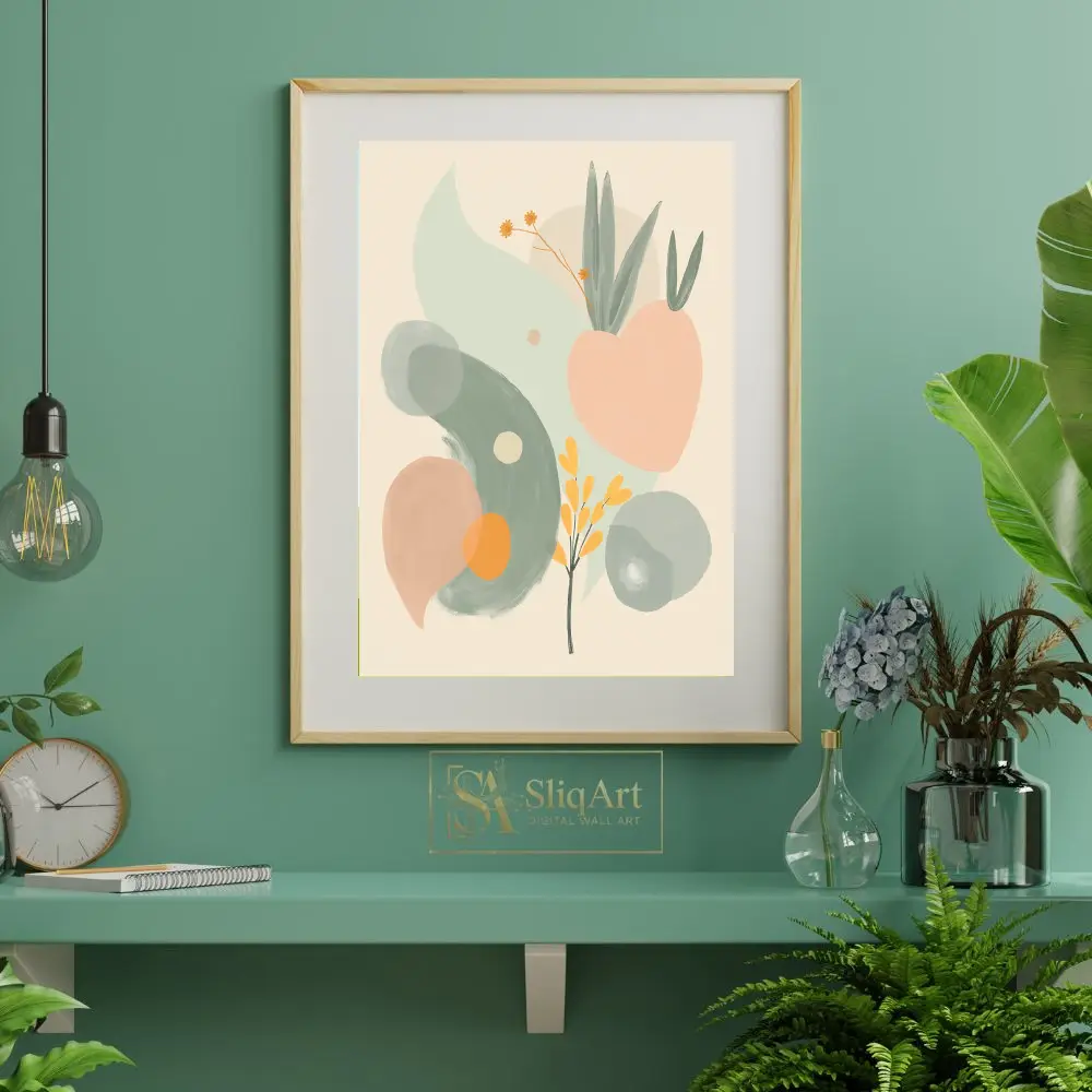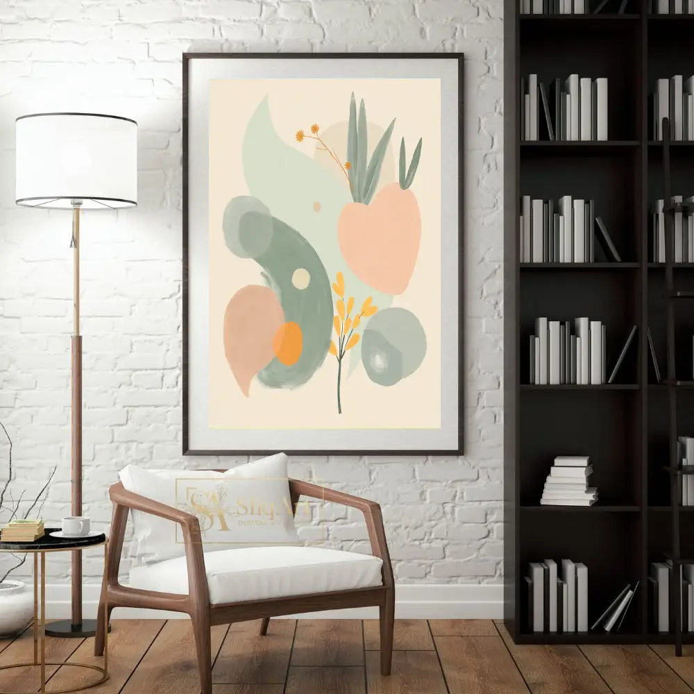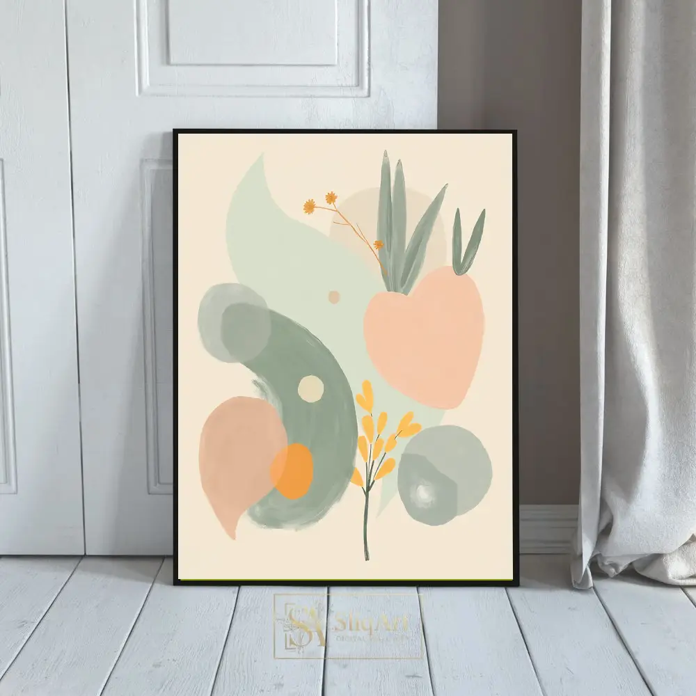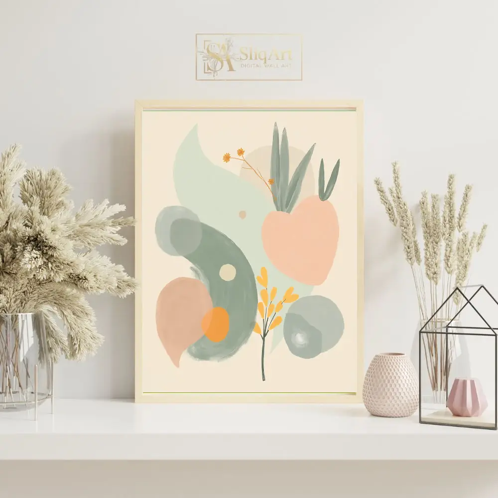A harmonious palette of sage green, soft peach, and mustard yellow creates a calming atmosphere, while the minimalist background allows the fluid forms to breathe. This piece bridges the gap between contemporary abstraction and natural beauty, making it a versatile addition to any curated home collection.