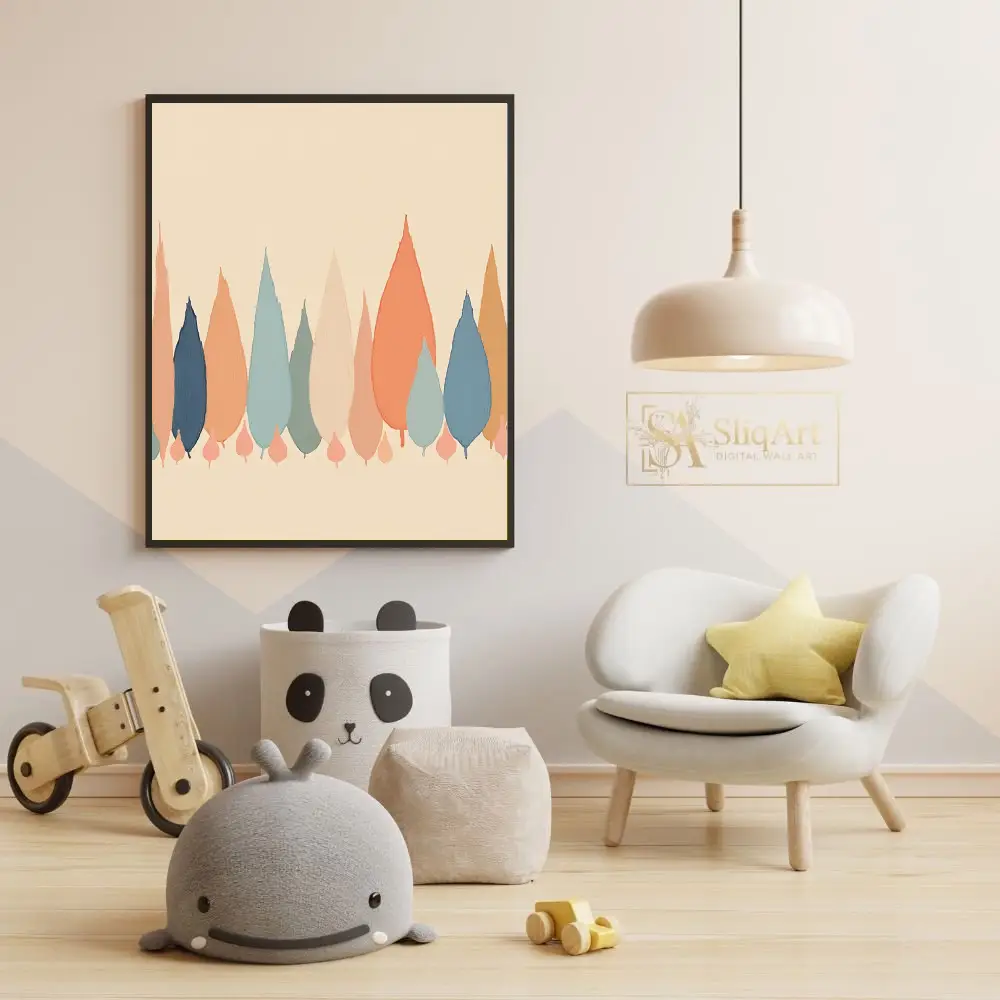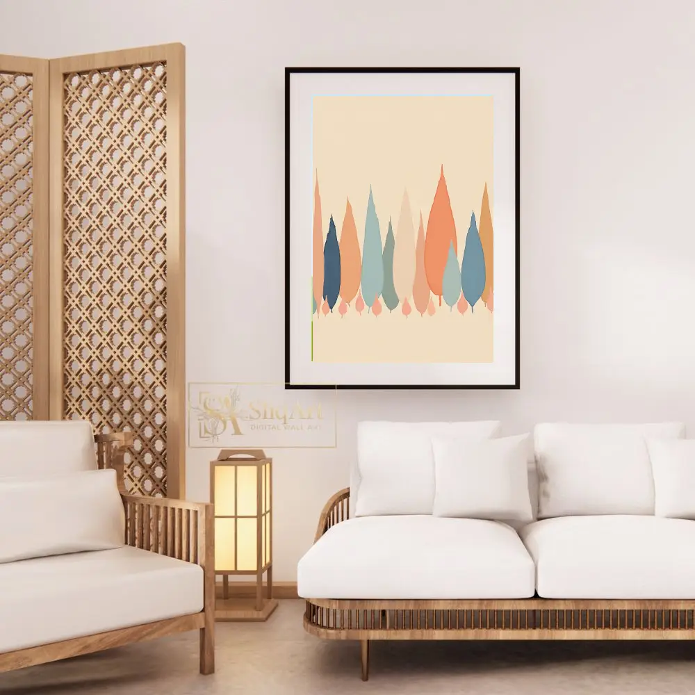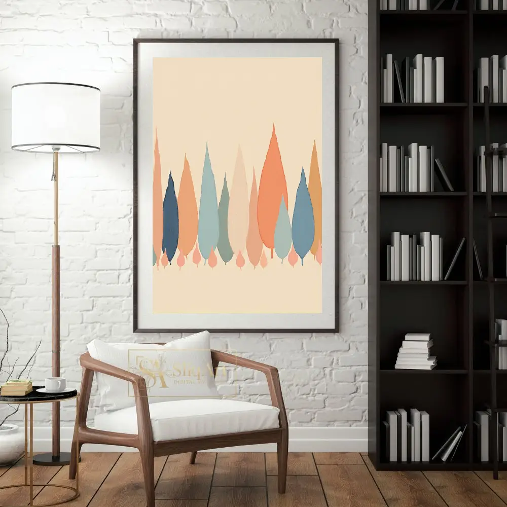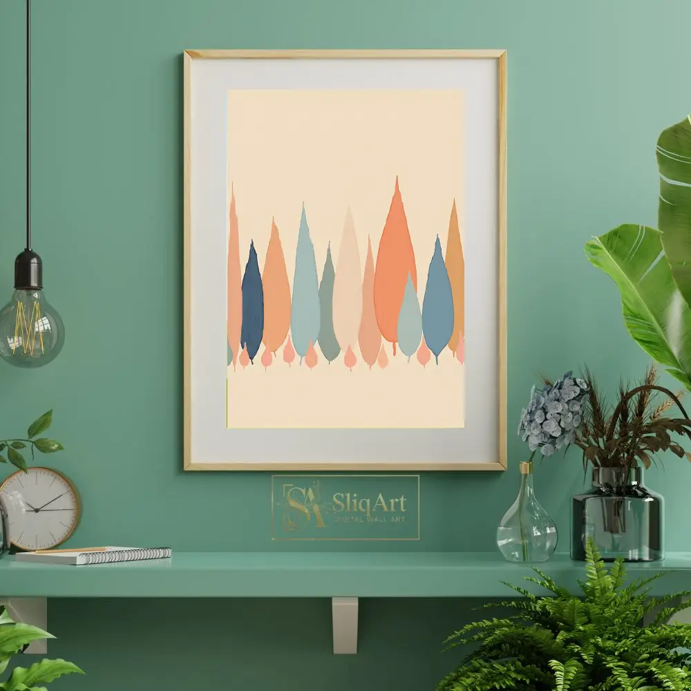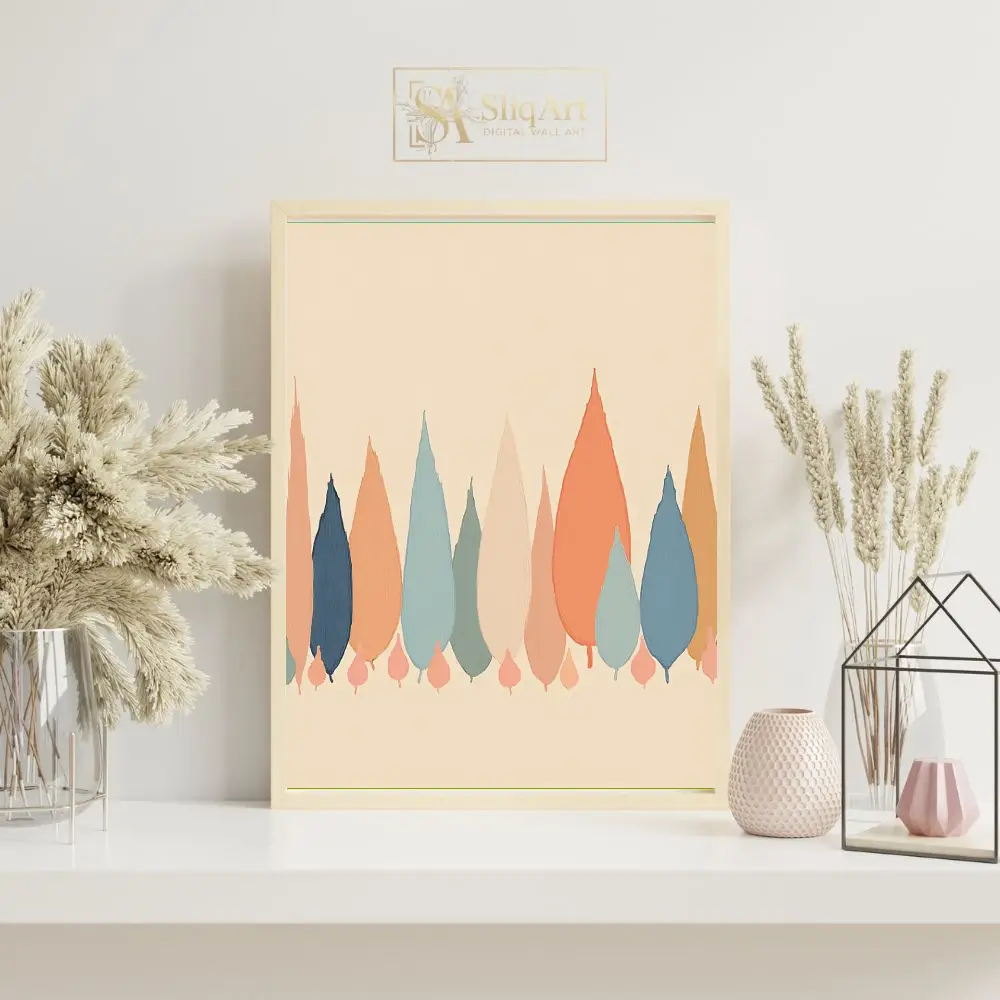 This captivating abstract piece features a row of stylized, leaf-like silhouettes that evoke a serene, minimalist forest. Rendered in a sophisticated palette of terracotta, muted teal, deep navy, and warm ochre, the artwork utilizes visible brushstroke textures to create depth and movement.
