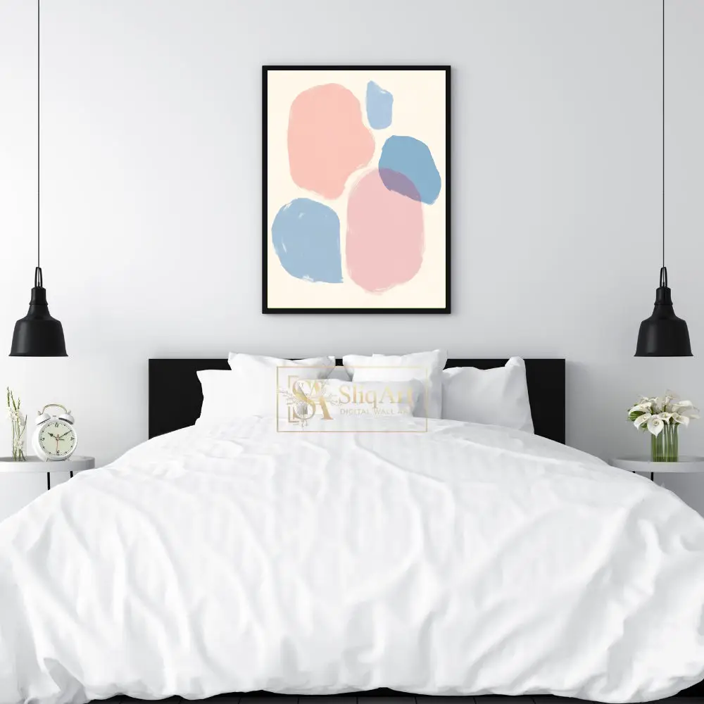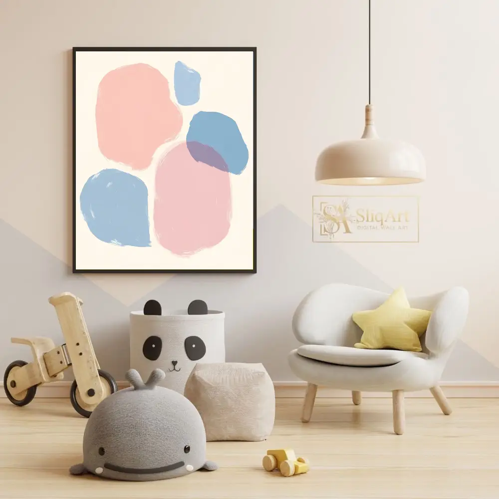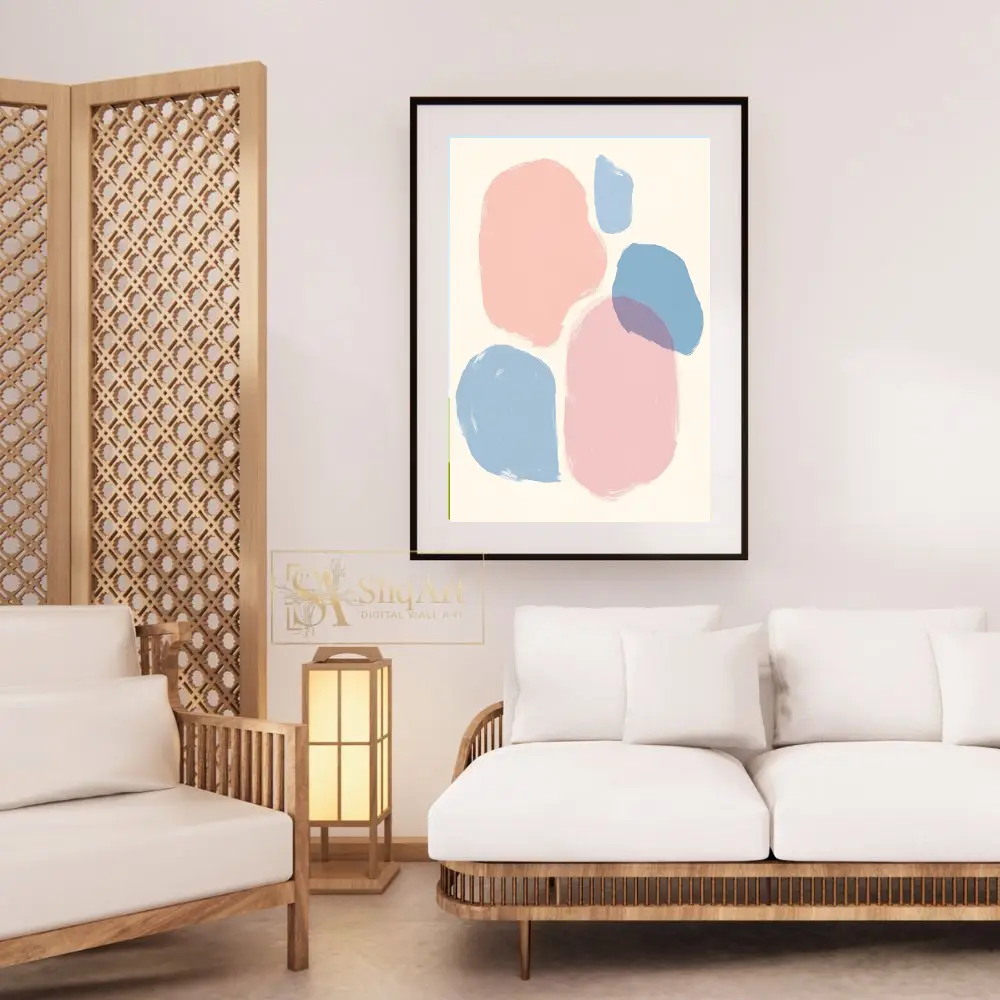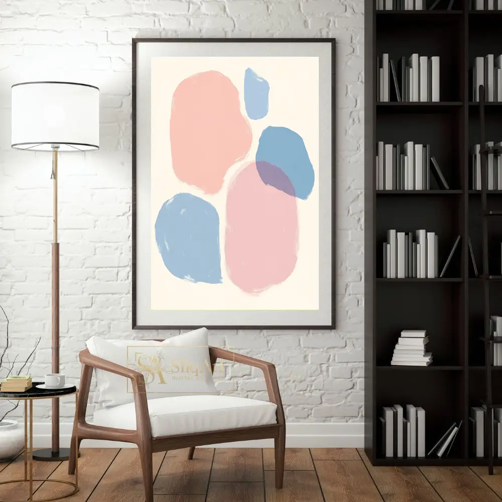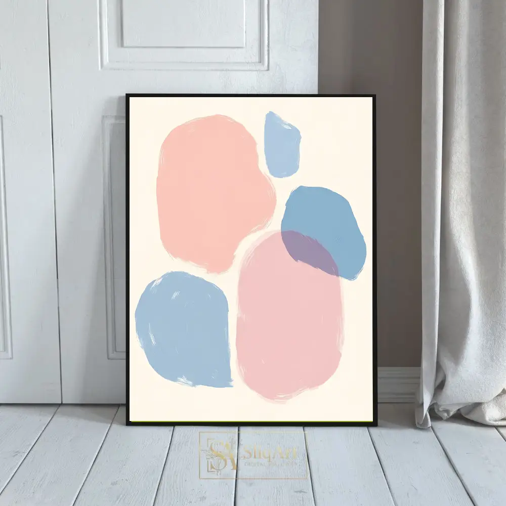 Infuse your space with tranquility using this minimalist abstract art piece. Featuring large, organic shapes in soft blush pink and powder blue, this composition celebrates simple forms and a soothing color palette.