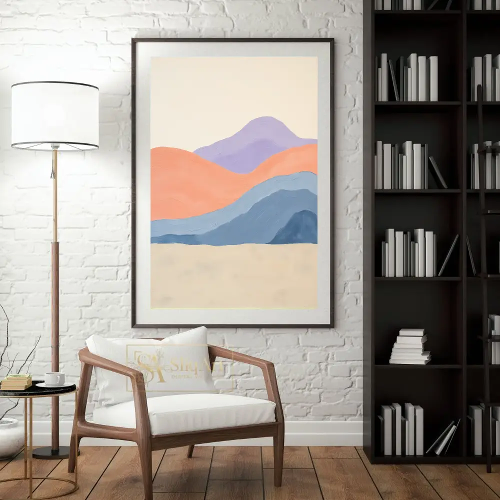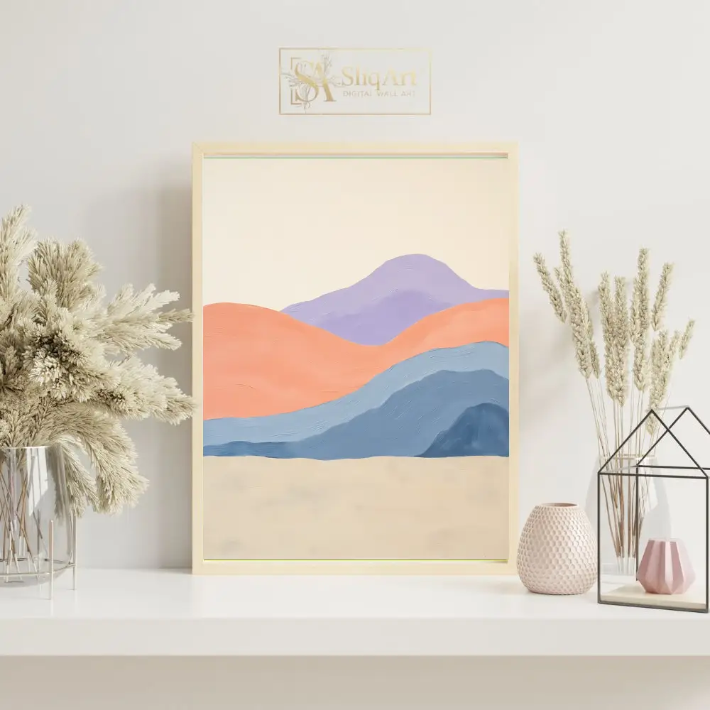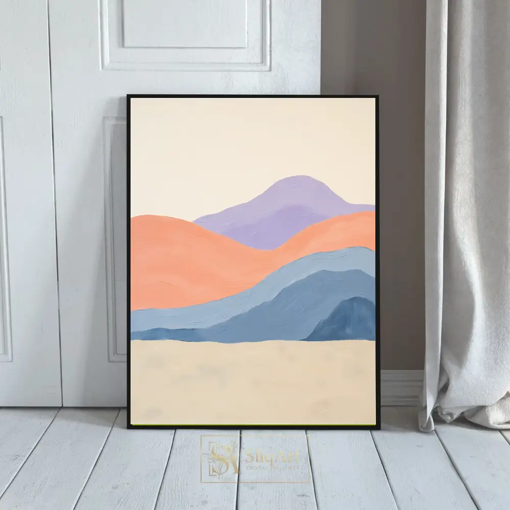 Elevate your space with this captivating abstract landscape, featuring soft, rolling hills in a palette of soothing lavender, warm coral, and deep blues.