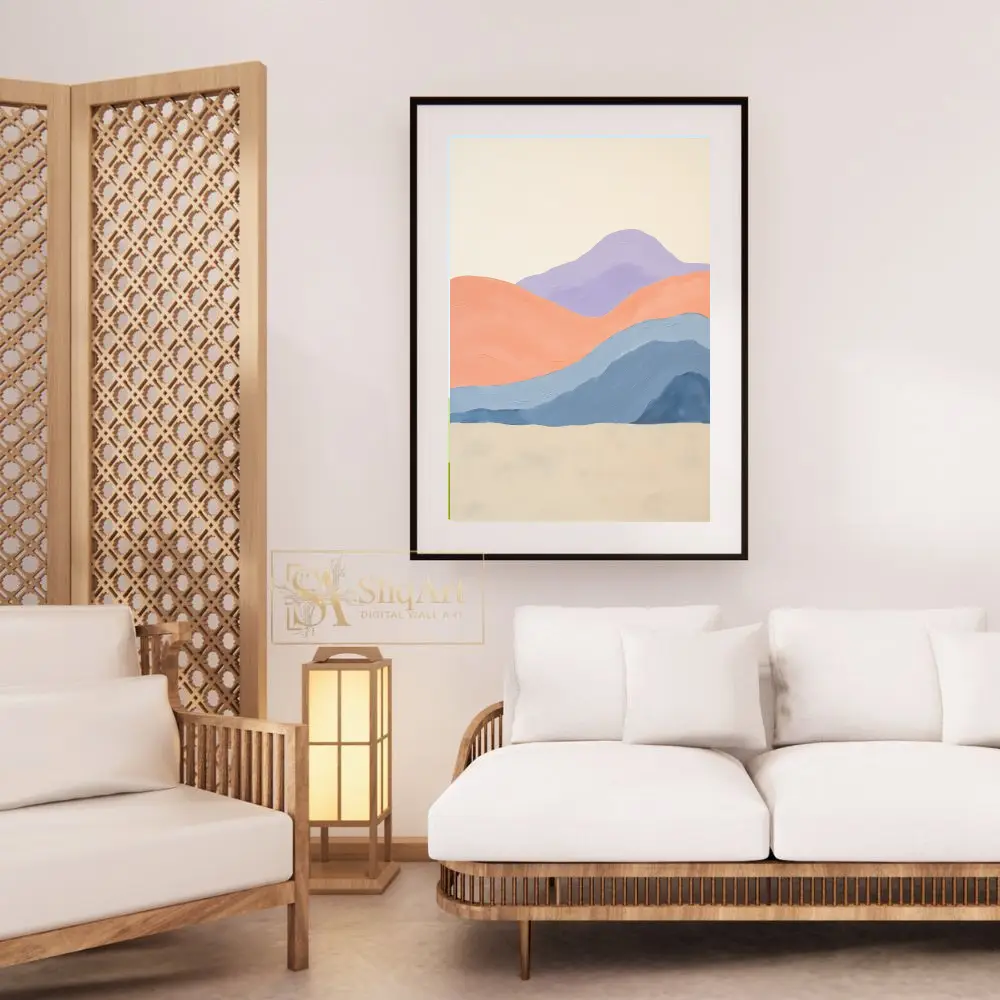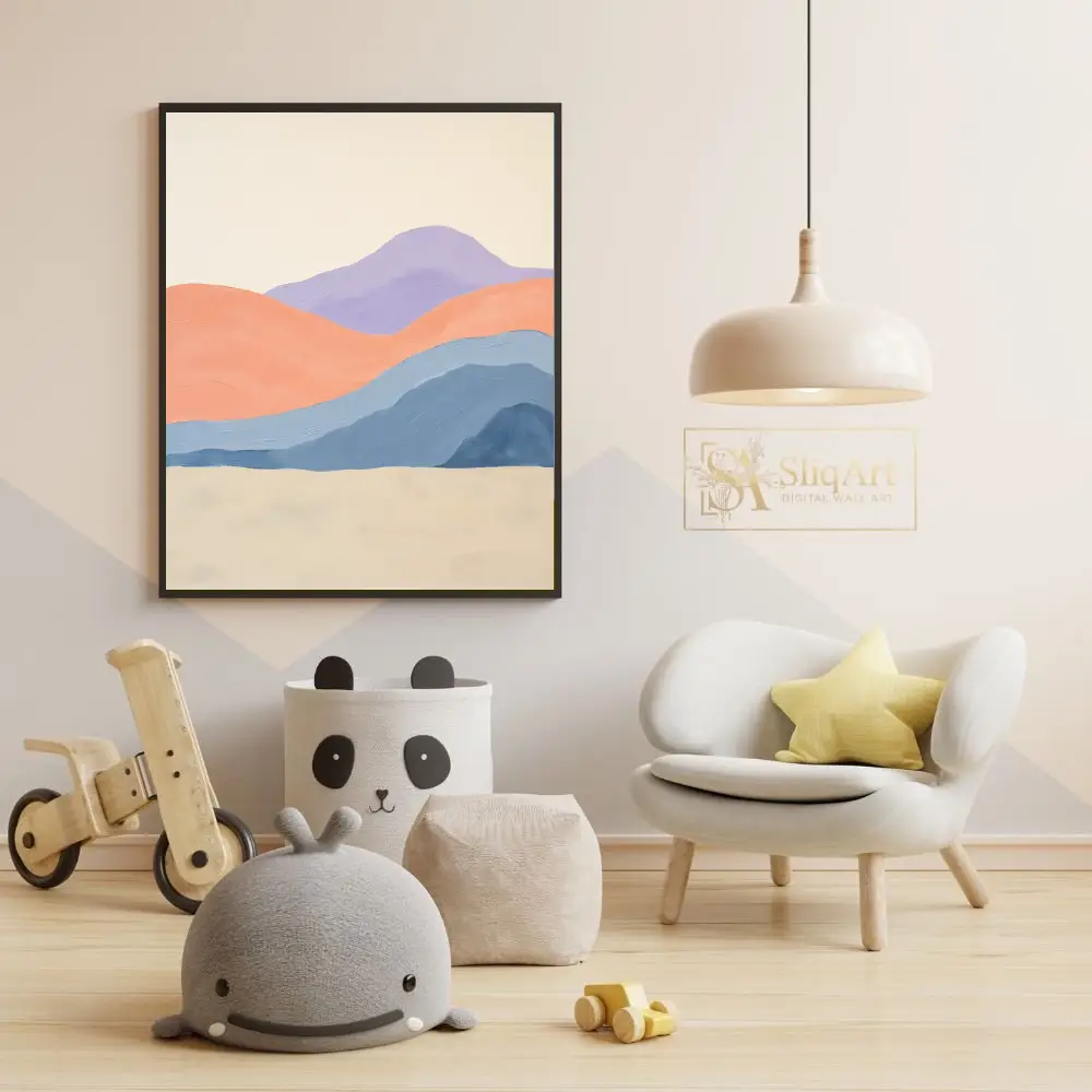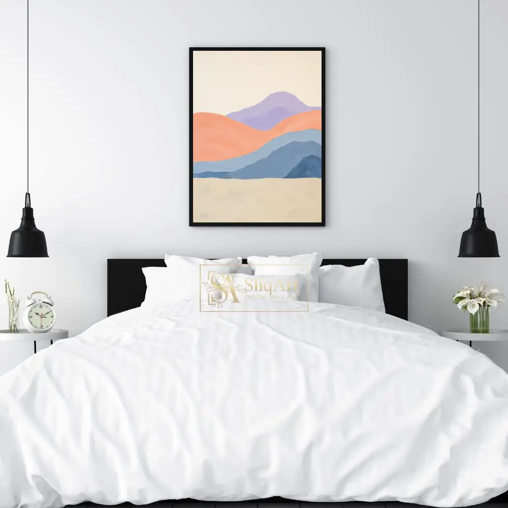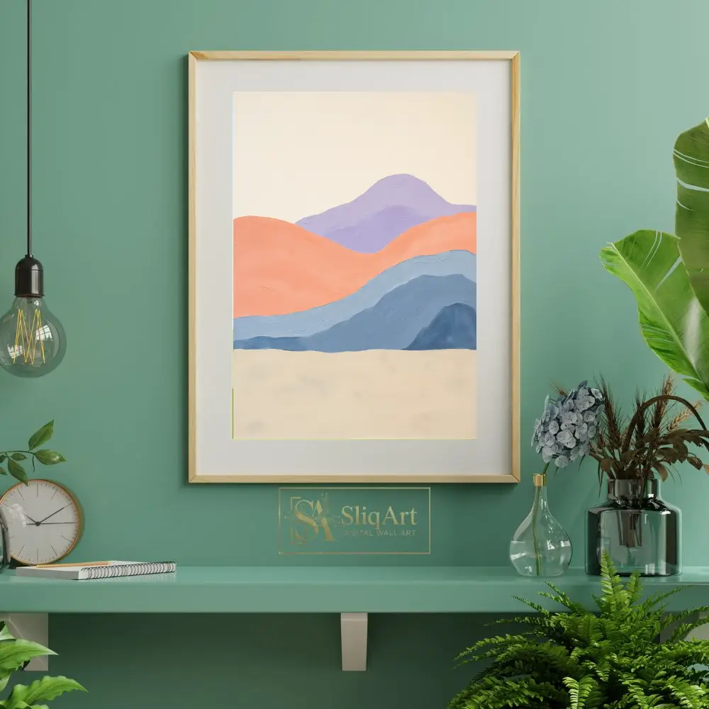 Elevate your space with this captivating abstract landscape, featuring soft, rolling hills in a palette of soothing lavender, warm coral, and deep blues.