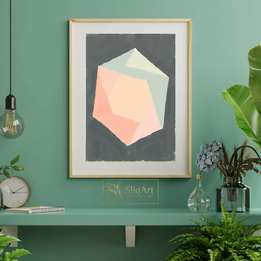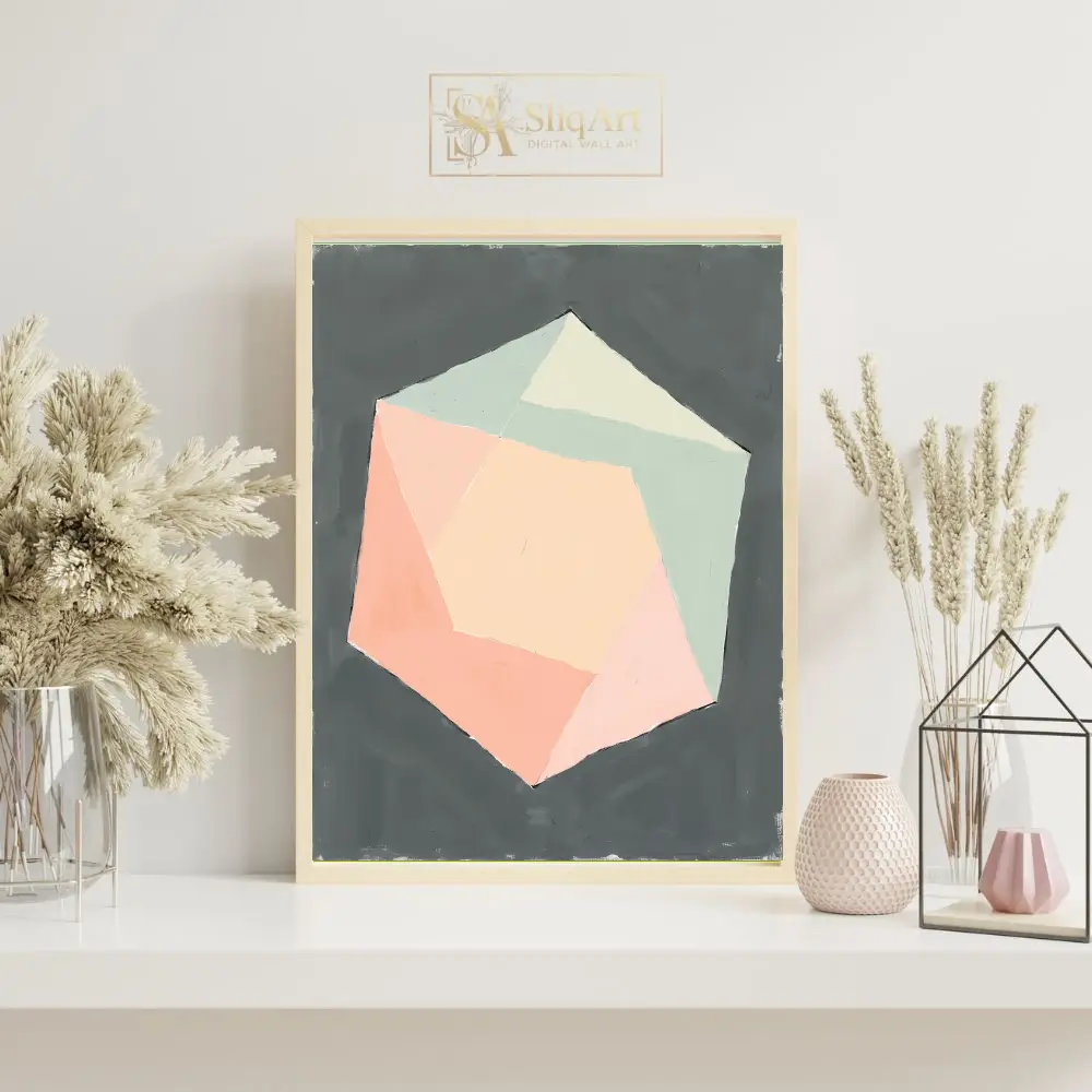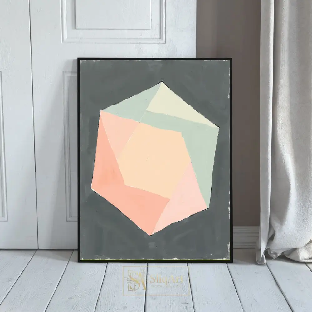 Elevate your contemporary interior with this striking abstract piece, featuring a multi-faceted geometric prism in soft pastel tones. The composition showcases a delicate balance of blush pink, warm peach, and cool mint green facets that pop against a deep charcoal grey background.