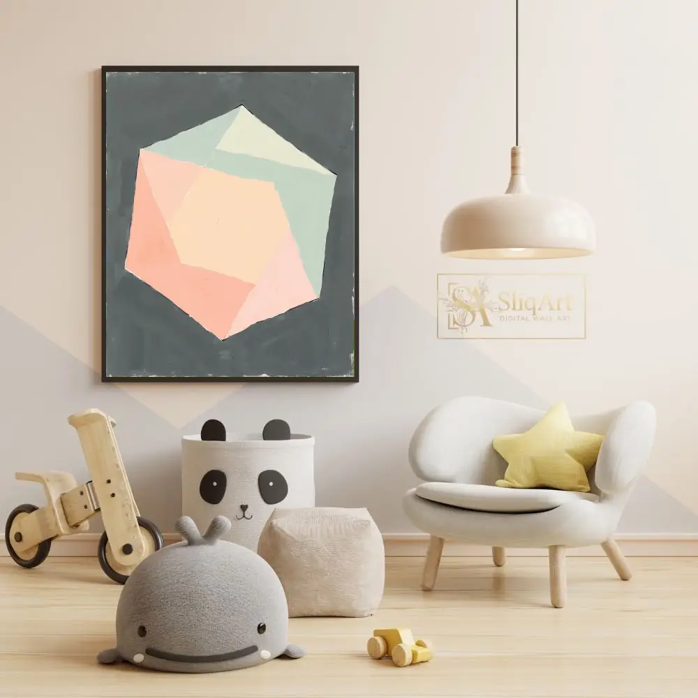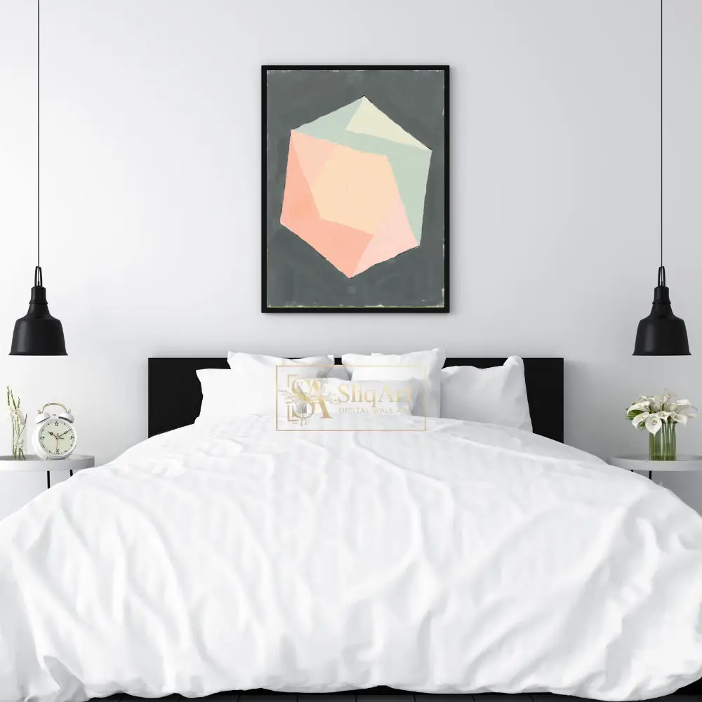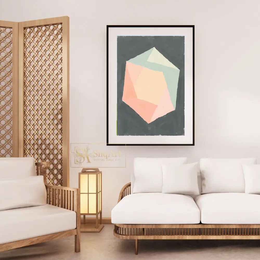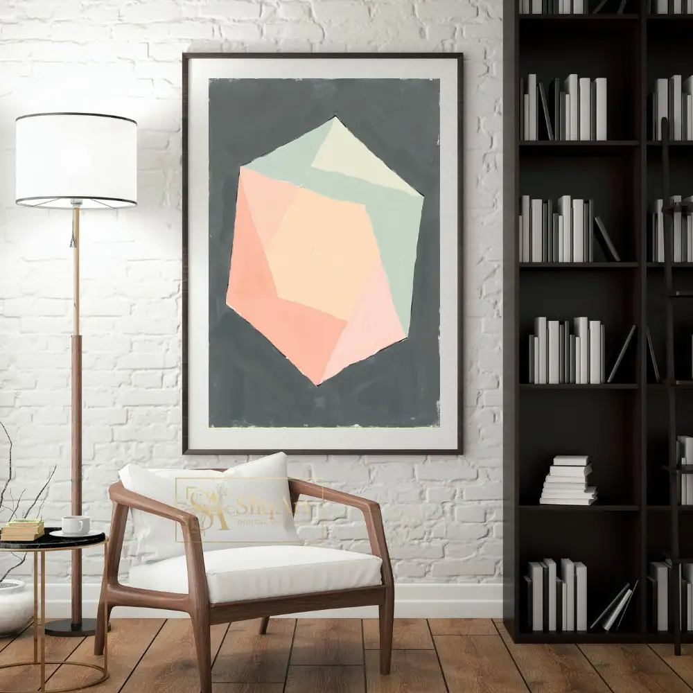 Elevate your contemporary interior with this striking abstract piece, featuring a multi-faceted geometric prism in soft pastel tones. The composition showcases a delicate balance of blush pink, warm peach, and cool mint green facets that pop against a deep charcoal grey background.