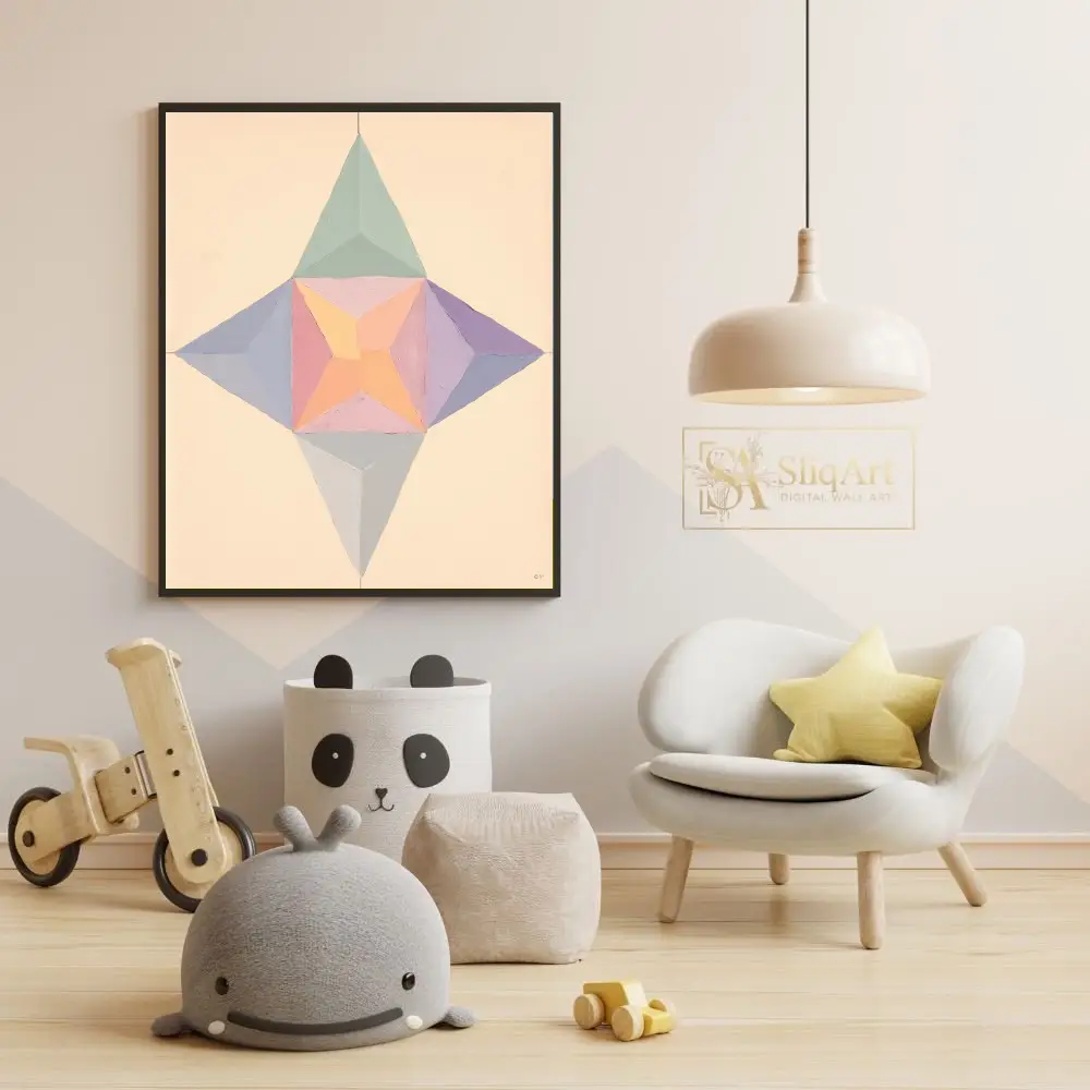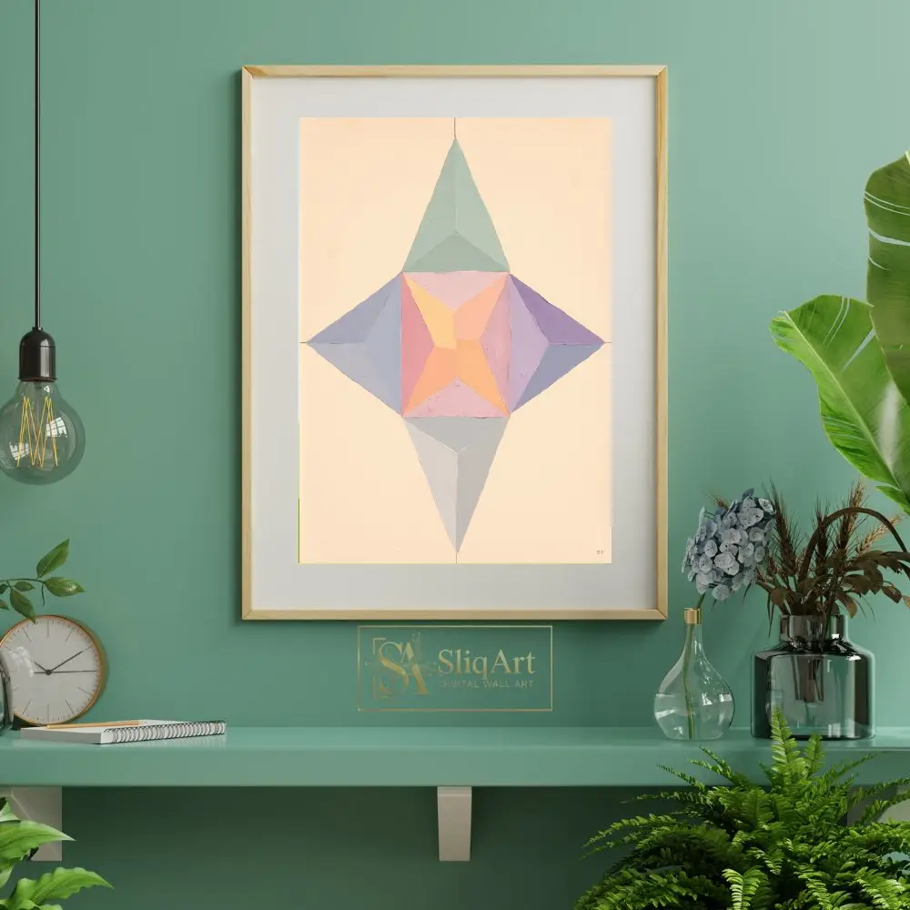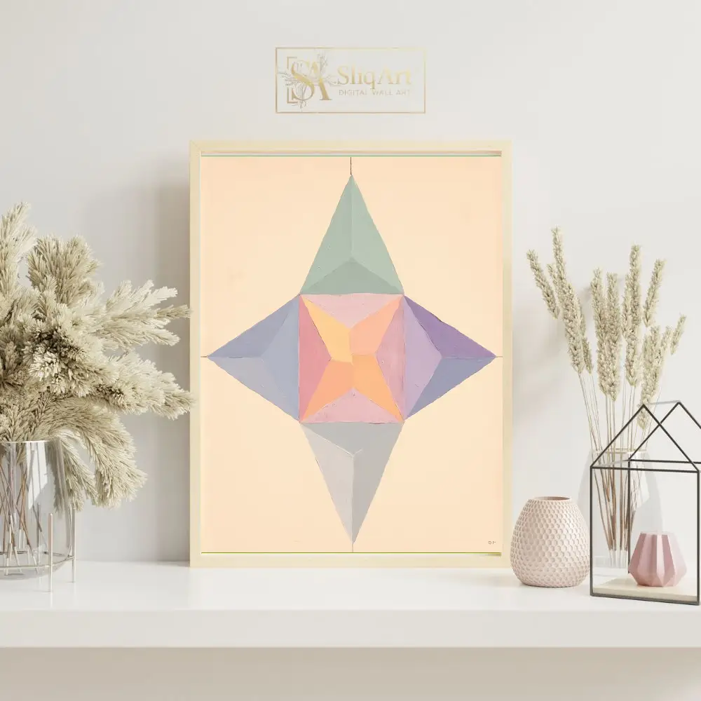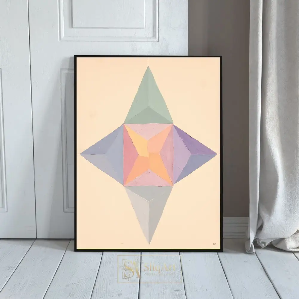 This striking abstract piece features a central, multi-faceted star or compass rose, masterfully rendered in a soothing pastel palette. The composition utilizes geometric triangles to create a sense of depth and dimension, with shades of sage green, lavender, dusty rose, and muted peach harmonizing against a warm cream backdrop.