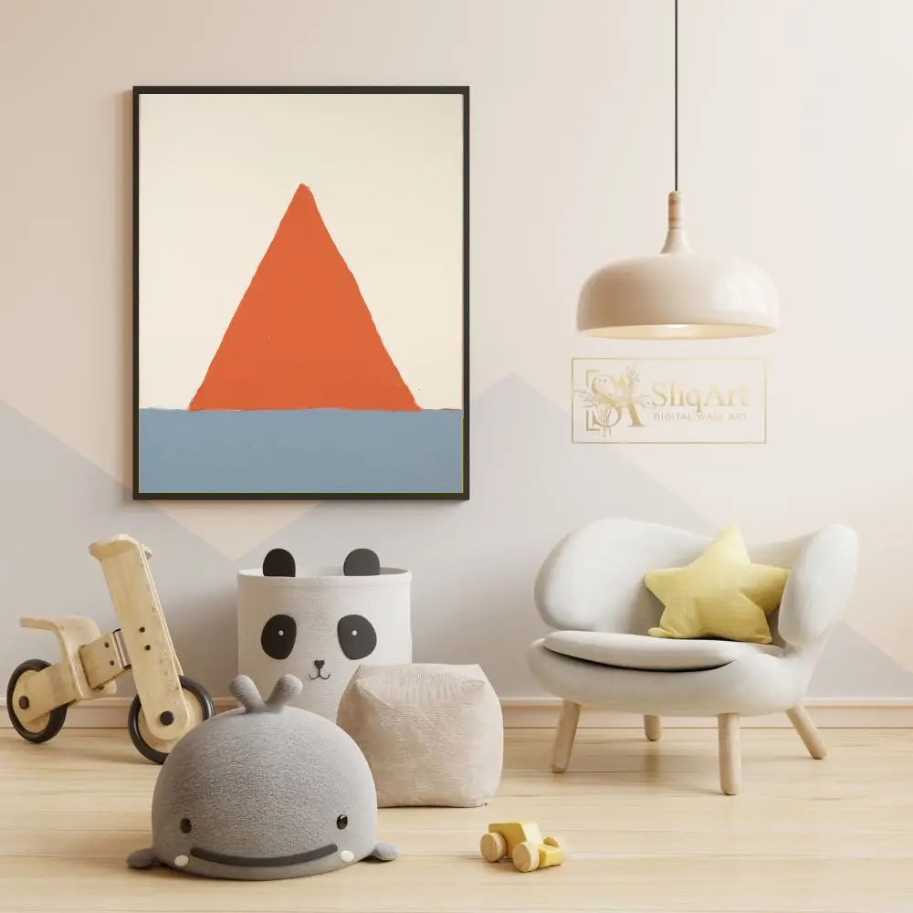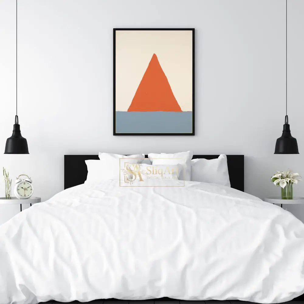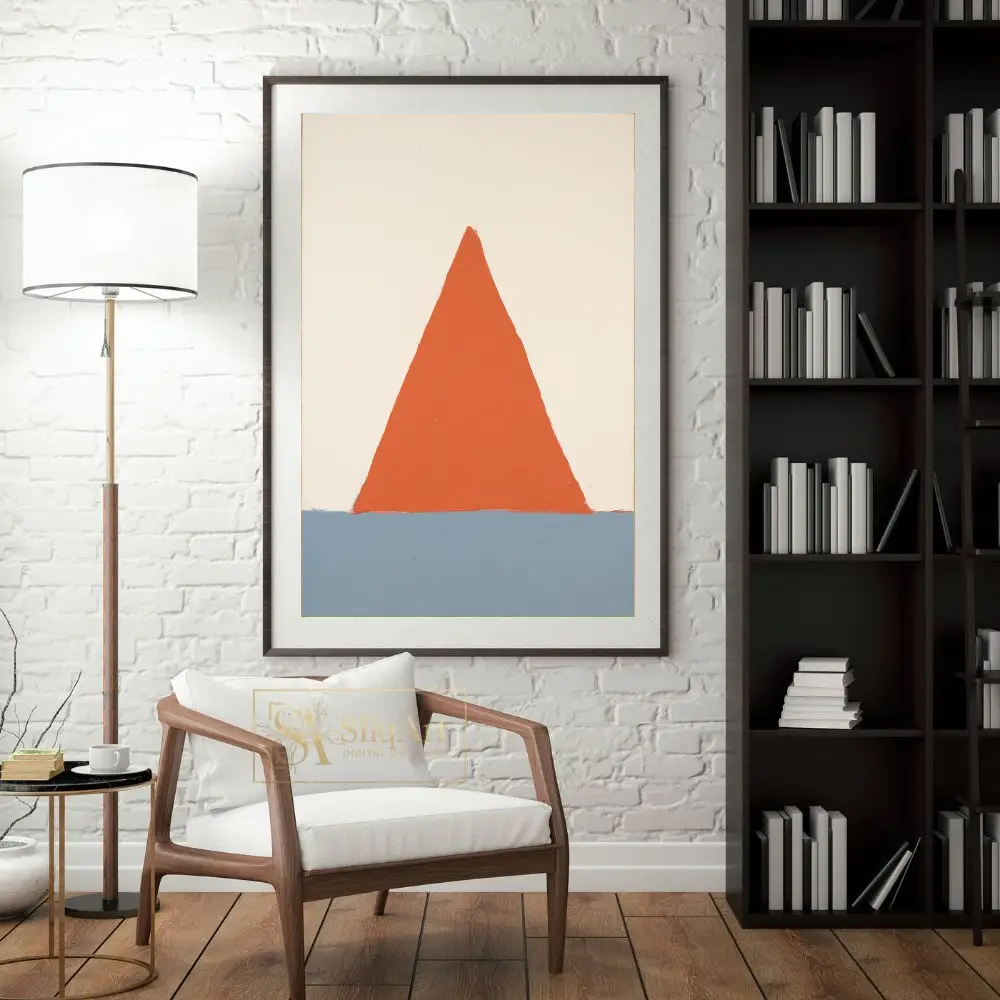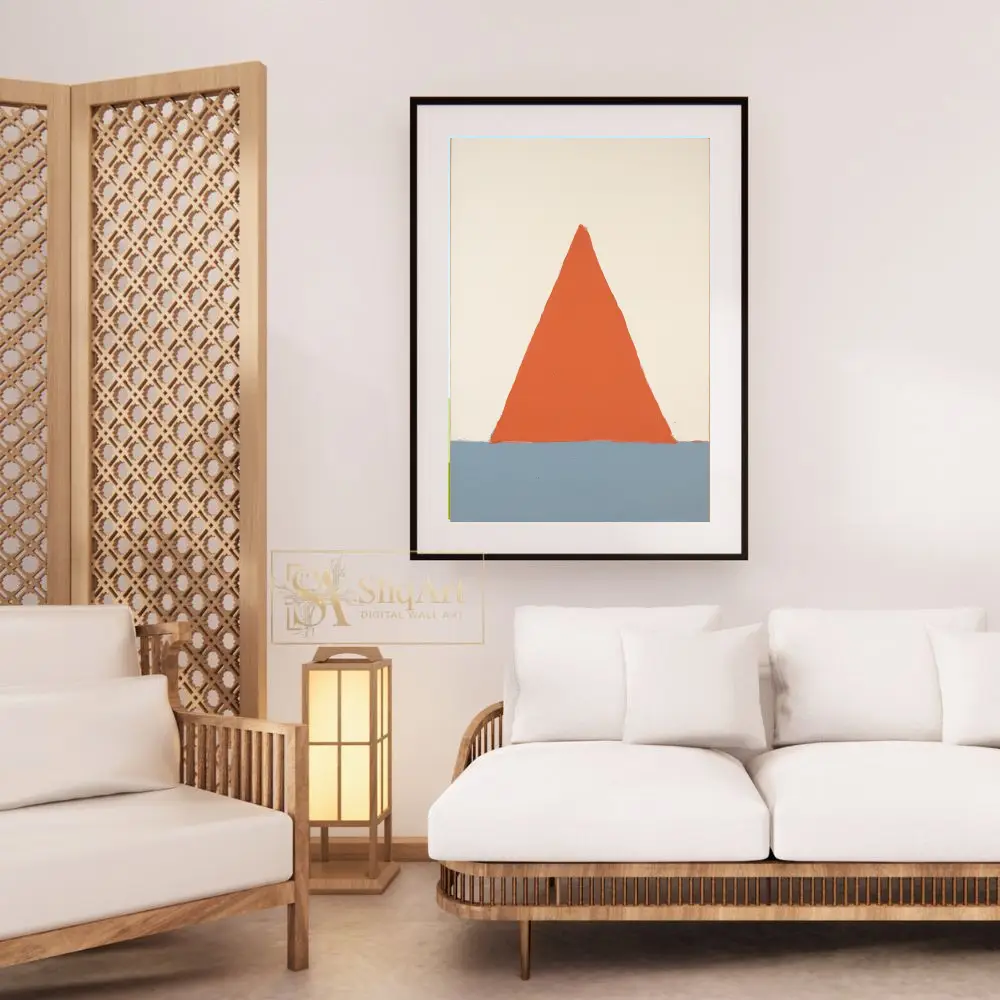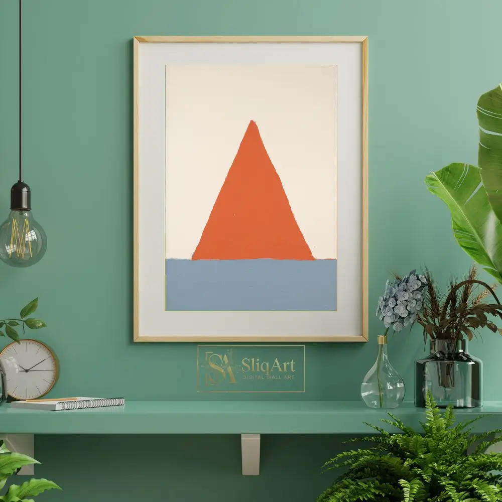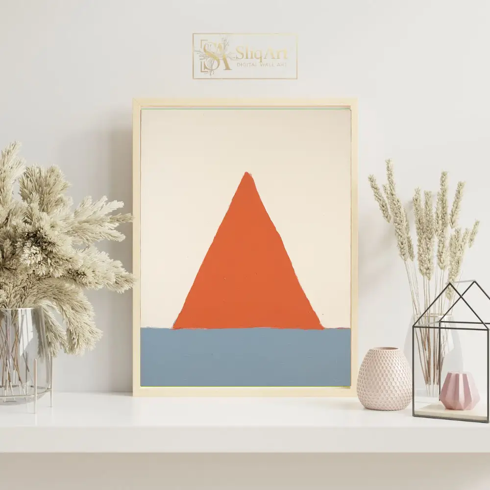 This striking minimalist piece features a bold terracotta orange triangle poised atop a serene dusty blue horizon.